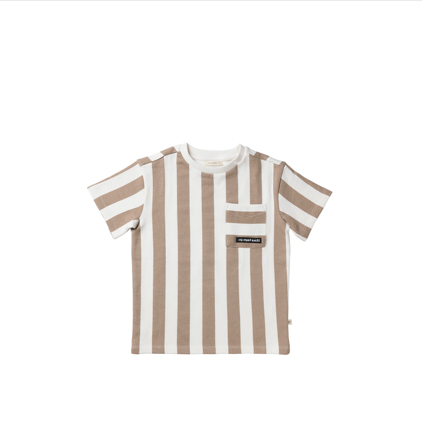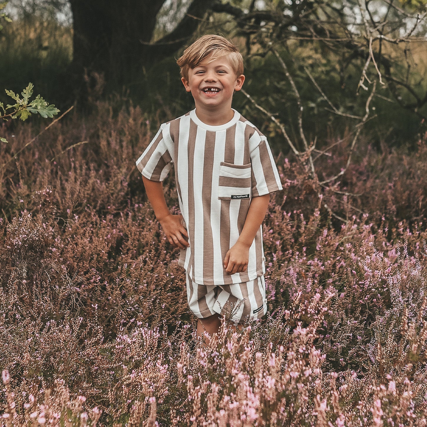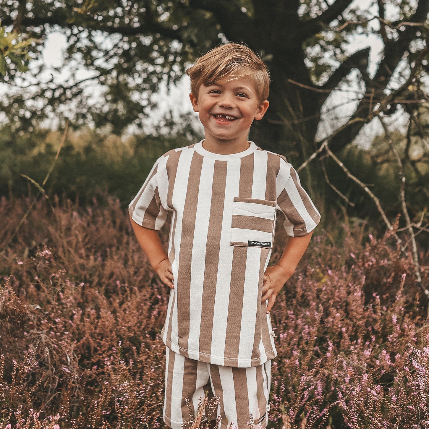 De beige basis van het shirt is voorzien van breden, opvallende strepen en heeft op de borstzak de tekst “No more rules”. Dit geeft een stoere, eigenwijze touch. Deze French Knit kwaliteit combineert het zachte gevoel van katoen met een verfijnd design, waardoor het een eyecatcher is in elke garderobe. Het Bold Stripes Oversized Tee is ideaal voor jongens die houden van trendy, casual stijl met een eigen karakter. Perfect om te dragen met de Bold Stripes Relaxed Shorts.