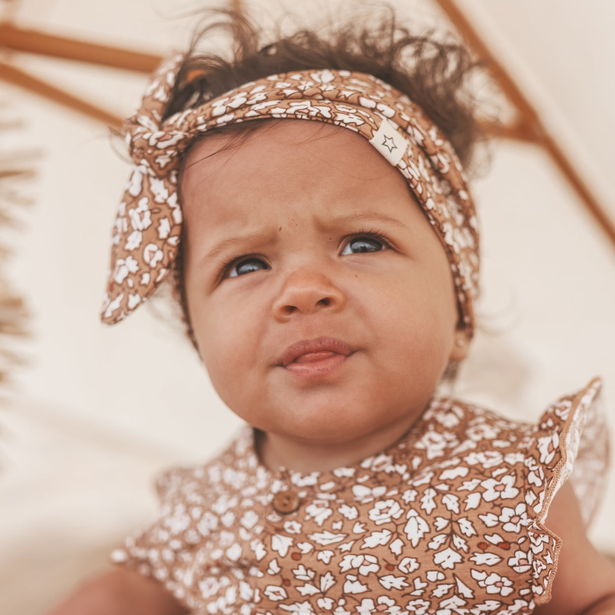Een haarband met bloemenprint in mooie zandtinten. Of je kleintje nou veel of weinig haartjes heeft, een haarband is in beide gevallen super schattig! Deze haarband is verstelbaar door middel van een knoop. Leuk voor ieder meisje om de outfit mee af te matchen.