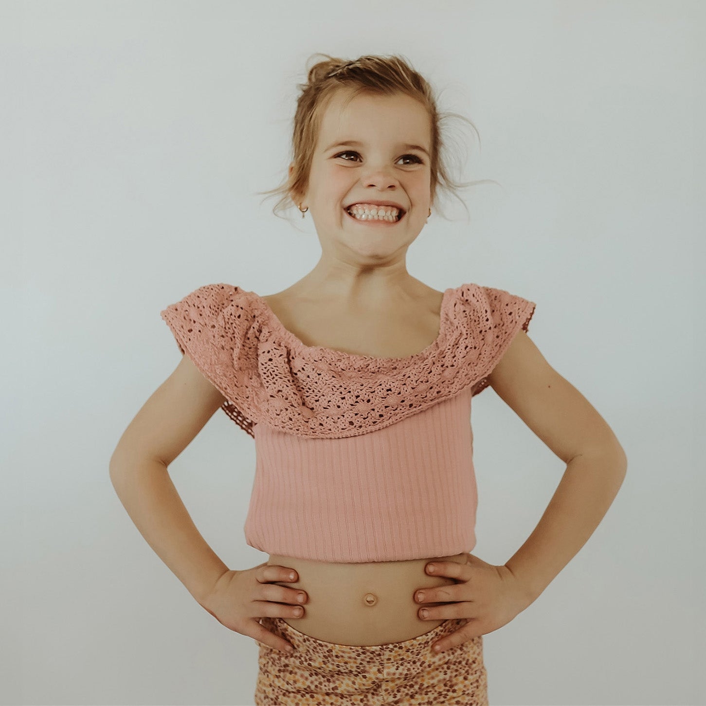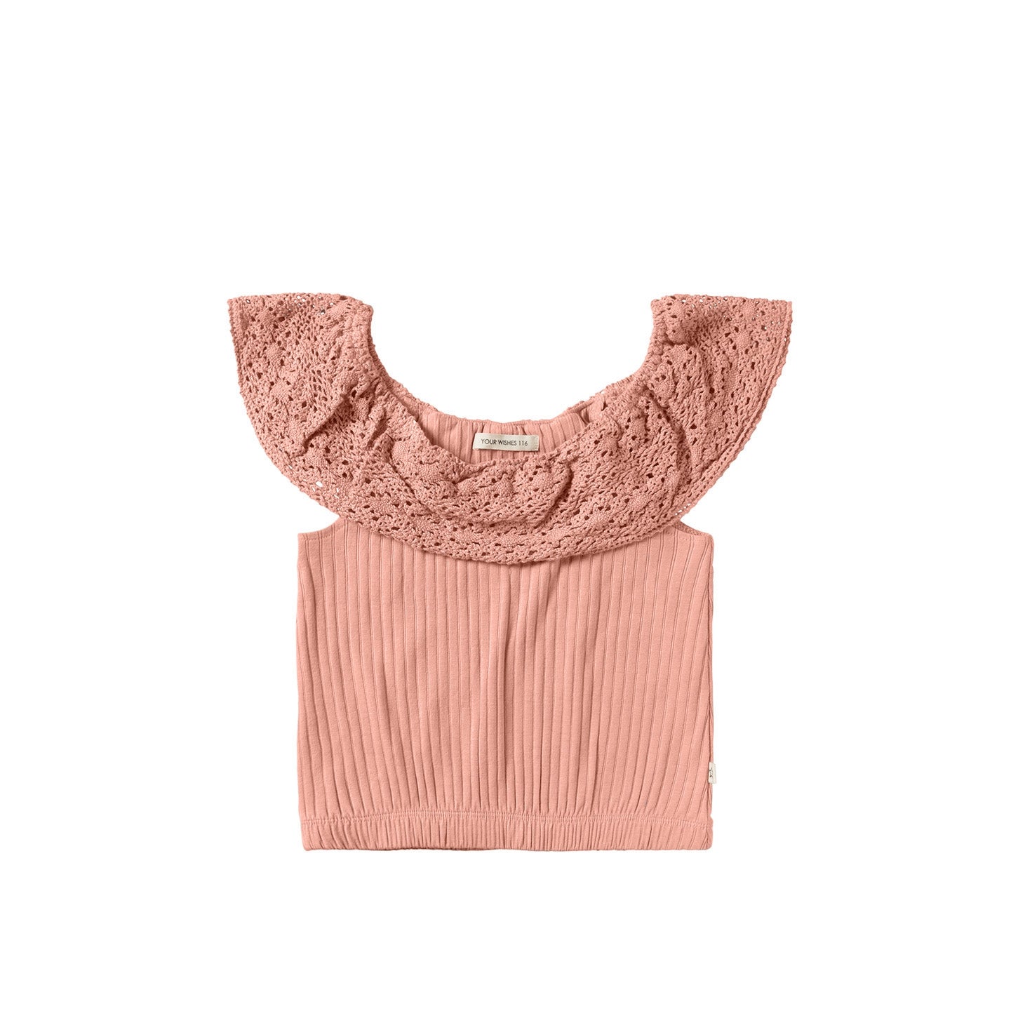 * Geripptes, kurzes Oberteil mit gehäkelten Schulterträgern.