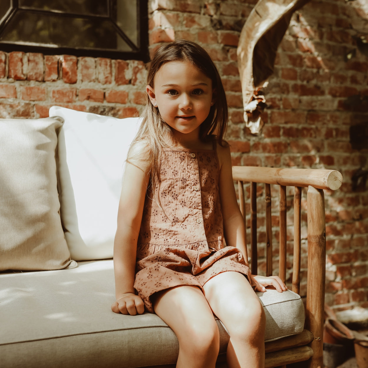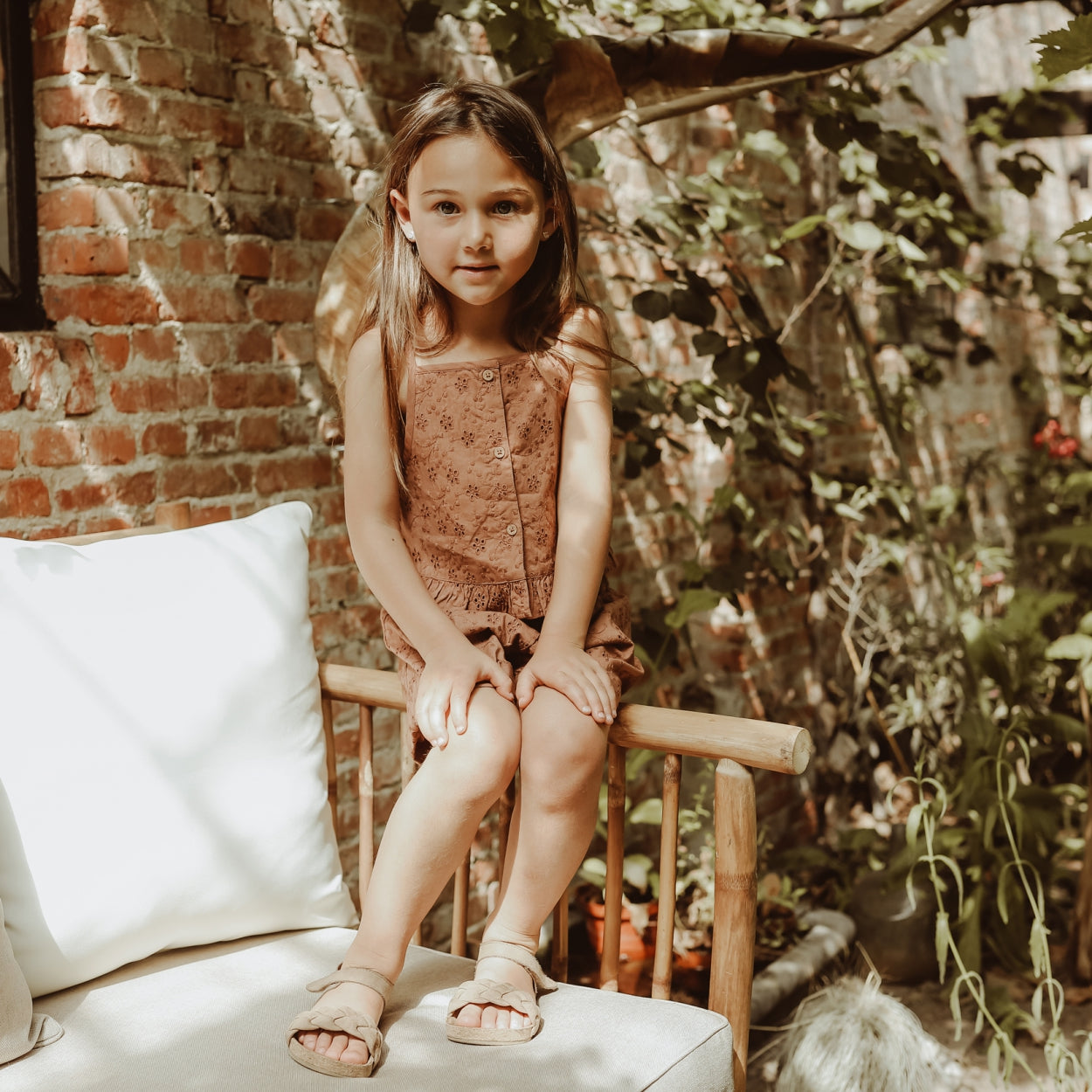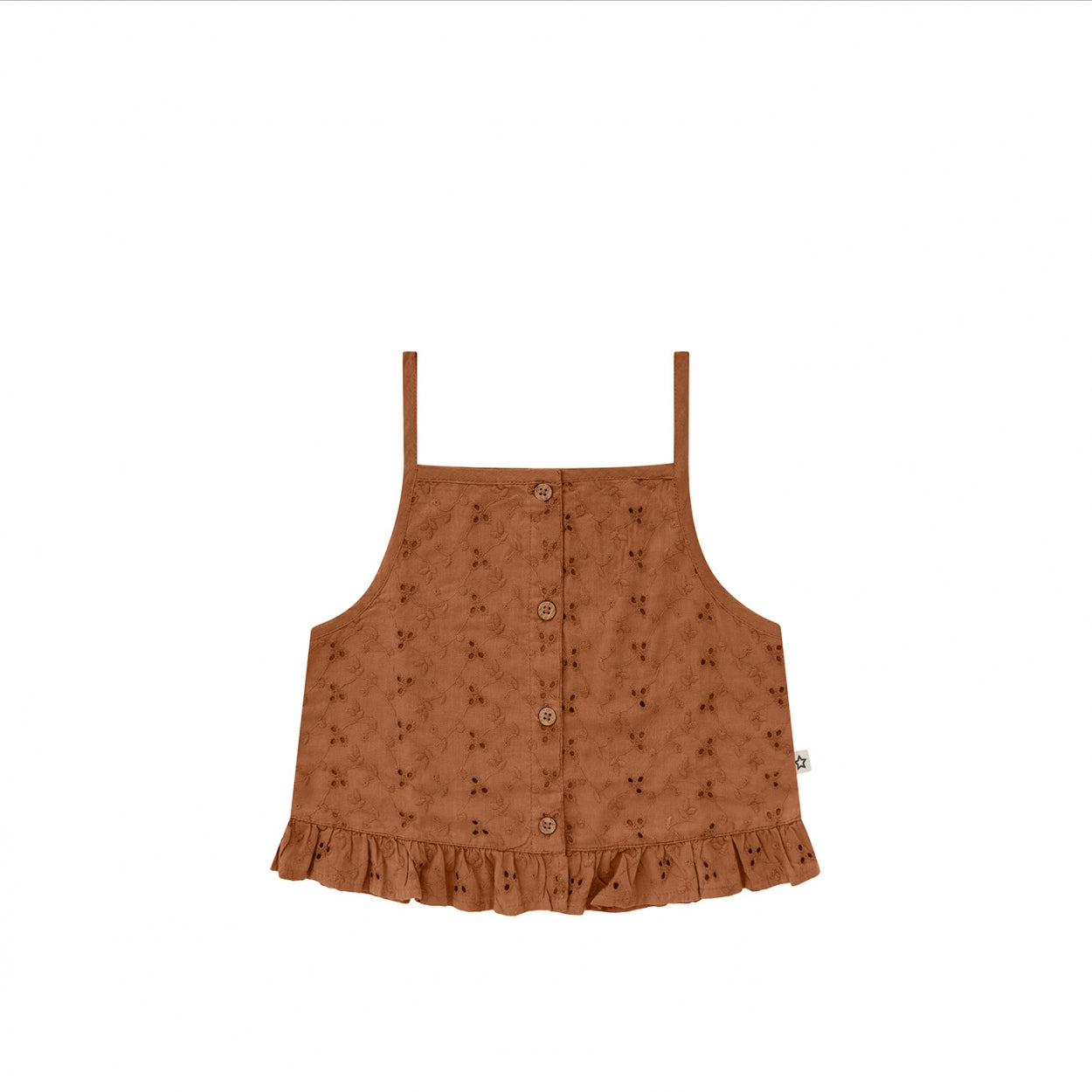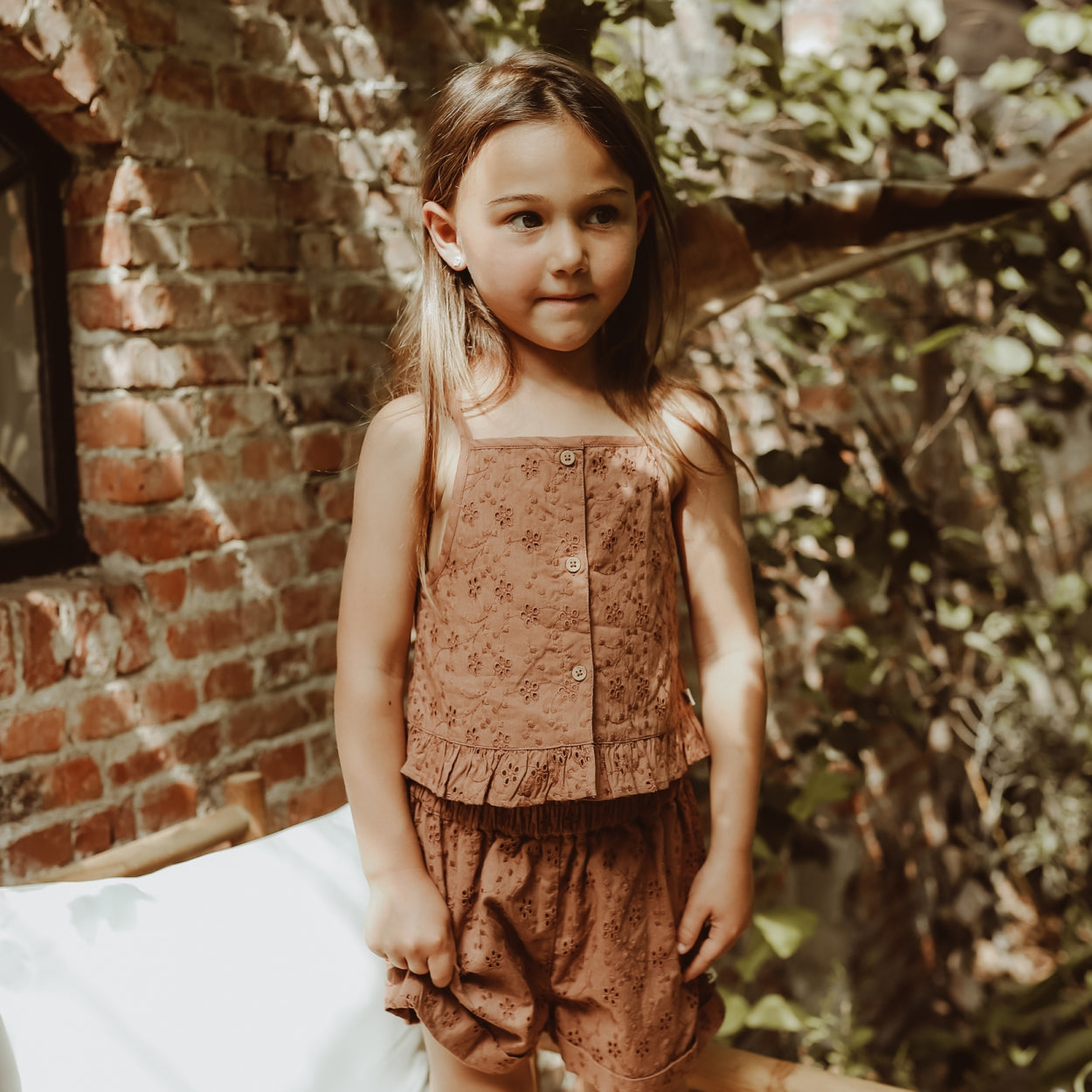 Ein kurzes Oberteil in hellbrauner Farbe. Das Oberteil hat eine gewebte Qualität mit einem gestickten Muster. Es hat dünne Schulterträger, Holzknöpfe auf der Vorderseite und Rüschen am unteren Rand. Dieses romantische Kleidungsstück lässt sich gut mit den passenden Broderie-Shorts kombinieren.