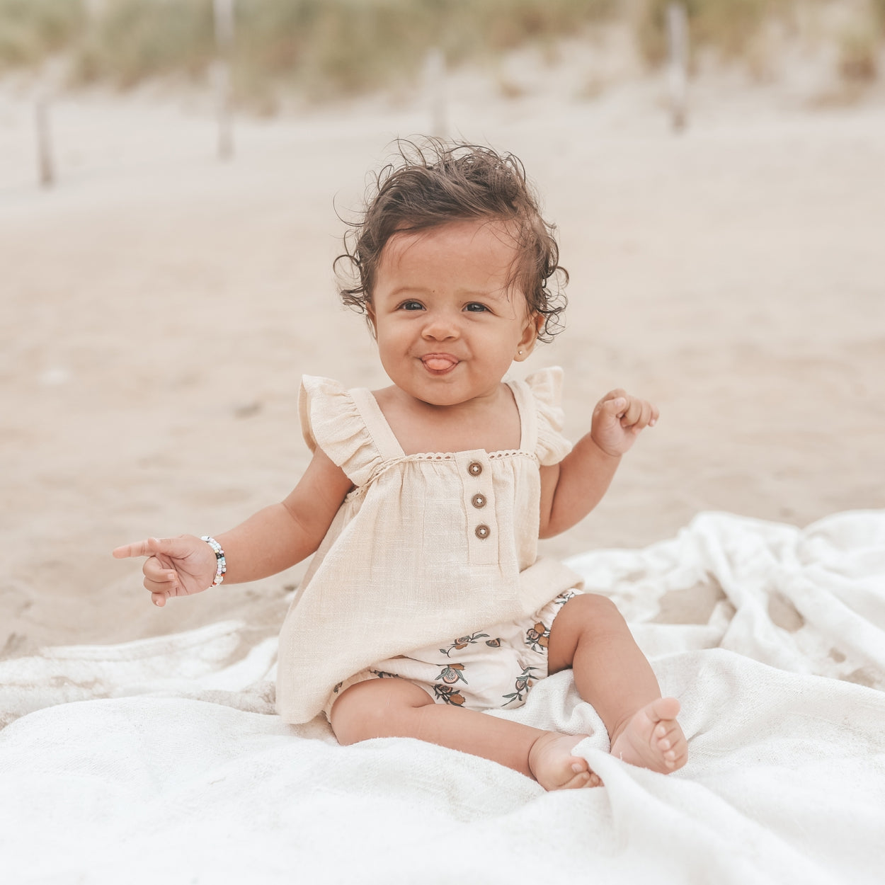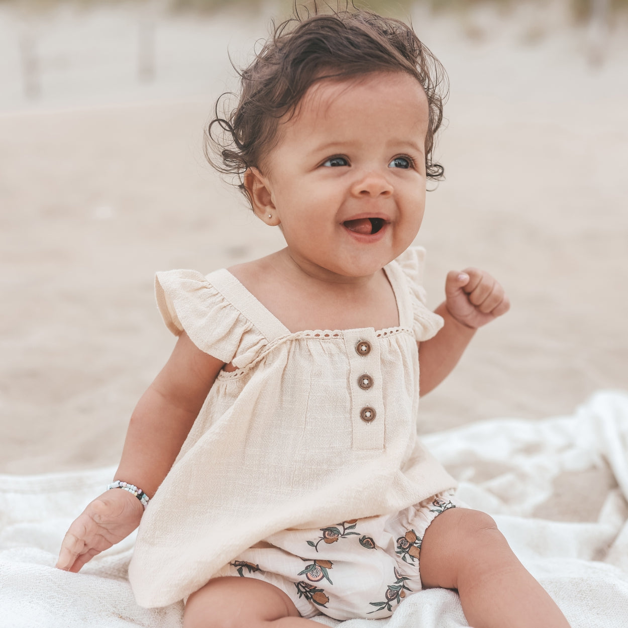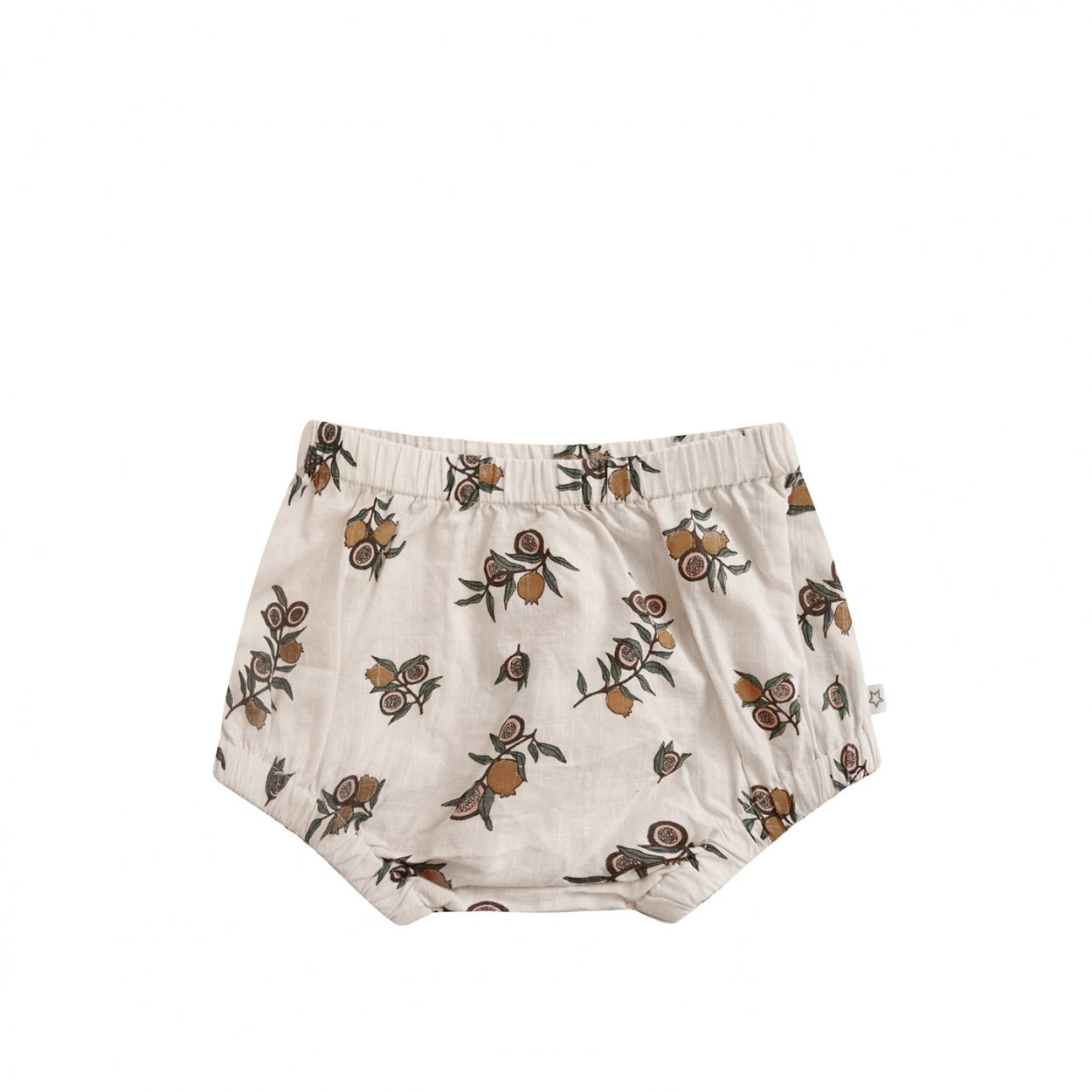 Deze bloomer van katoenen stof heeft een linnen achtige look & een mooie zacht gekleurde fruit print. Een luchtig item voor warme zomerdagen. Heerlijk met blote baby beentjes!