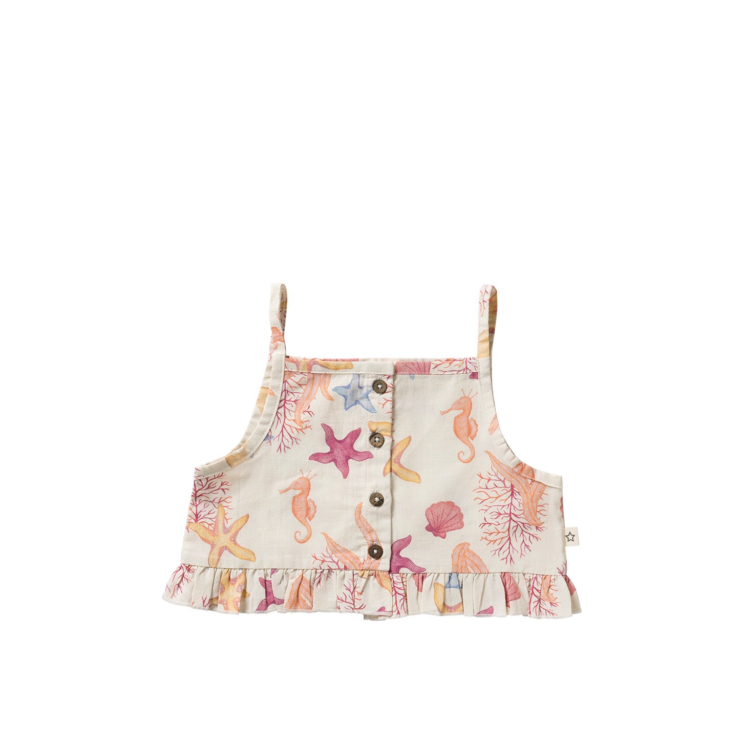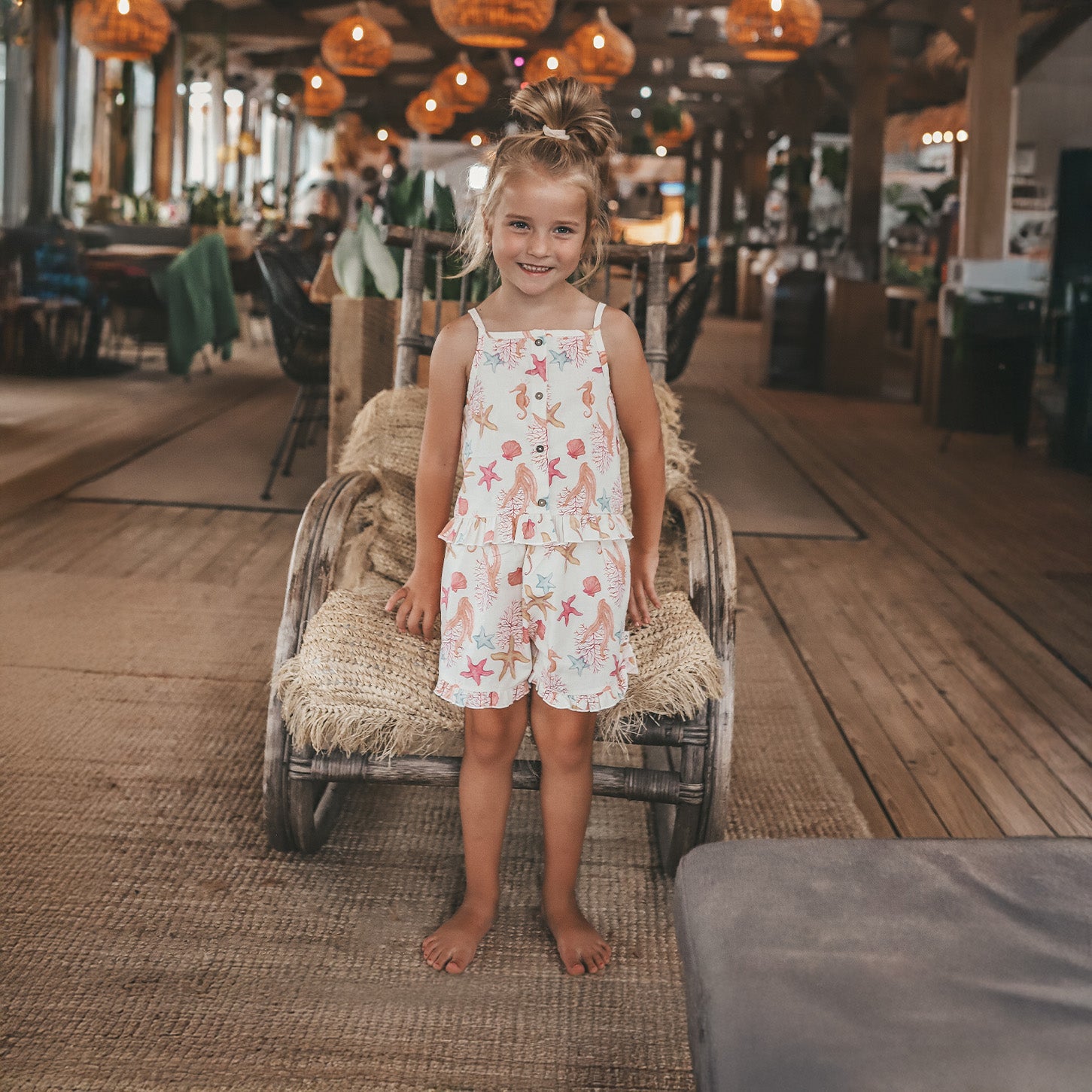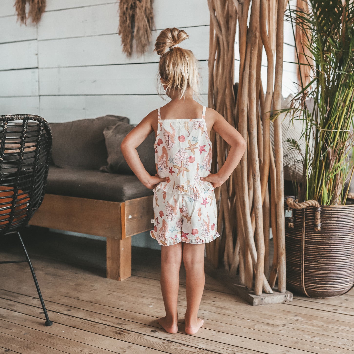 Met de 4 kokosknopen en de bijpassende stitching krijgt de Marina Ruffle Singlet een natuurlijk, charmante afwerking die een echte toevoeging is voor de zomergarderobe van je kind. Combineer met de Marina Ruffle Shorts op Seashell Knit voor een complete zomerstijl. Bestel nu in maten 80 tot en met 140!