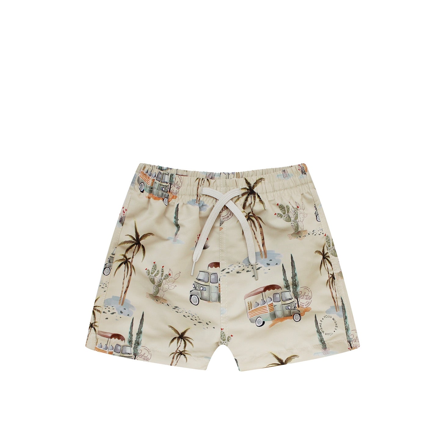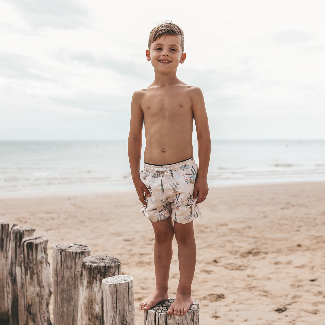 Sie suchen die perfekte Badehose für Jungen? Diese Badehose hat einen sommerlichen Aufdruck mit Abbildungen von Palmen und italienischen Eisdielen. Das Modell ist super bequem und in einer schönen Qualität mit einem Netzfutter hergestellt. Die Badehose hat einen Kordelzug im Bund, damit du sie nach Belieben einstellen kannst.