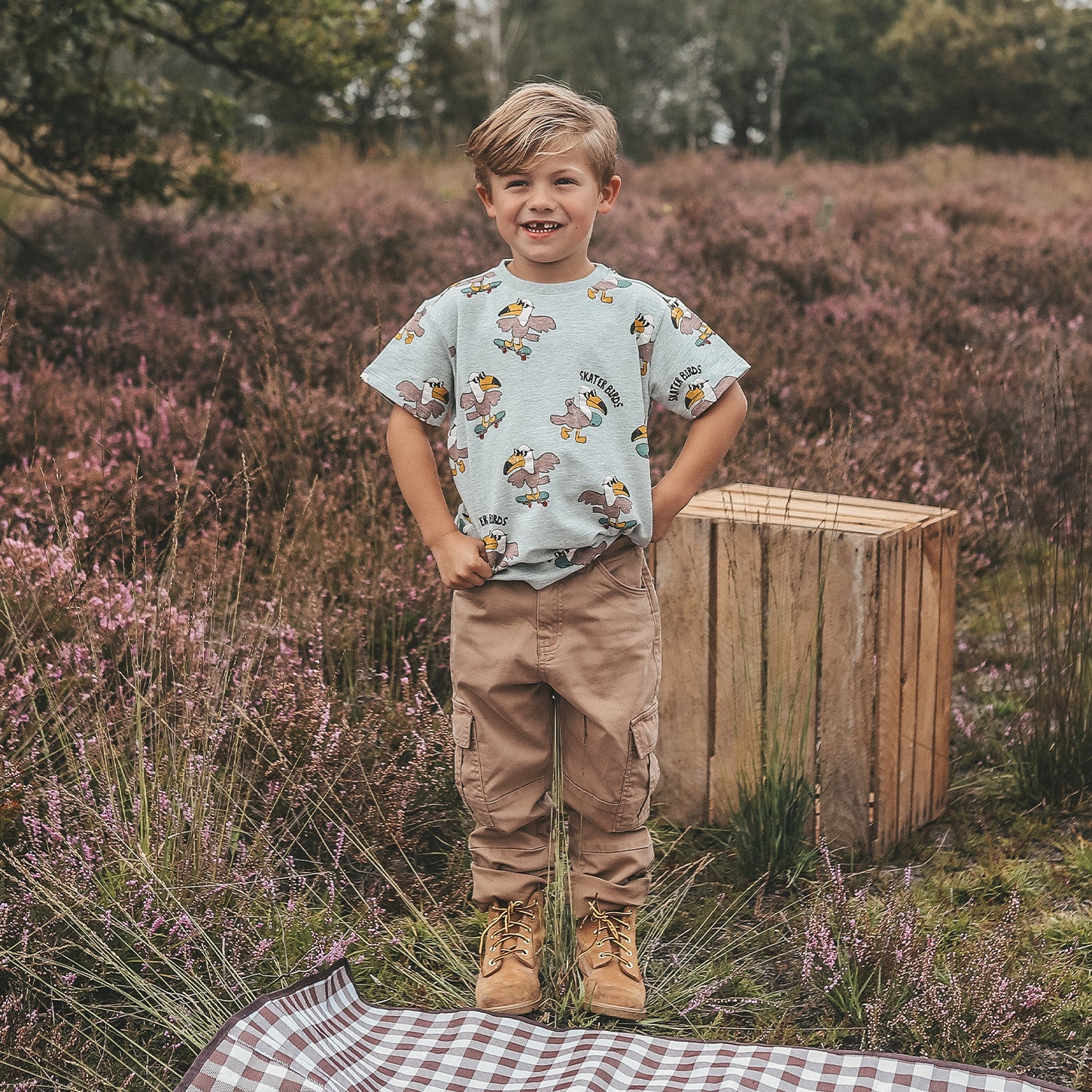 Beschikbaar in maten 80 tot en met 140, is dit shirt gemaakt van een hoogwaardige Single Jersey stof (95% katoen, 5% elastaan), waardoor het comfortabel, ademend en licht rekbaar is. De ademende katoenkwaliteit maakt dit shirt perfect voor warme dagen, terwijl de robuuste French Knit afwerking zorgt voor duurzaamheid en stevigheid, zelfs tijdens actieve zomerdagen. Combineer de Skatebirds Relaxed Tee met de Stretch Twill Cargo Pants voor een complete en zomerse look. Met deze outfit is je zoon klaar om stijlvol op avontuur te gaan! Shop nu bij Your Wishes.