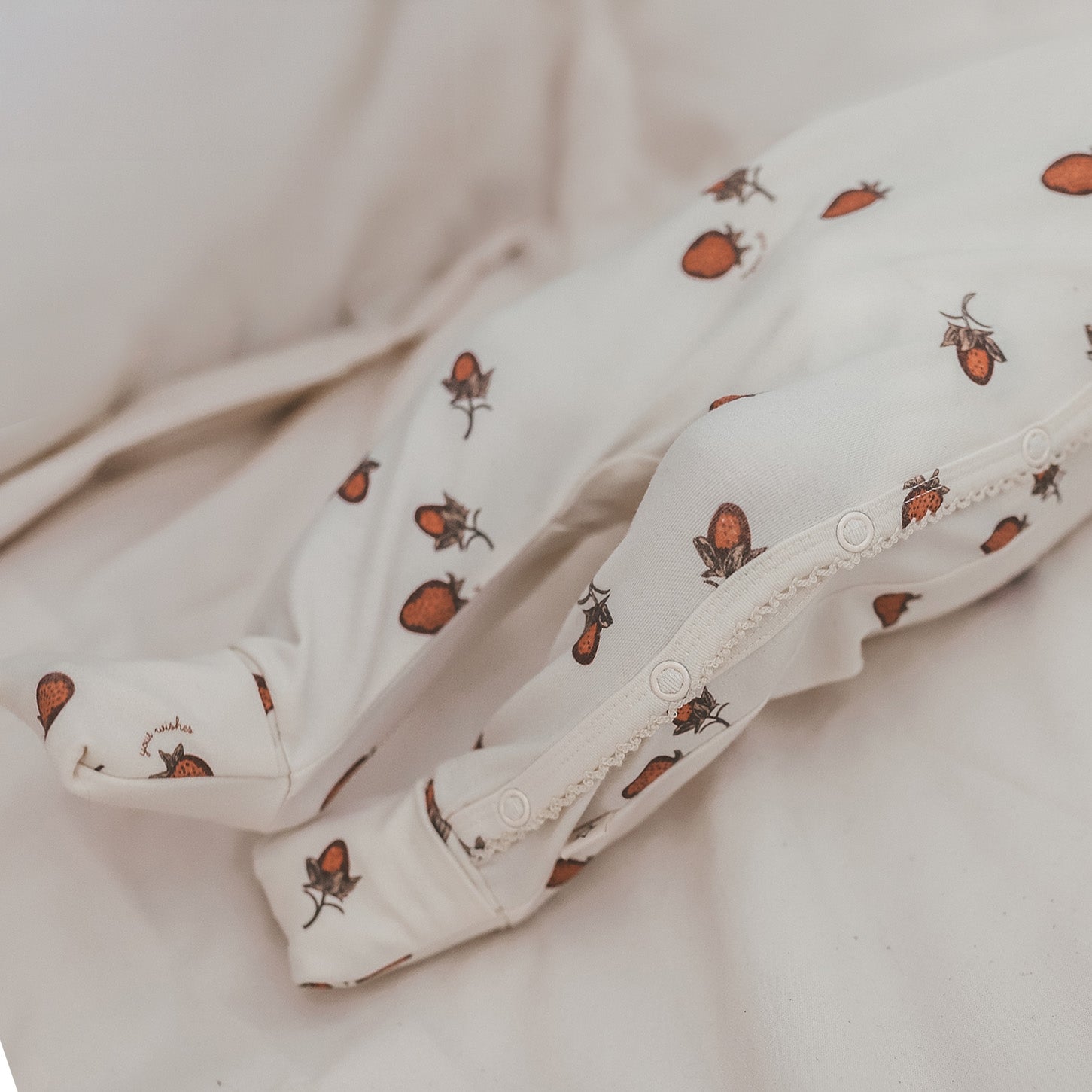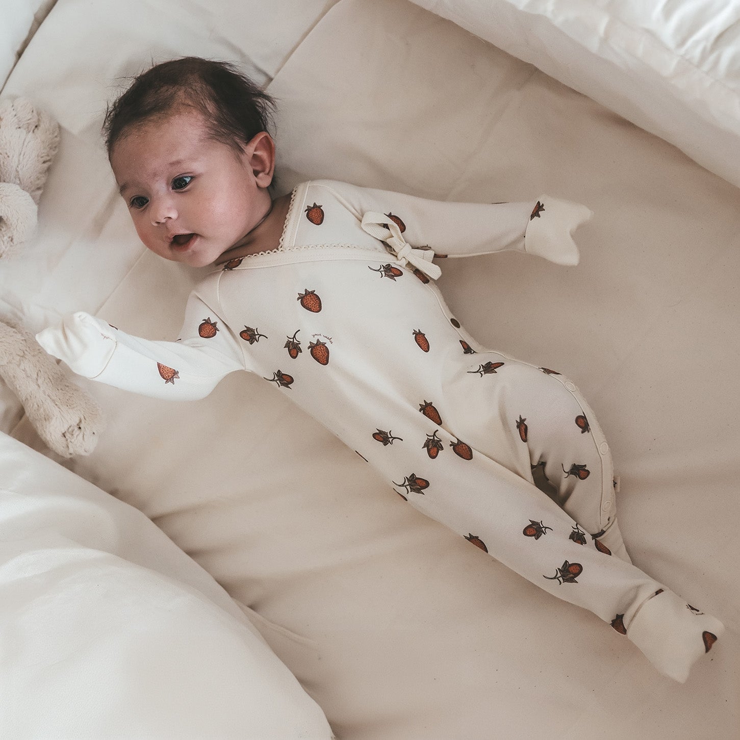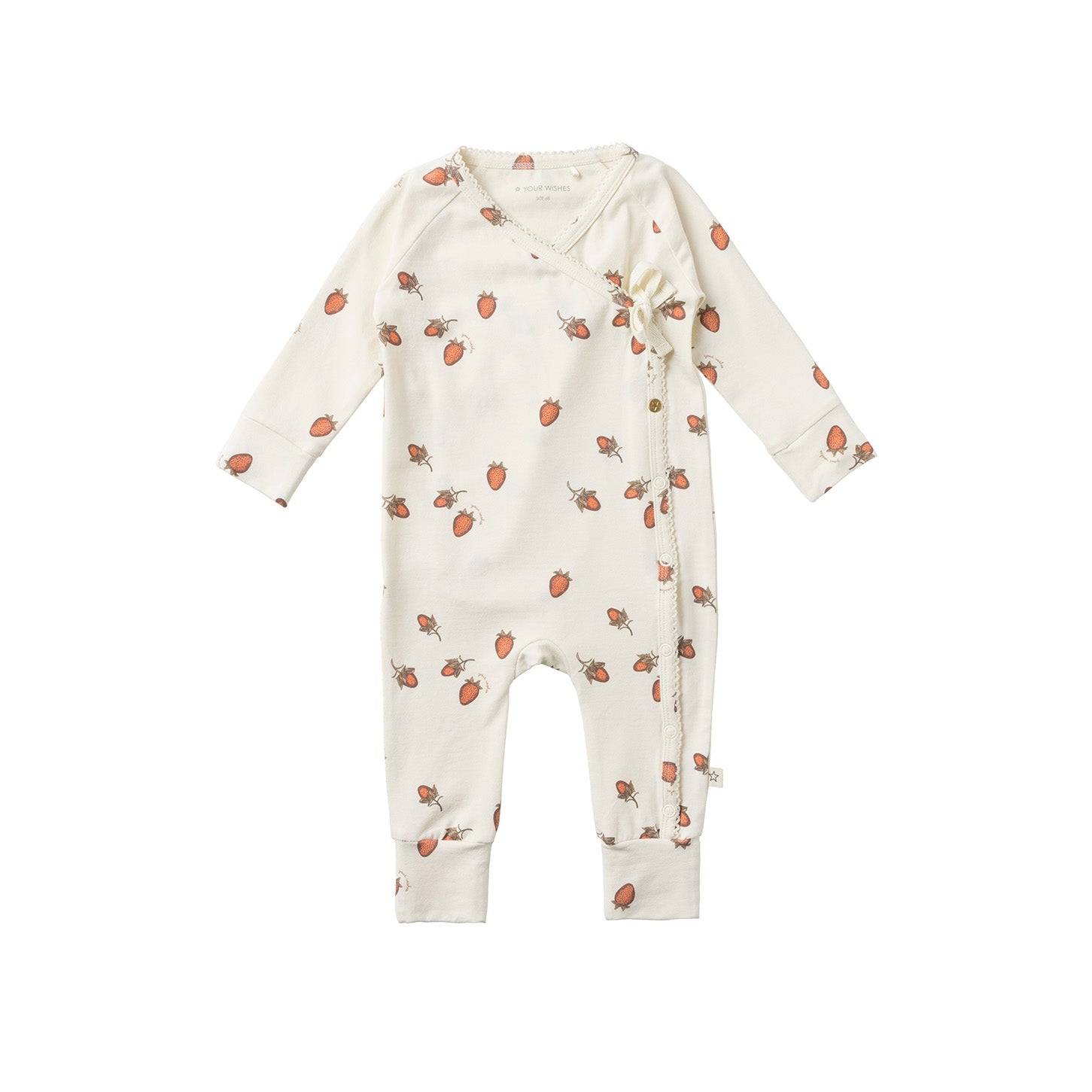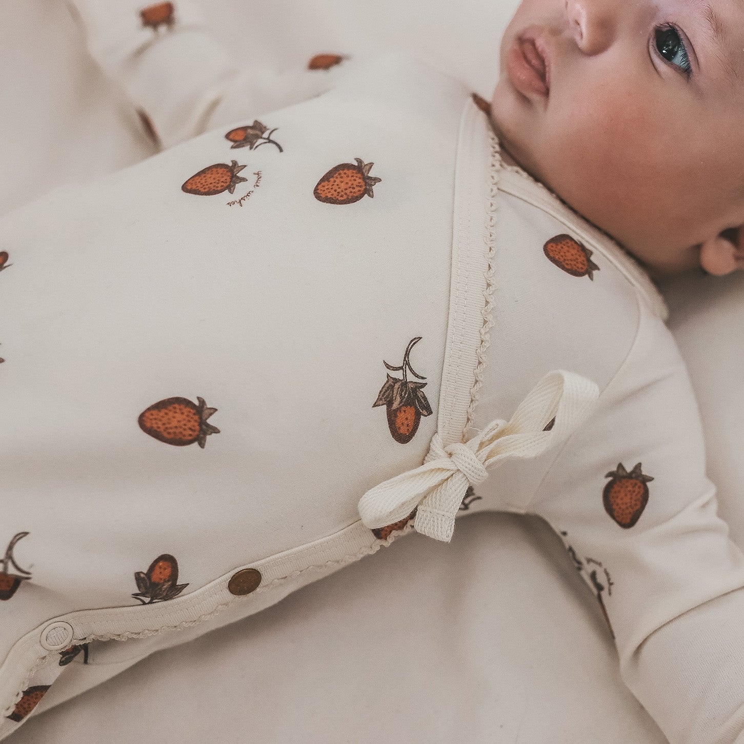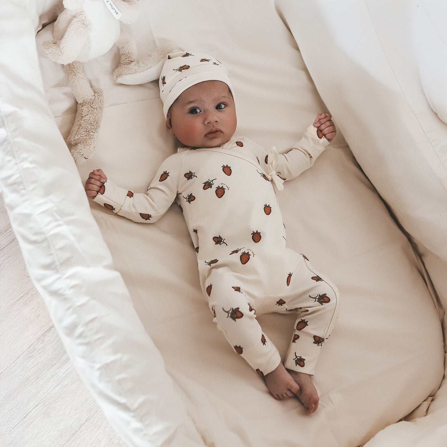 Mit dem Wrap Cuff Jumpsuit, der von Größe 50 bis 74 erhältlich ist, machen Sie Ihr Kind zu einem besonderen Beerenliebhaber. Dieser Erdbeer-Overall besteht aus einer Kombination aus Baumwolle und Modal, die sich wunderbar weich anfühlt, aber auch bis zu 50 % mehr Feuchtigkeit absorbiert. So entsteht ein atmungsaktiver Stoff, der beim Tragen nicht klebrig und schwitzig wird. Der Erdbeer-Strampelanzug ist ein Wickel-Strampelanzug, der ideal ist, wenn Sie sich noch mit dem Anziehen Ihres Kindes auseinandersetzen müssen. Legen Sie den Anzug komplett auf, bevor Sie Ihr Kind hineinlegen. Stecken Sie die Füße durch die Beine und die Arme durch die Ärmel, wickeln Sie die rechte Lasche um den Bauch und schließen Sie sie mit Druckknöpfen. Dann klappen Sie die linke Klappe um und befestigen sie mit den Druckknöpfen und dem Kordelzug. Beim Wechseln der Windel muss nur die linke Klappe des Erdbeeranzugs geöffnet werden, um die Windel zu erreichen. Der Anzug hat außerdem integrierte Handschuhe und Socken, die über Hände und Füße gestülpt werden können. So besteht keine Gefahr, dass sie sich kratzt, und sie bleibt warm! Wenn Sie diesen niedlichen Spielanzug mit Erdbeerüberlappung mit derWendemütze kombinieren, sieht Ihr Kind einfach umwerfend aus!