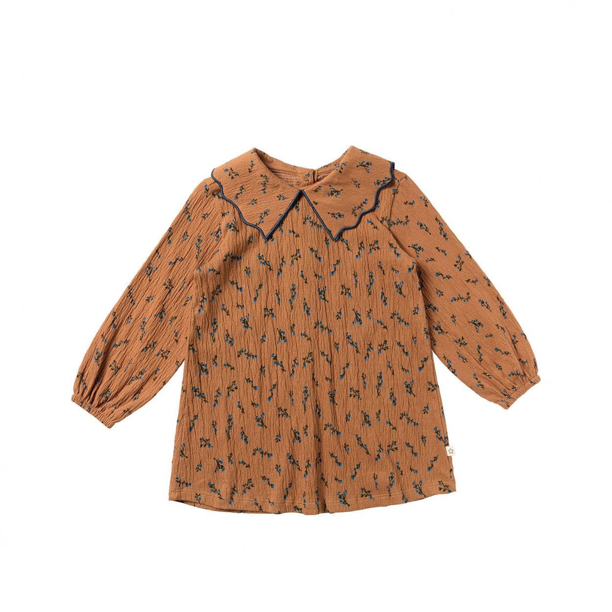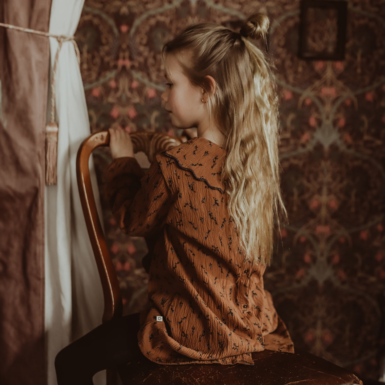 The Harper dress is sure to become a closet favorite and is available from size 80 to 146/152. The dress has a strikingly large collar that is finished with a dark blue embroidered border that perfectly matches the floral pattern of the dress. The dress can be easily pulled on over the head, but can also be opened completely if needed thanks to the row of buttons incorporated at the back. The ends of the sleeves are finished with elastic for a nicer fit, but also to keep out the cold. The floral print of the dress is based on a hand-painted design, making it completely unique. As such, the Harper dress is without a doubt one of this season's favorites and perfect to wear for multiple seasons!