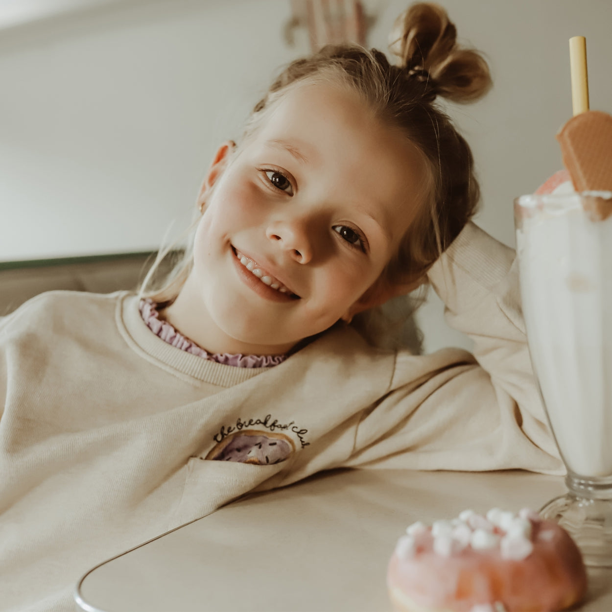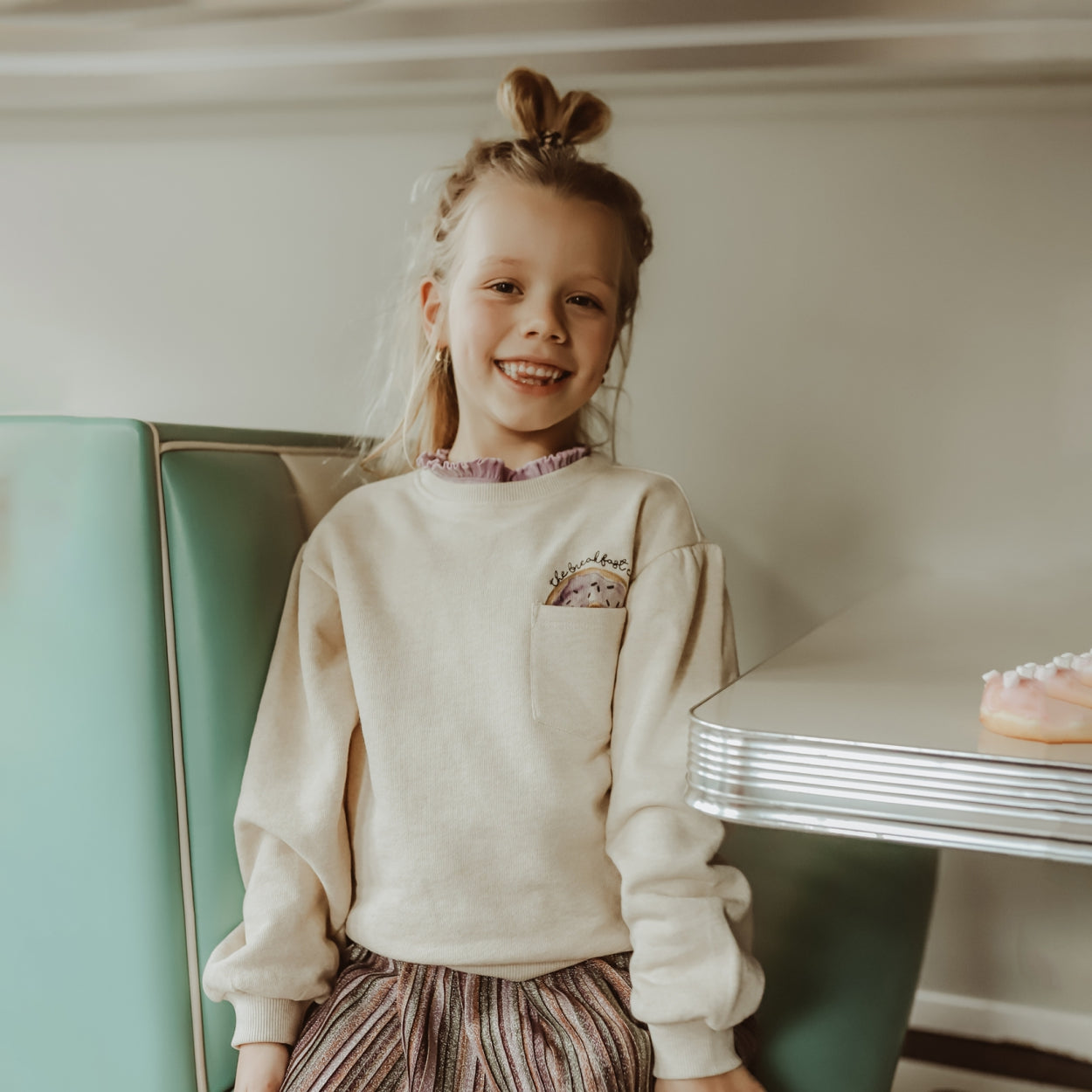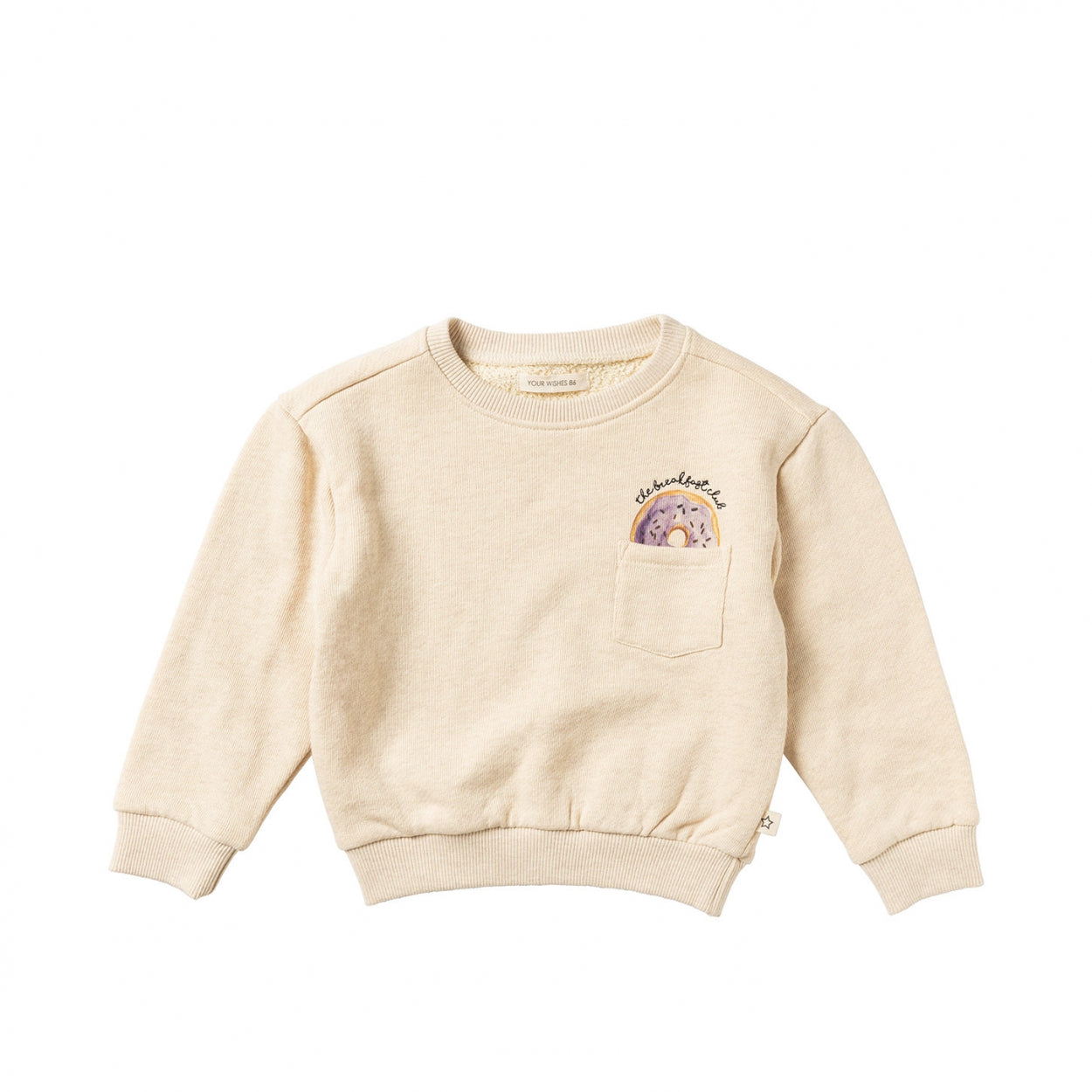 Turn your child into a true fashionista with the Bentley sweater, available from size 80 to 146/152. The sweater is made of a combination of cotton and elastane, which makes it feel wonderfully soft. The fabric is nice and stetchy which makes it wonderfully comfortable but also has a nice fit. On the chest is a slit pocket with a donut sticking out, above it is embroidered the breakfast club. A cute little purple star is embroidered on the back of the collar. The sweater features subtle puff sleeves and has elastic trim at the ends of the sleeves and the bottom of the sweater, keeping the cold out and your child just nice and warm. The Bentley is the ideal sweater for this season for a reason!