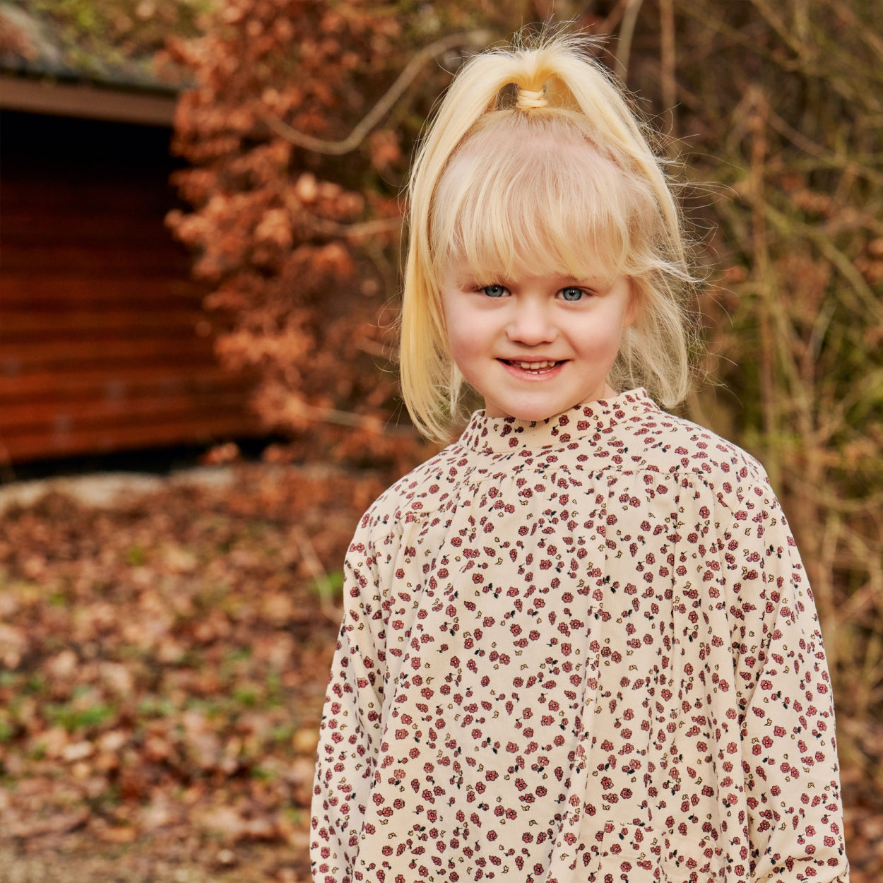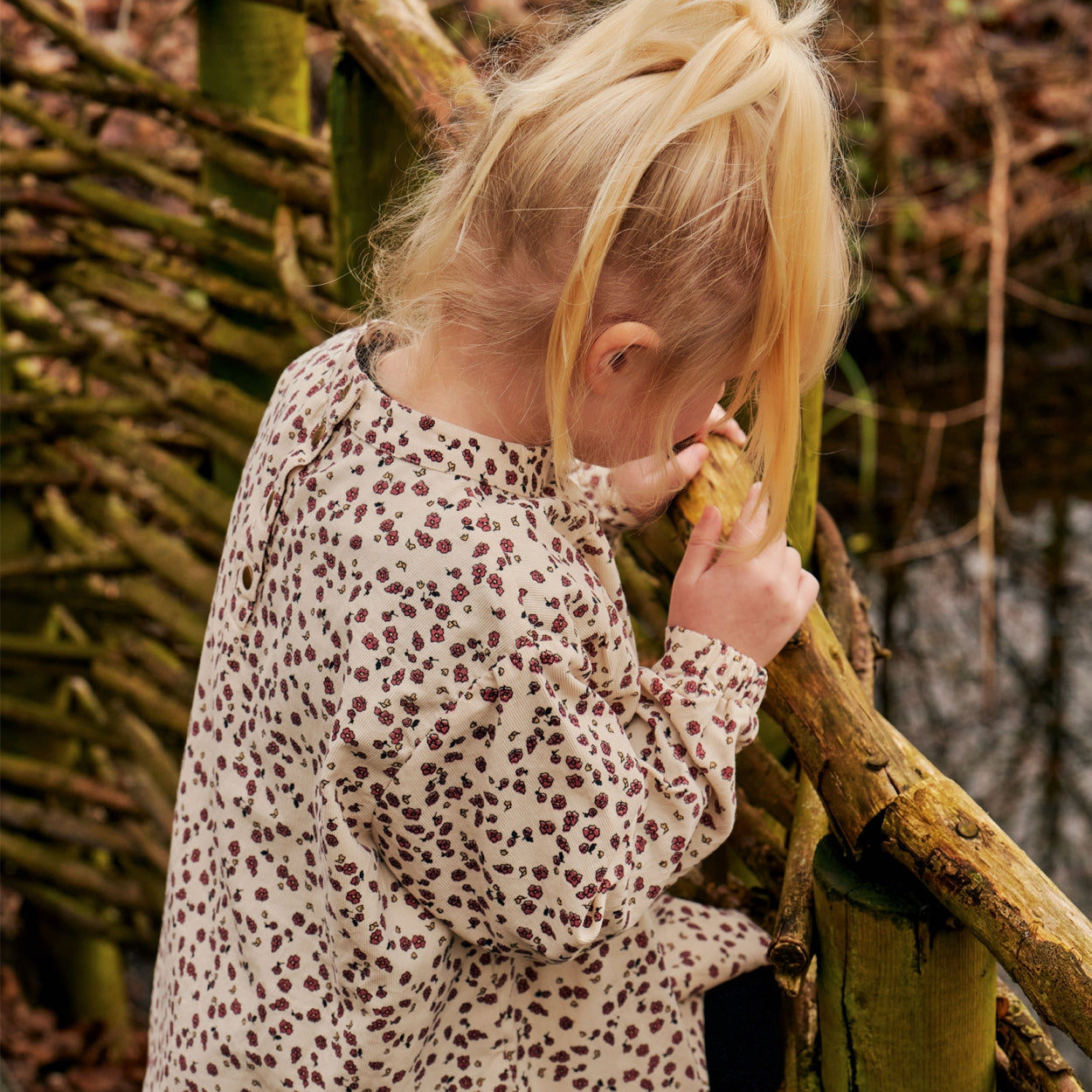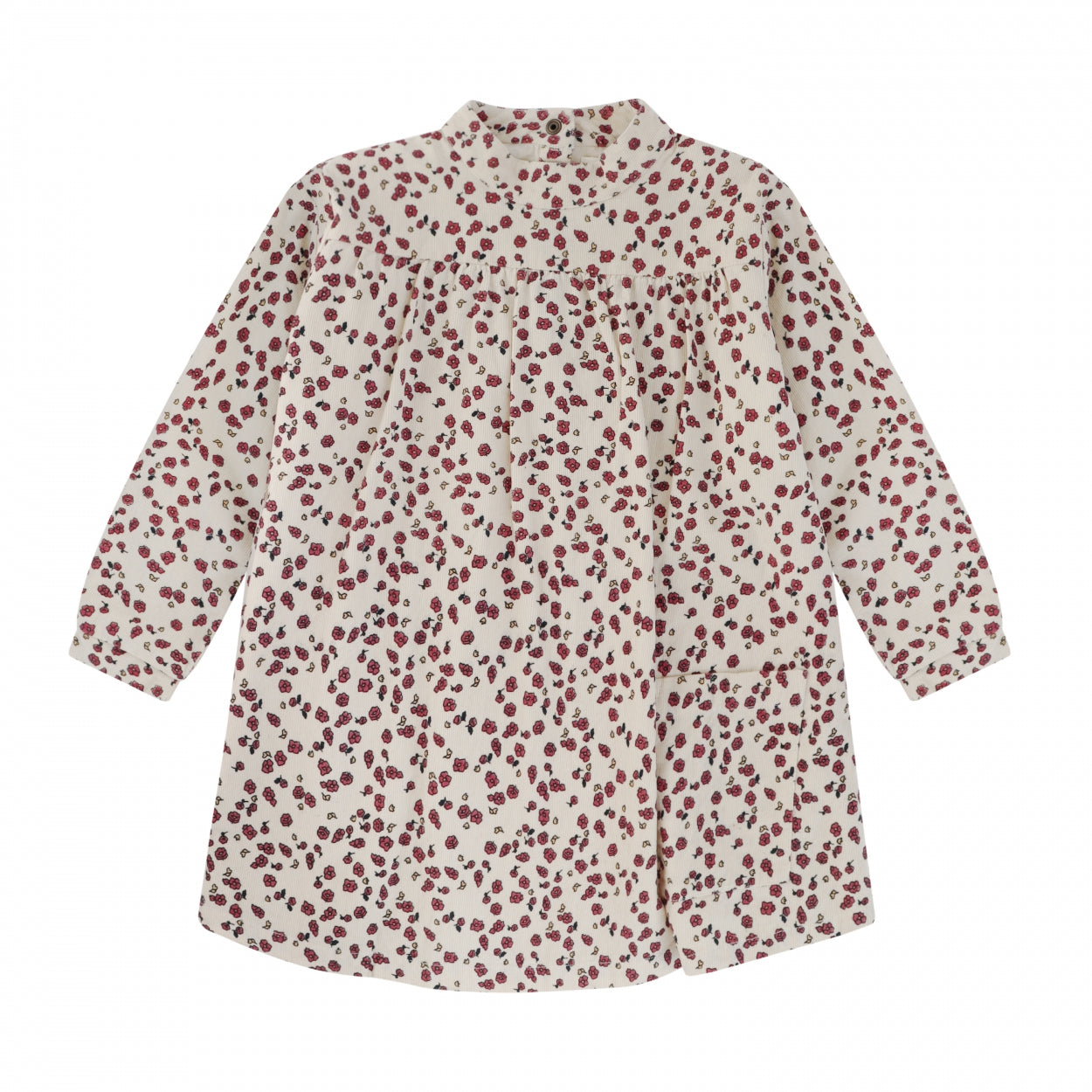 This flared dress has a wide fit and features a high collar and long sleeves. This supple corduroy quality features a small floral print.