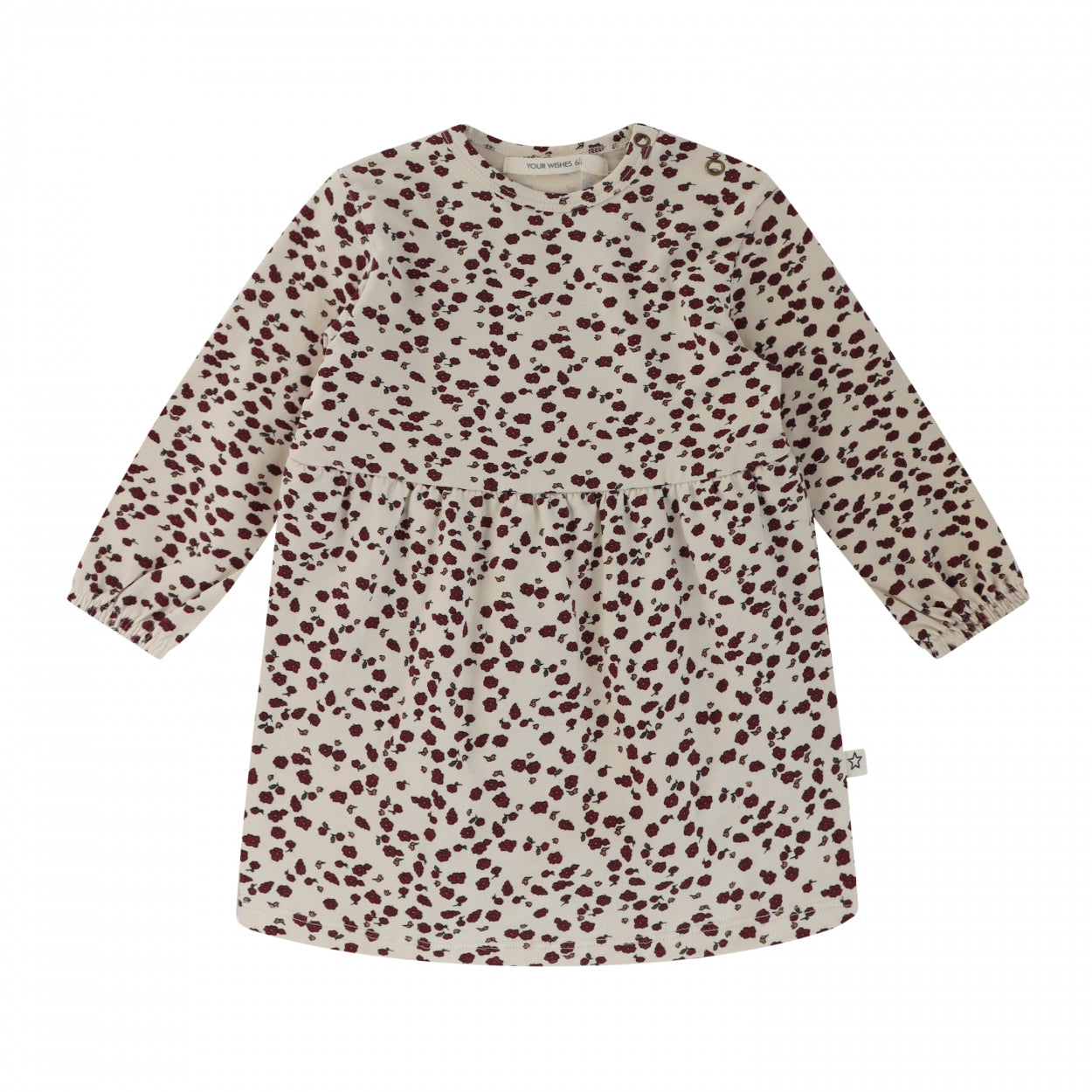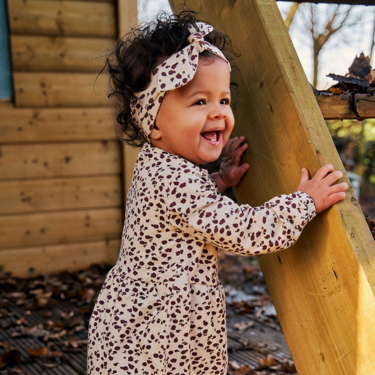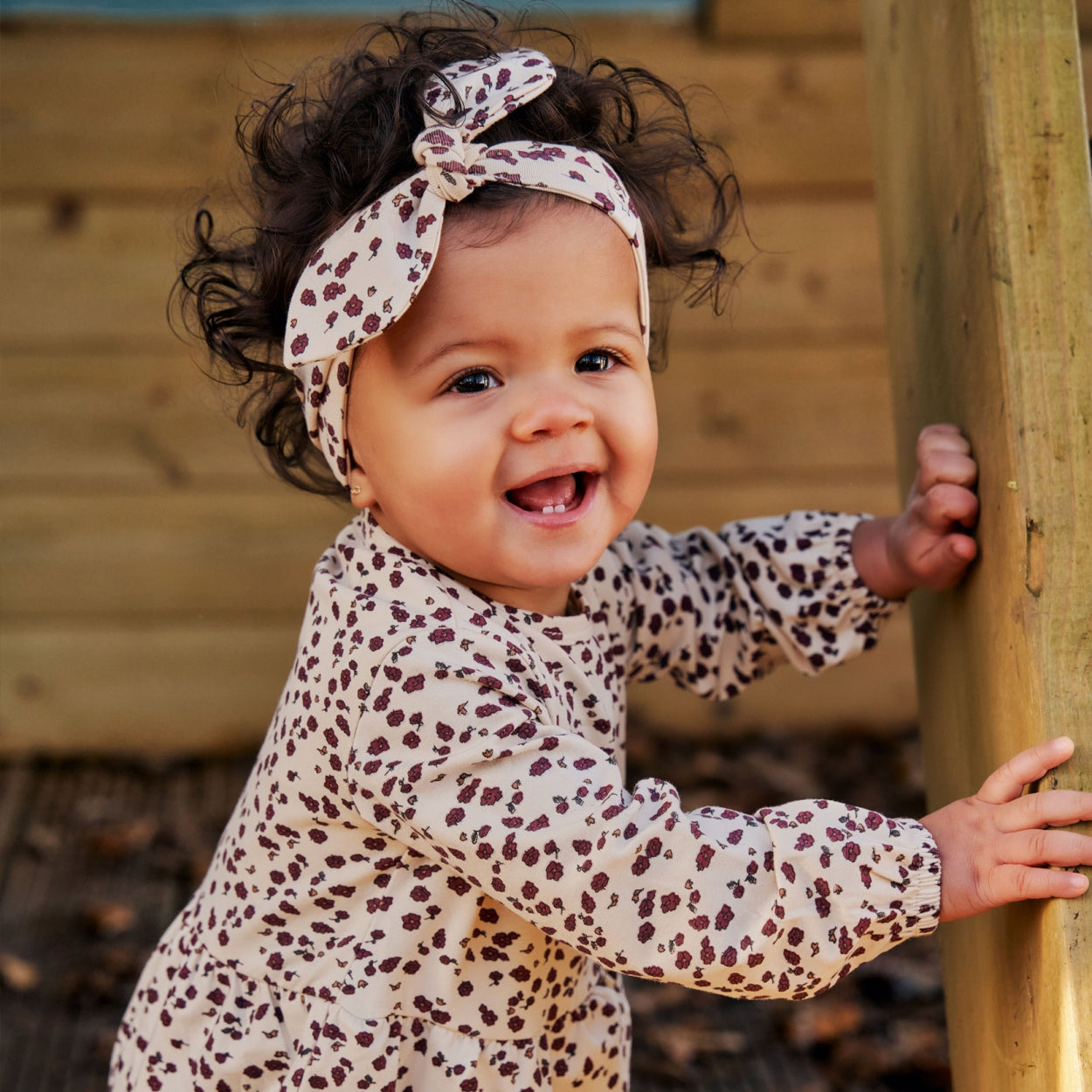 A dress in soft jersey quality with a small floral print. The dress with integrated romper features a convenient snap button closure on the shoulders and between the legs. Nice to combine with the matching hairband.