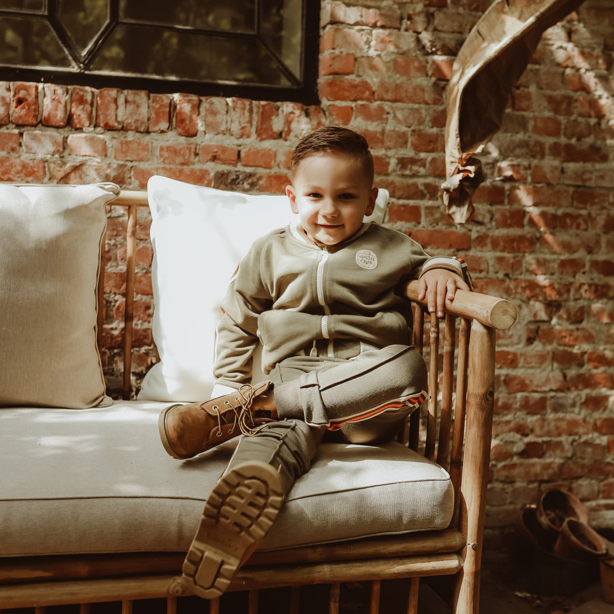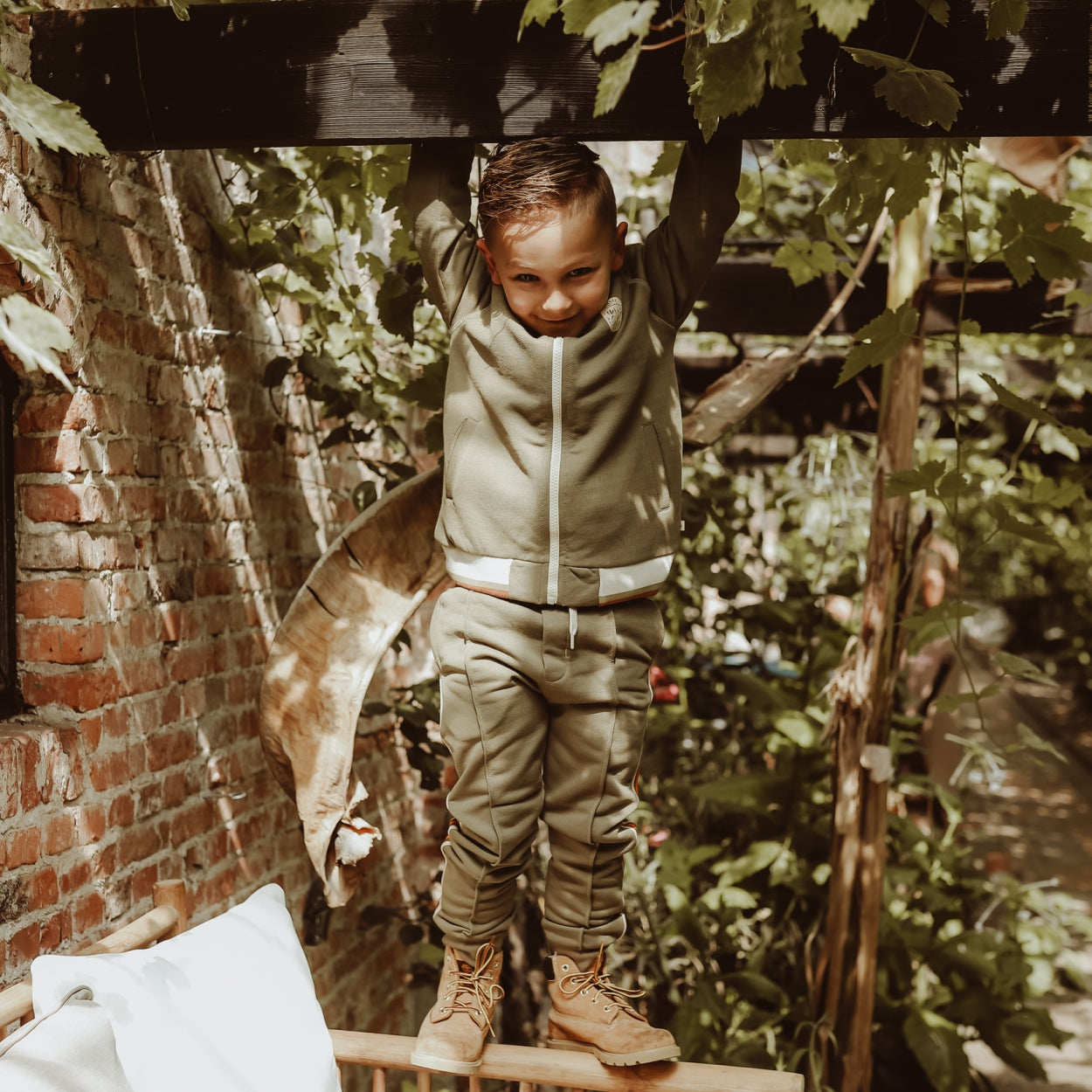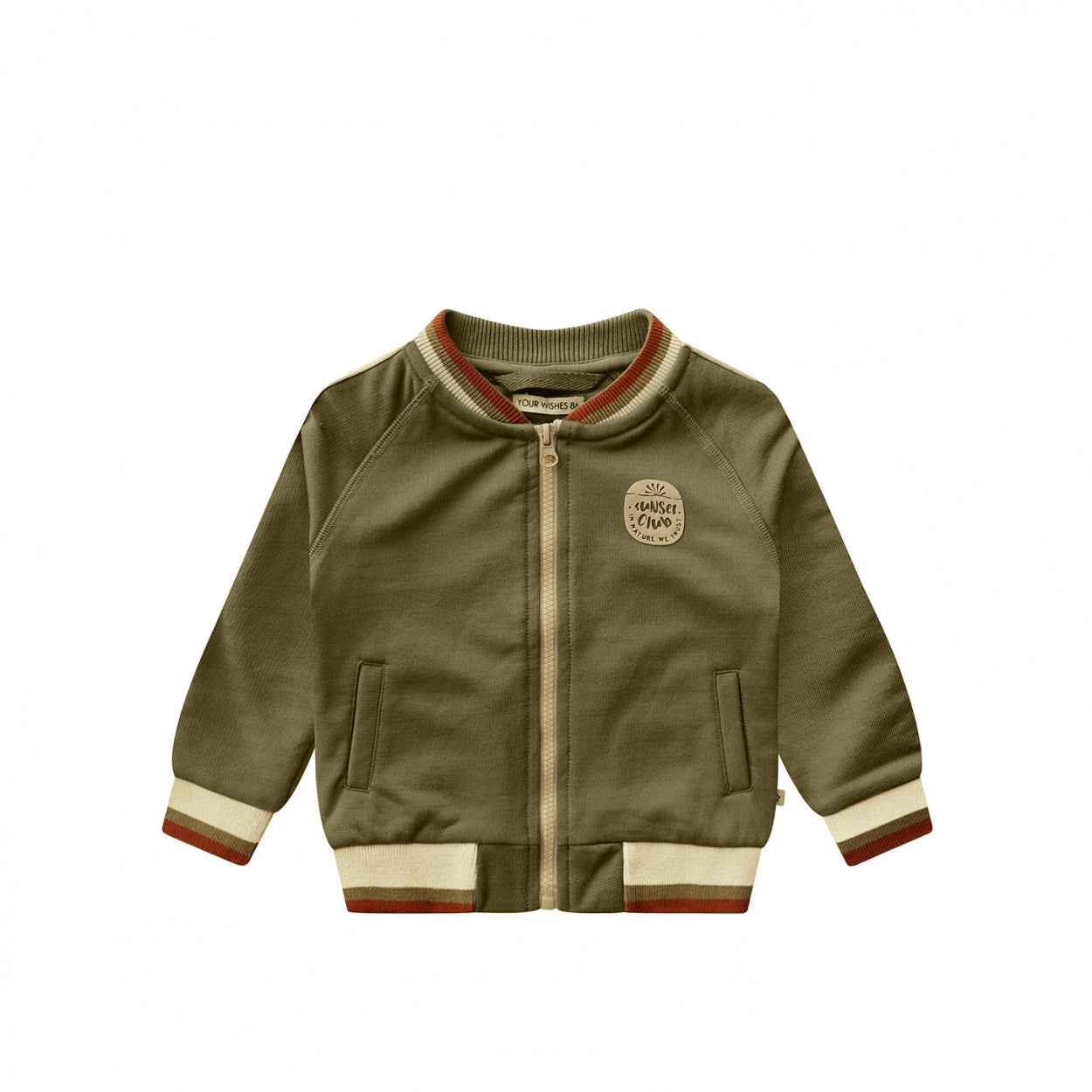 A green bomber for baby and kids. The trainer jersey quality gives the bomber a sporty look. The bomber is lined and has a front zipper, raglan sleeves and a ribbed trim along the neckline, at the bottom and at the bottom of the sleeves. |