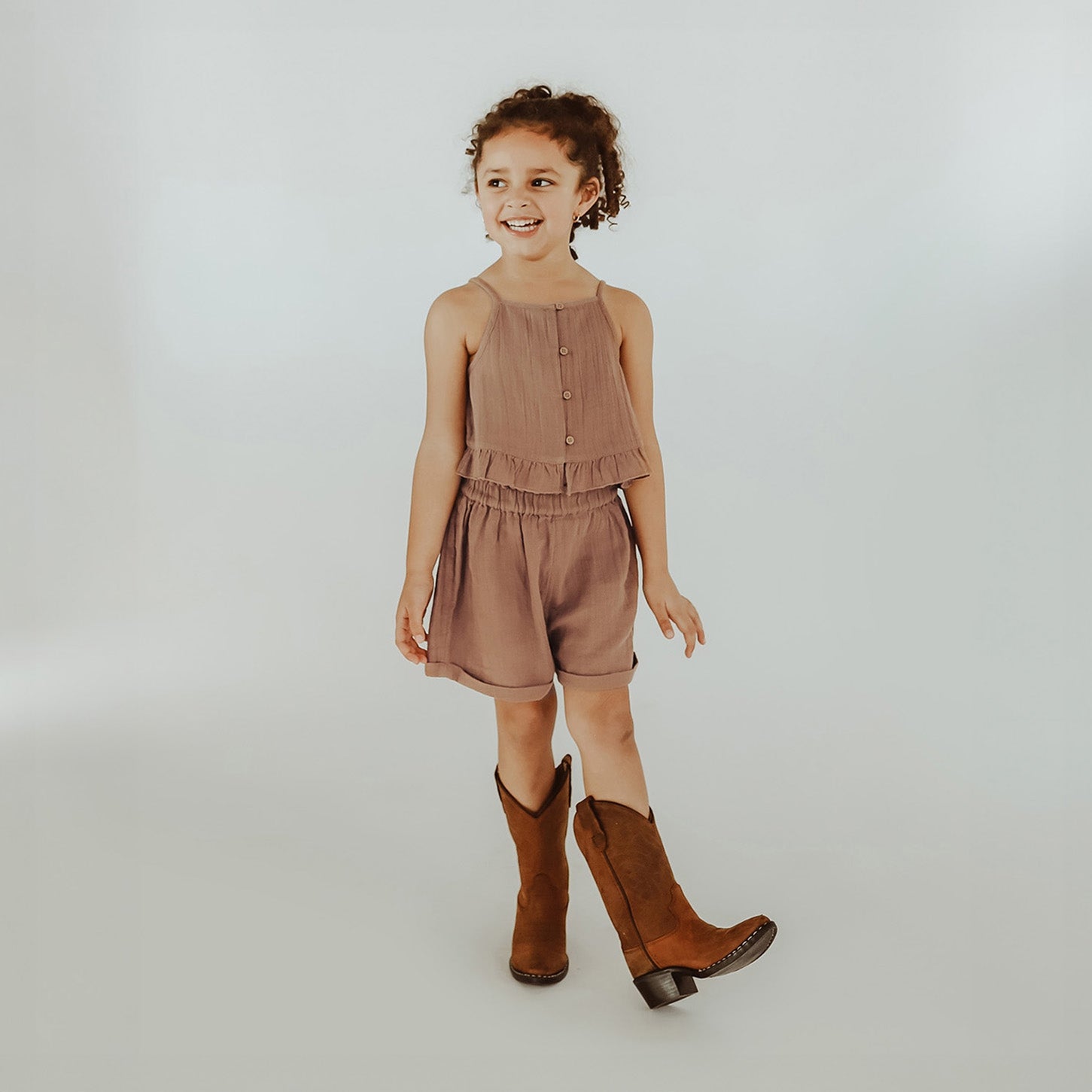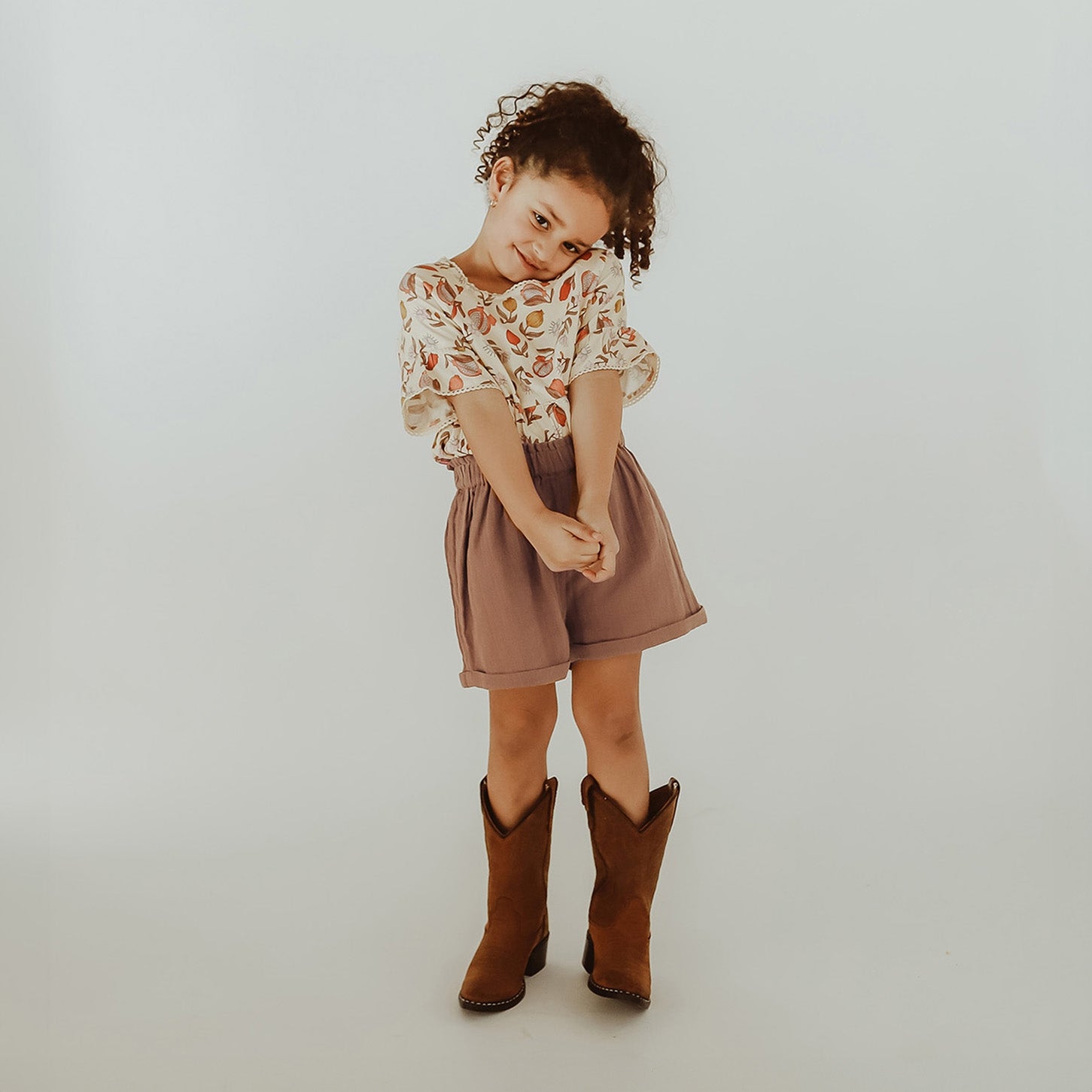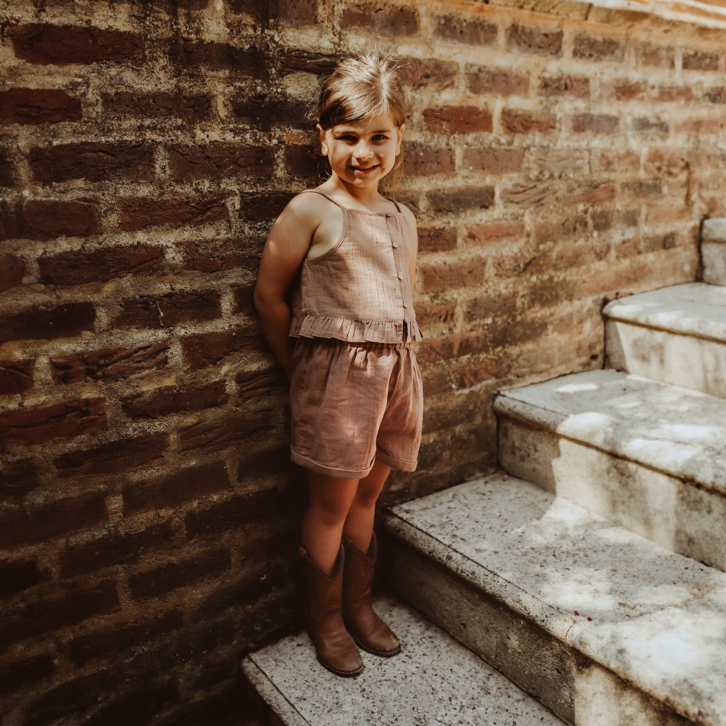 The Elianne short is made of a lovely airy fabric and is available from size 80 to 140. The hazelnut brown color also makes these shorts very easy to combine with other items in the closet, making them almost indispensable for the summer wardrobe. The Elianne short has an elastic waistband, making it very comfortable to wear but also fits your child's body well. Combine the Elianne shorts with the Jessica top for a complete co-ord set or go for the Pola blouse for a slightly more casual look. However you combine the Elianne shorts, your child will look like a true fashionista this summer!