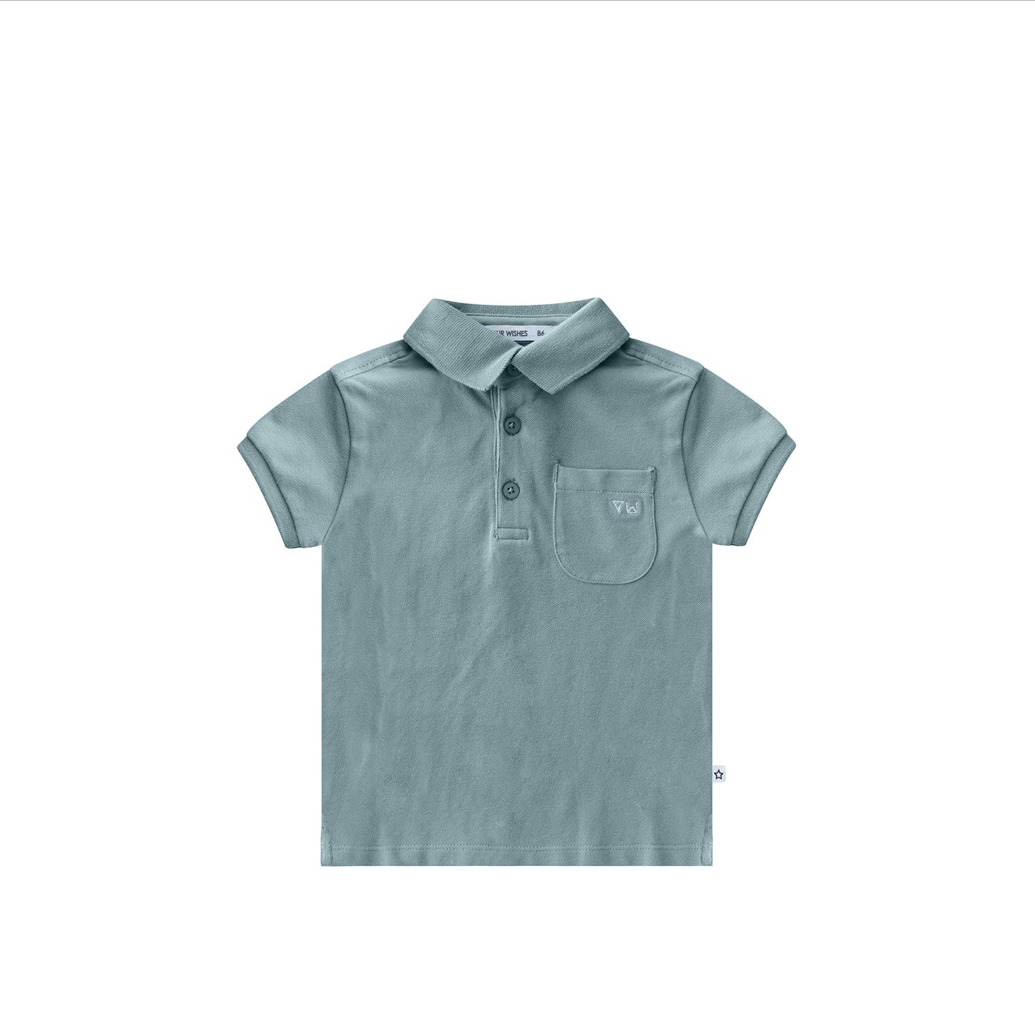 Short-sleeved cotton polo shirt with a polo collar and top button placket. The polo shirt has a blue color.