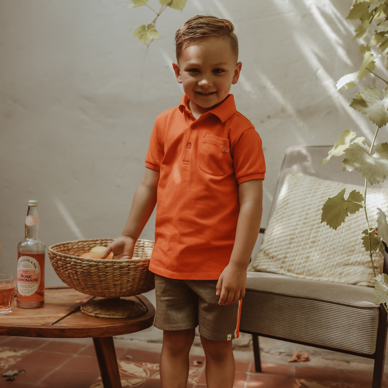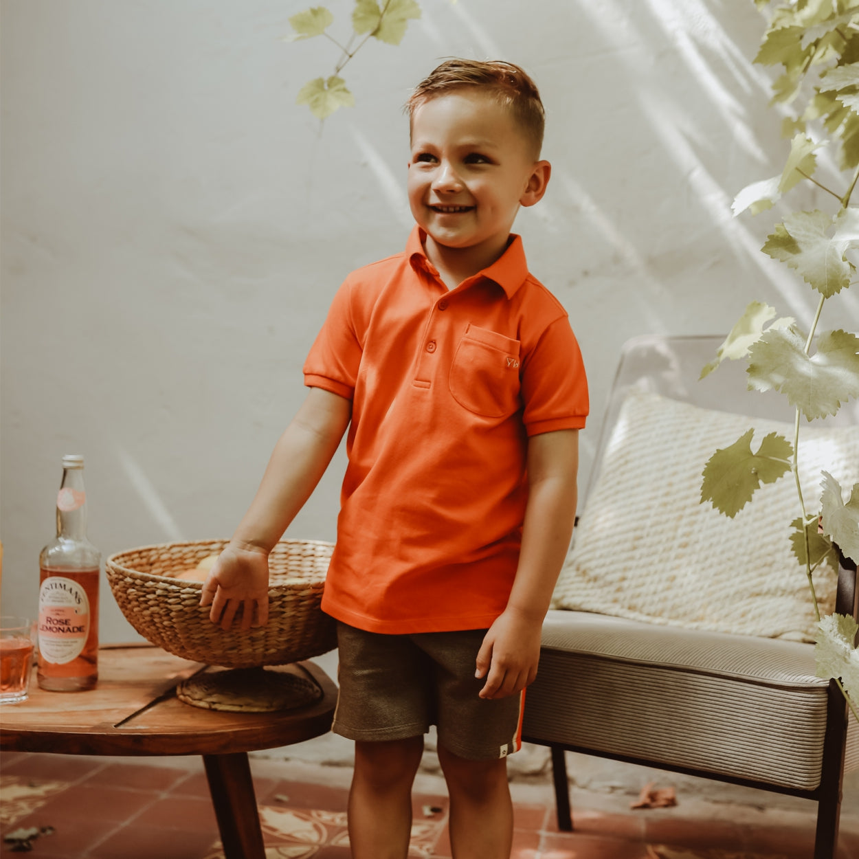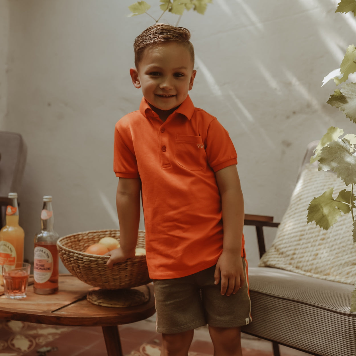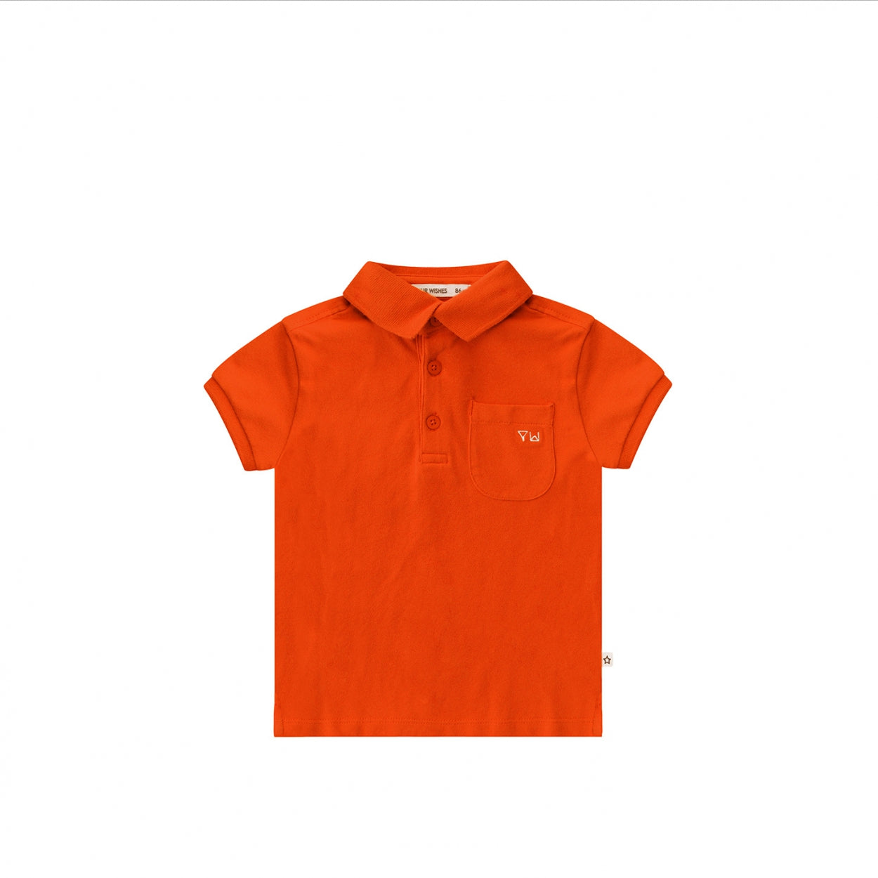 Short-sleeved cotton polo shirt with a polo collar and top button placket. The polo shirt has a bright orange color. |