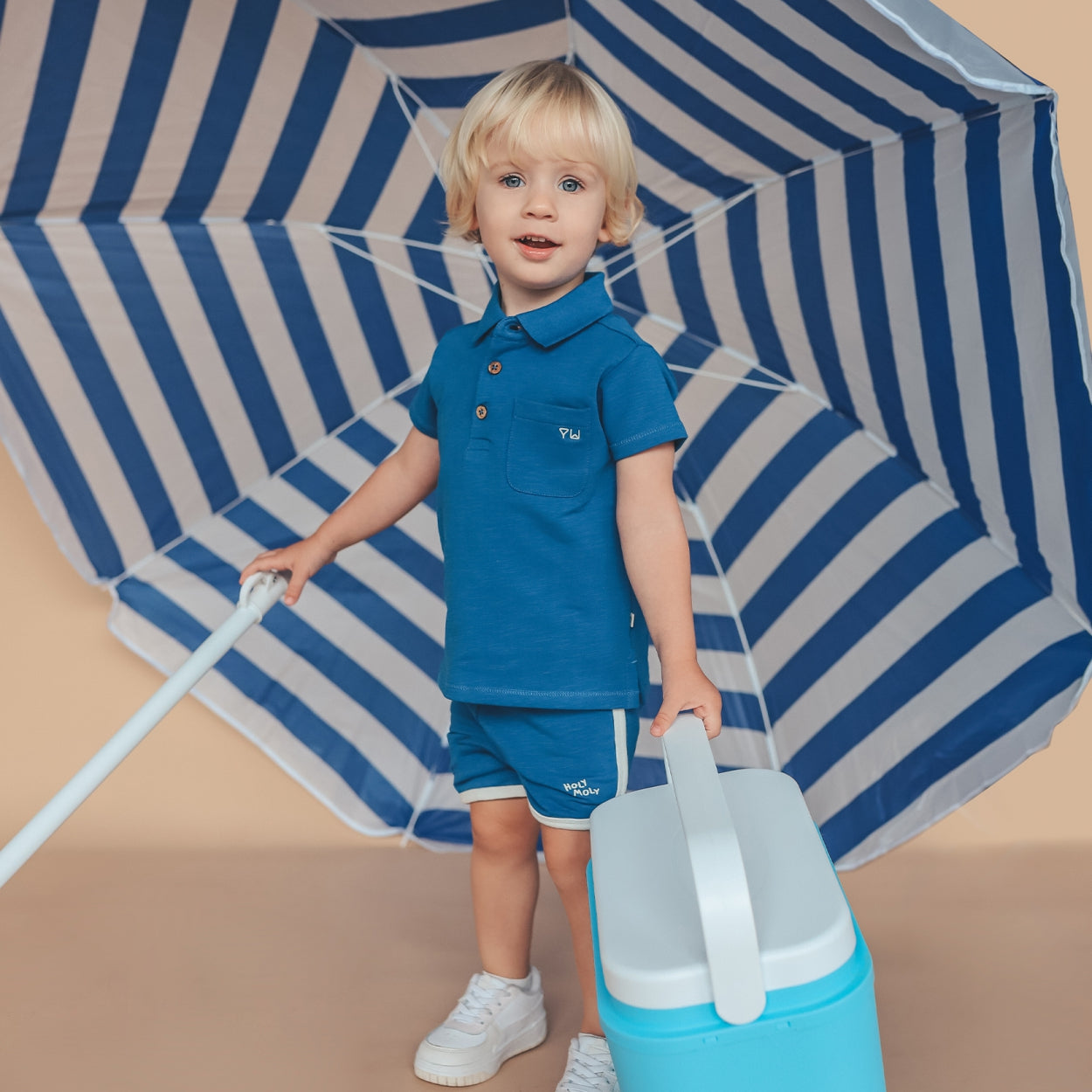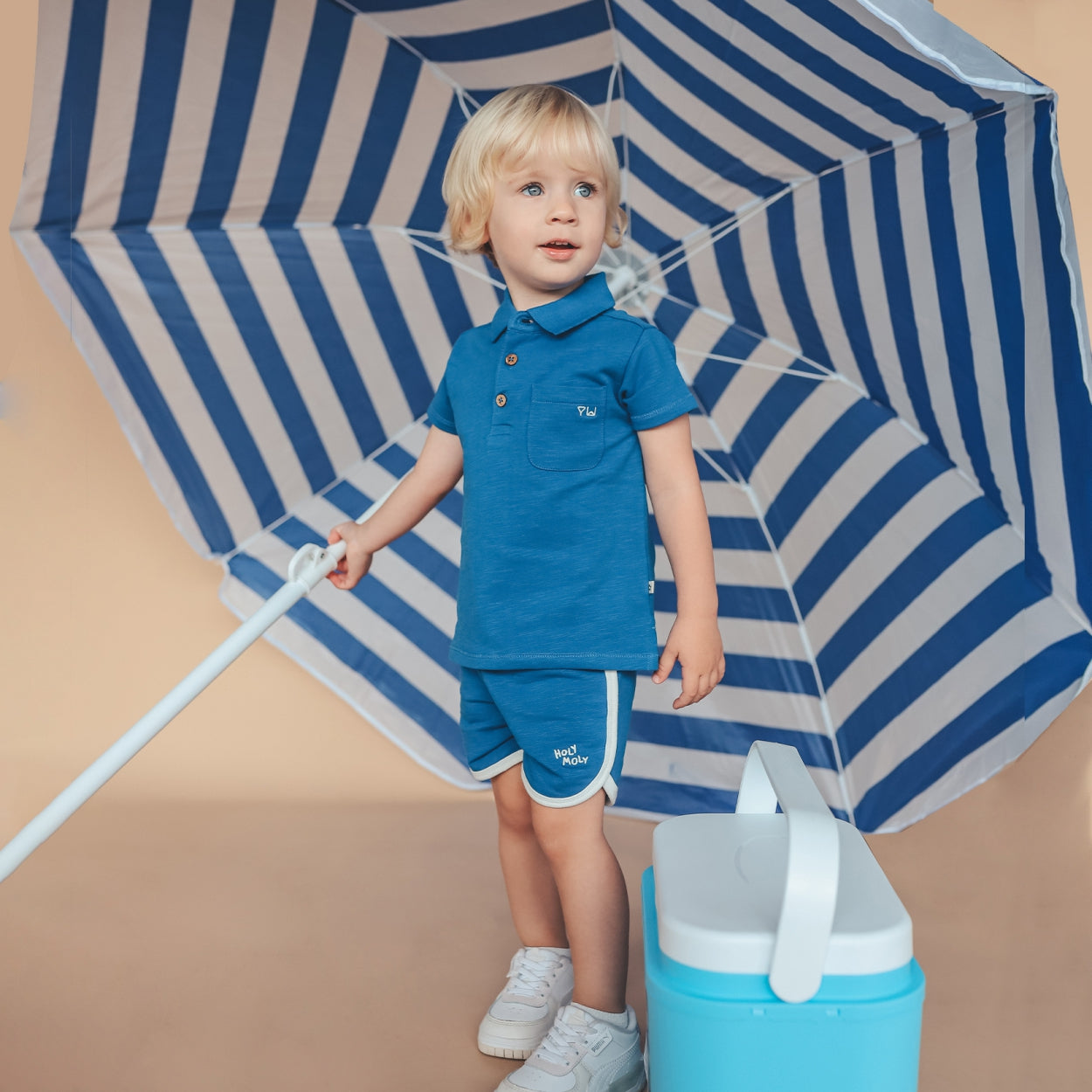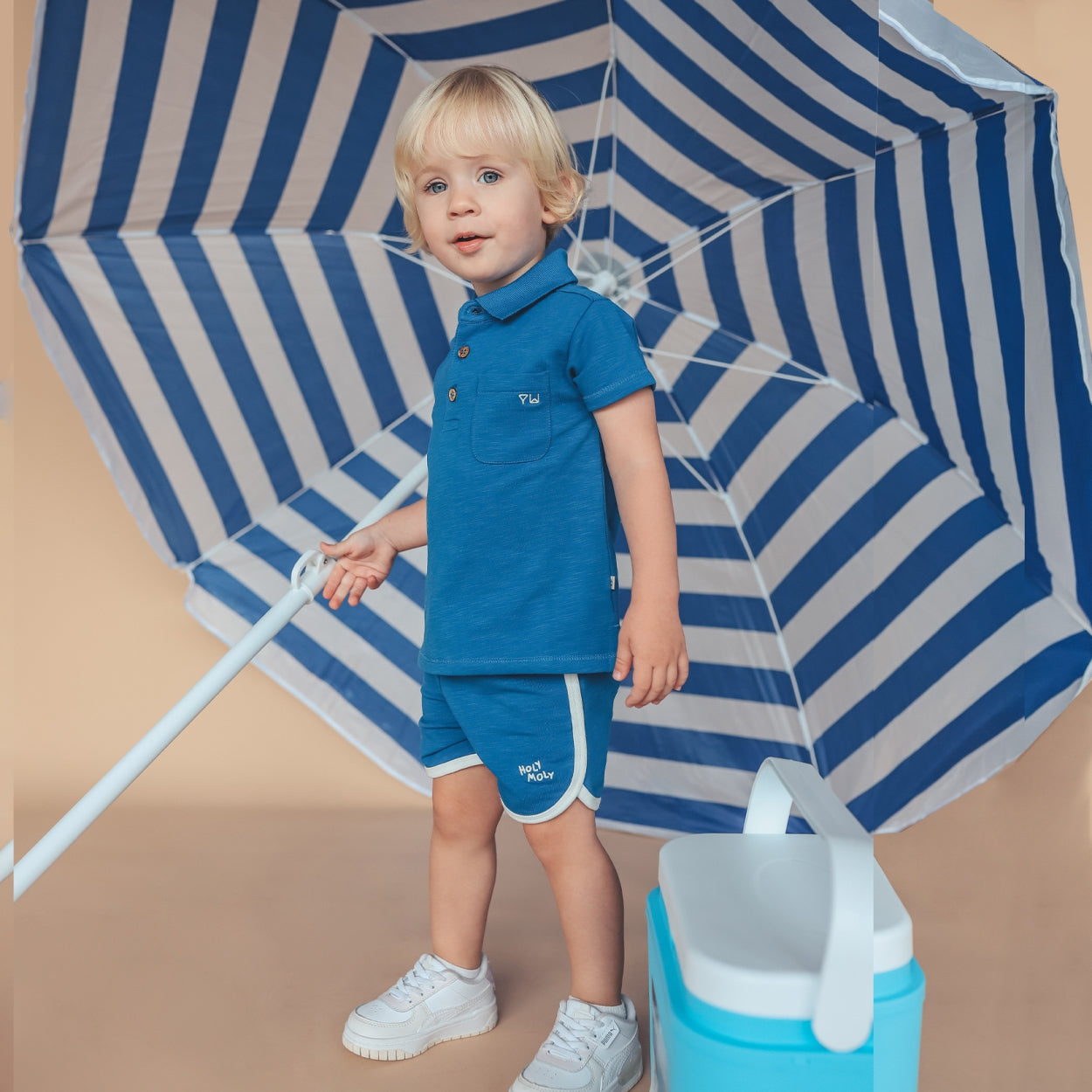 Retro looking shorts in a fresh blue color. The shorts feature an elastic waistband with drawstring. The model has white piping on the sides that continues down the legs. A comfortable and cool pair of shorts, perfect for the hot summer days.