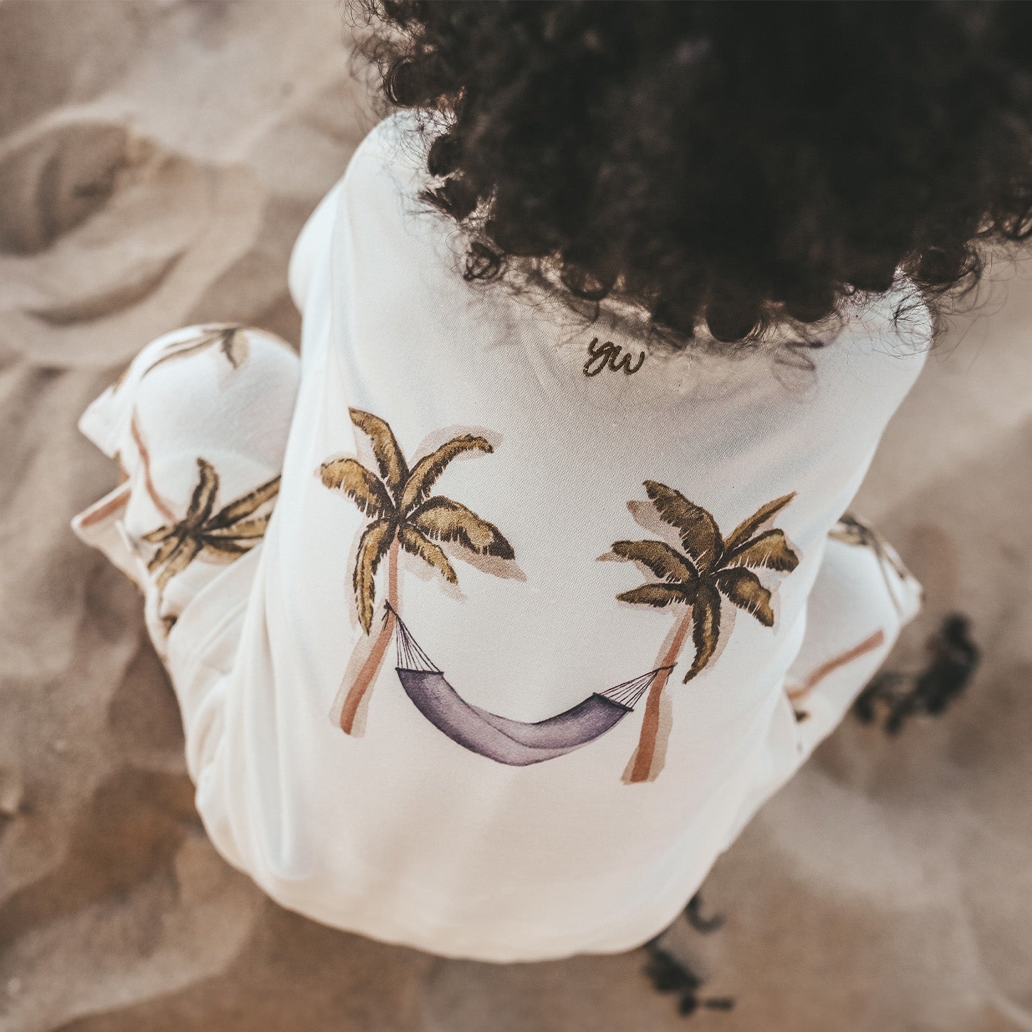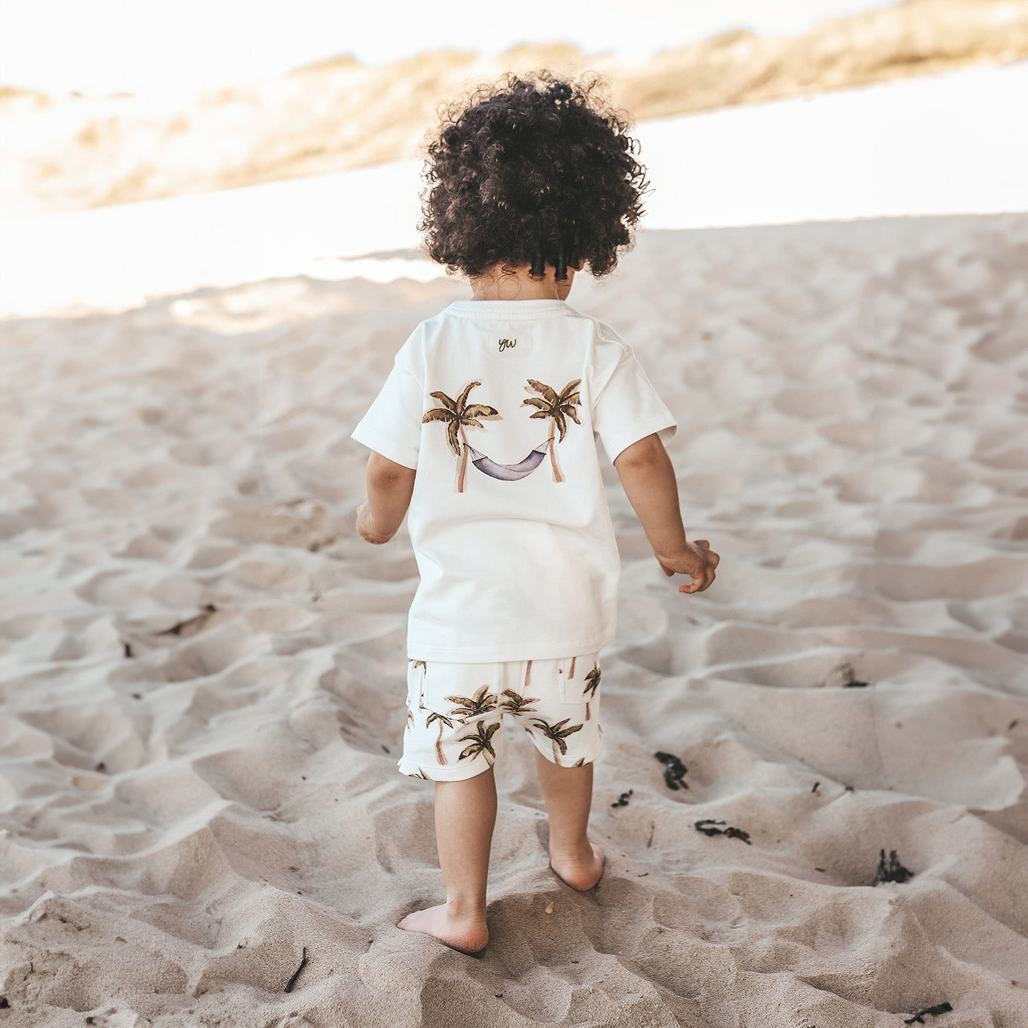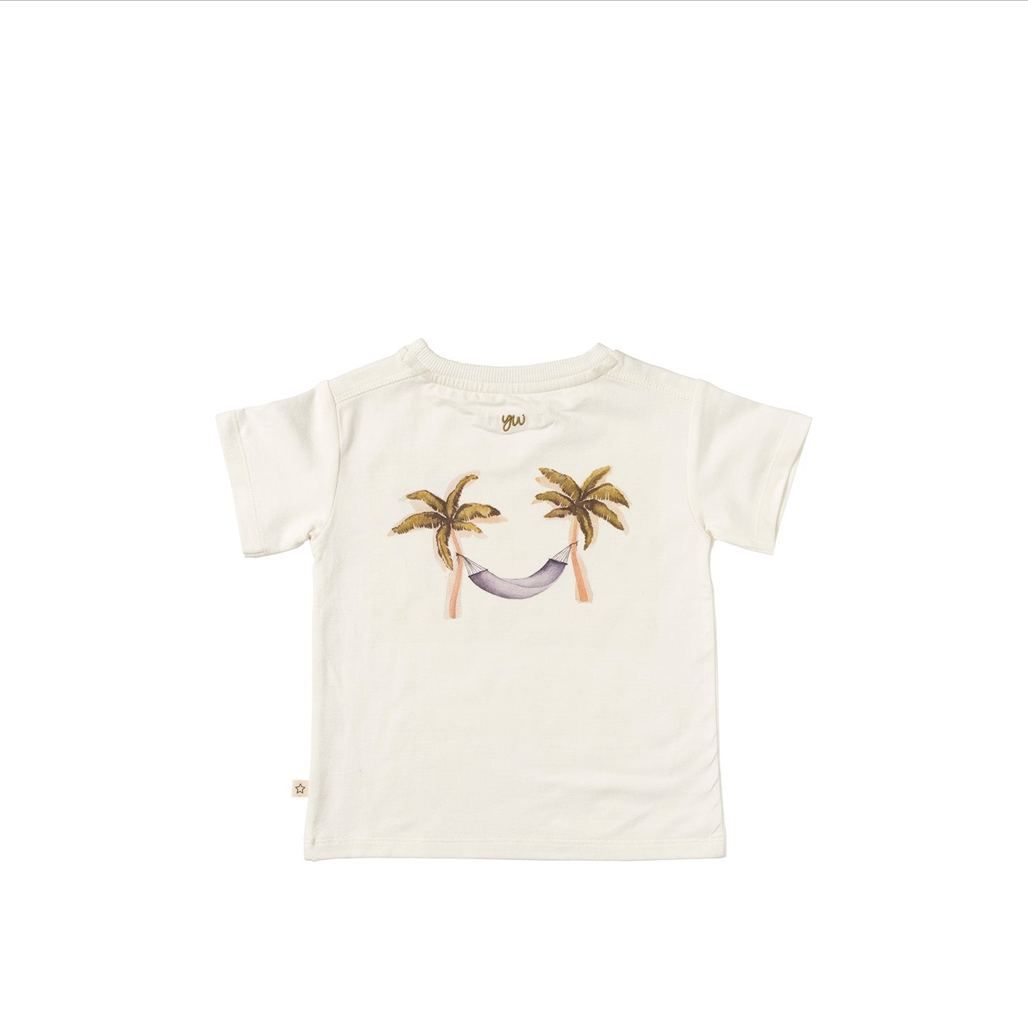 Time for sunsets and palmtrees with the Ezra T-shirt, available from size 80 to 140. The T-shirt is made in a combination of cotton and elastane, giving it a soft and comfortable feel. The Ezra T-shirt features a watercolor palm tree print on the chest that perfectly matches the palm tree and hammock print on the back. Both prints are designed by our design department and therefore completely unique! Also, the Your Wishes logo is subtly incorporated into the neck for the finishing touch! Combine the playful Ezra T-shirt with the Ross shorts and complete the look!