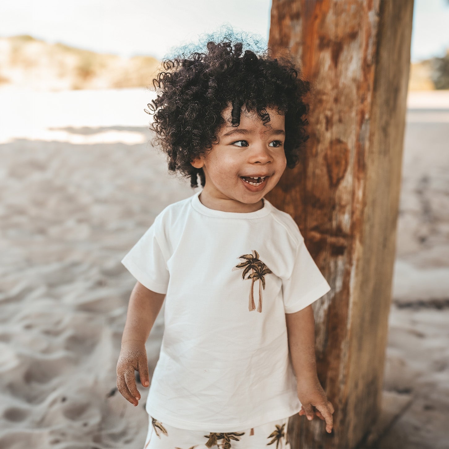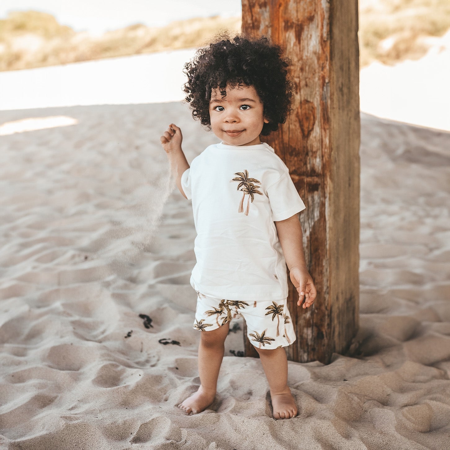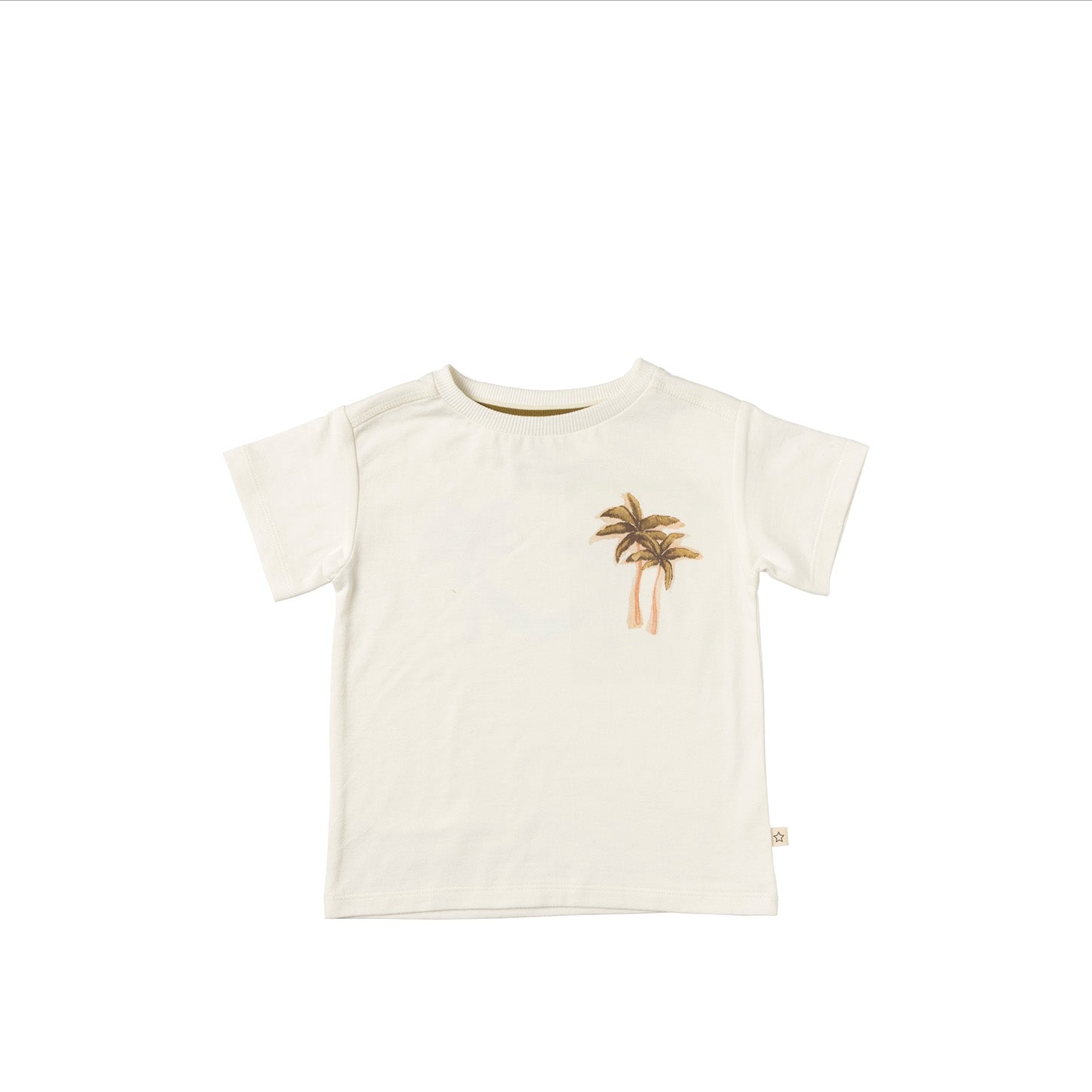 Time for sunsets and palmtrees with the Ezra T-shirt, available from size 80 to 140. The T-shirt is made in a combination of cotton and elastane, giving it a soft and comfortable feel. The Ezra T-shirt features a watercolor palm tree print on the chest that perfectly matches the palm tree and hammock print on the back. Both prints are designed by our design department and therefore completely unique! Also, the Your Wishes logo is subtly incorporated into the neck for the finishing touch! Combine the playful Ezra T-shirt with the Ross shorts and complete the look!