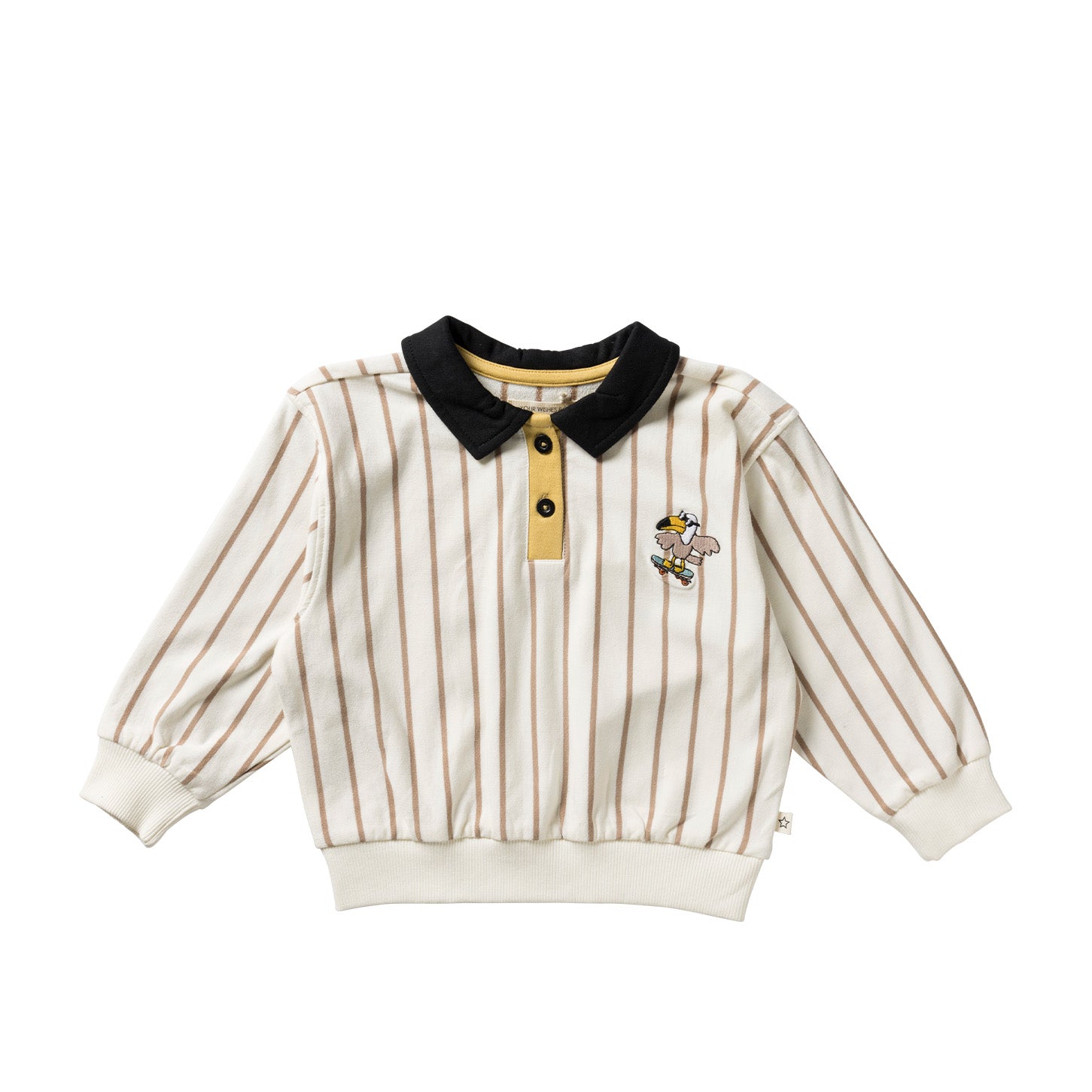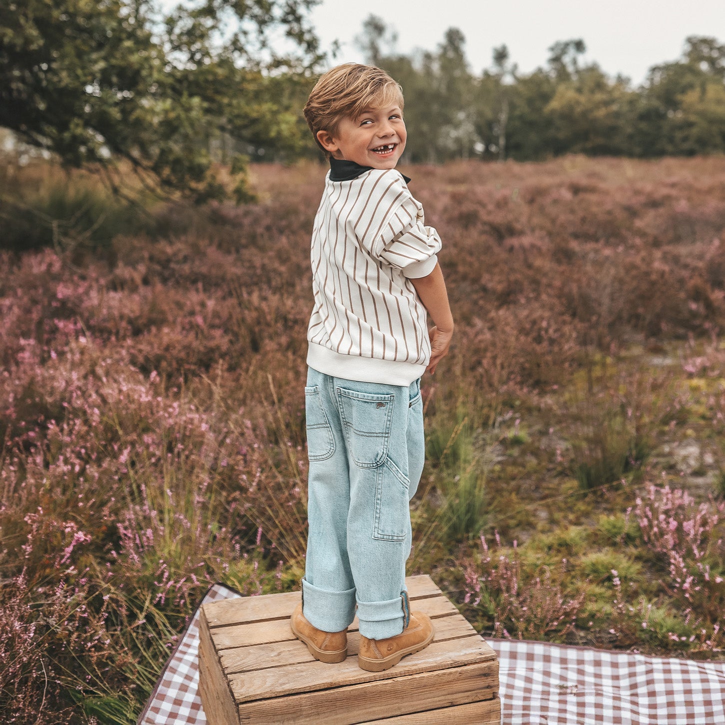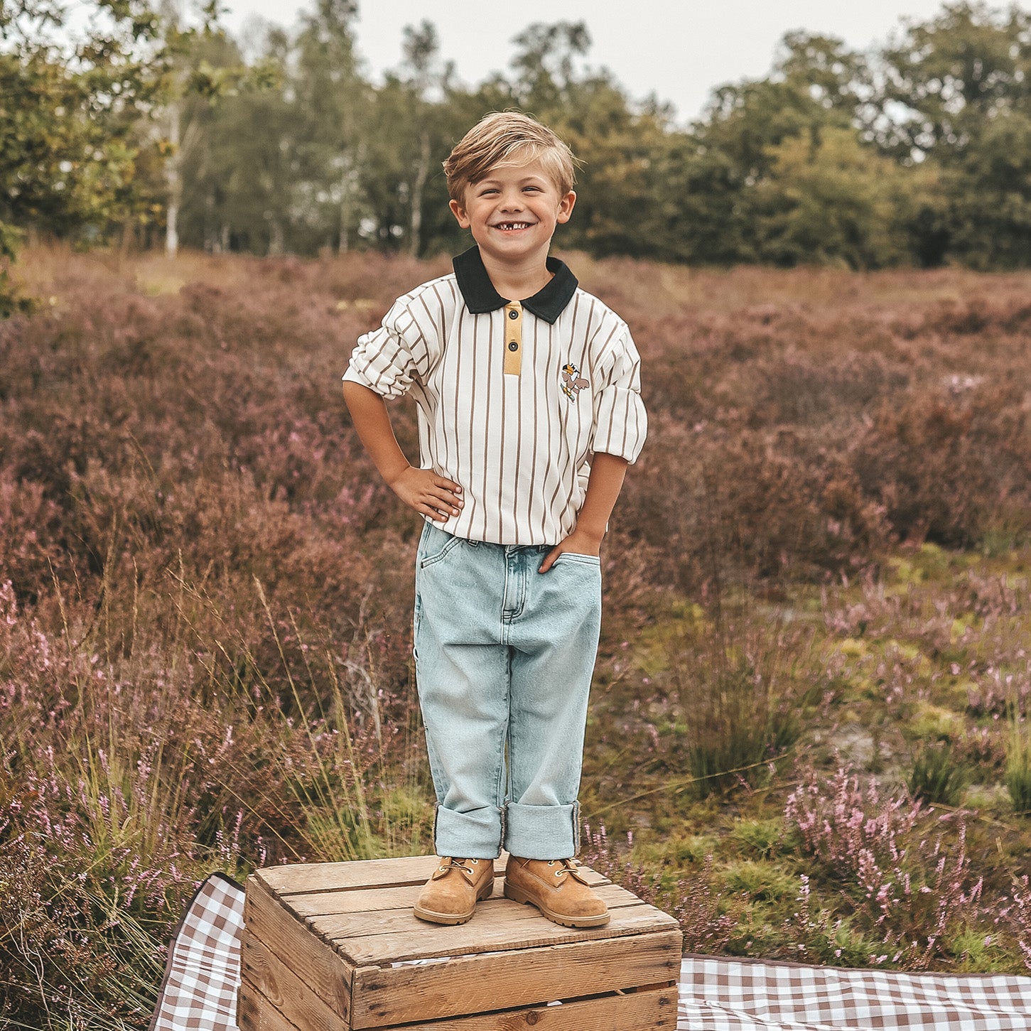 The Fine Stripe Polo Sweater from Your Wishes is the perfect item for stylish and active boys. This sweater effortlessly combines comfort with a playful look thanks to the fine stripes and subtle details. The fresh white tones fit perfectly with the spring and summer season and make this sweater versatile and easy to combine with, for example, the Stretch Twill Cargo Pants . Made from a soft and breathable French Knit fabric, consisting of 95% cotton and 5% elastane, this polo sweater offers a light stretch and a pleasant fit. The ribbed bottom provides a nice finish and keeps the sweater in place, while the small bird print on the chest adds a playful accent to the look.