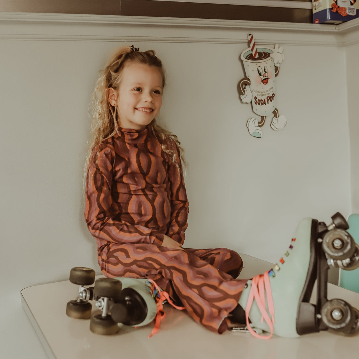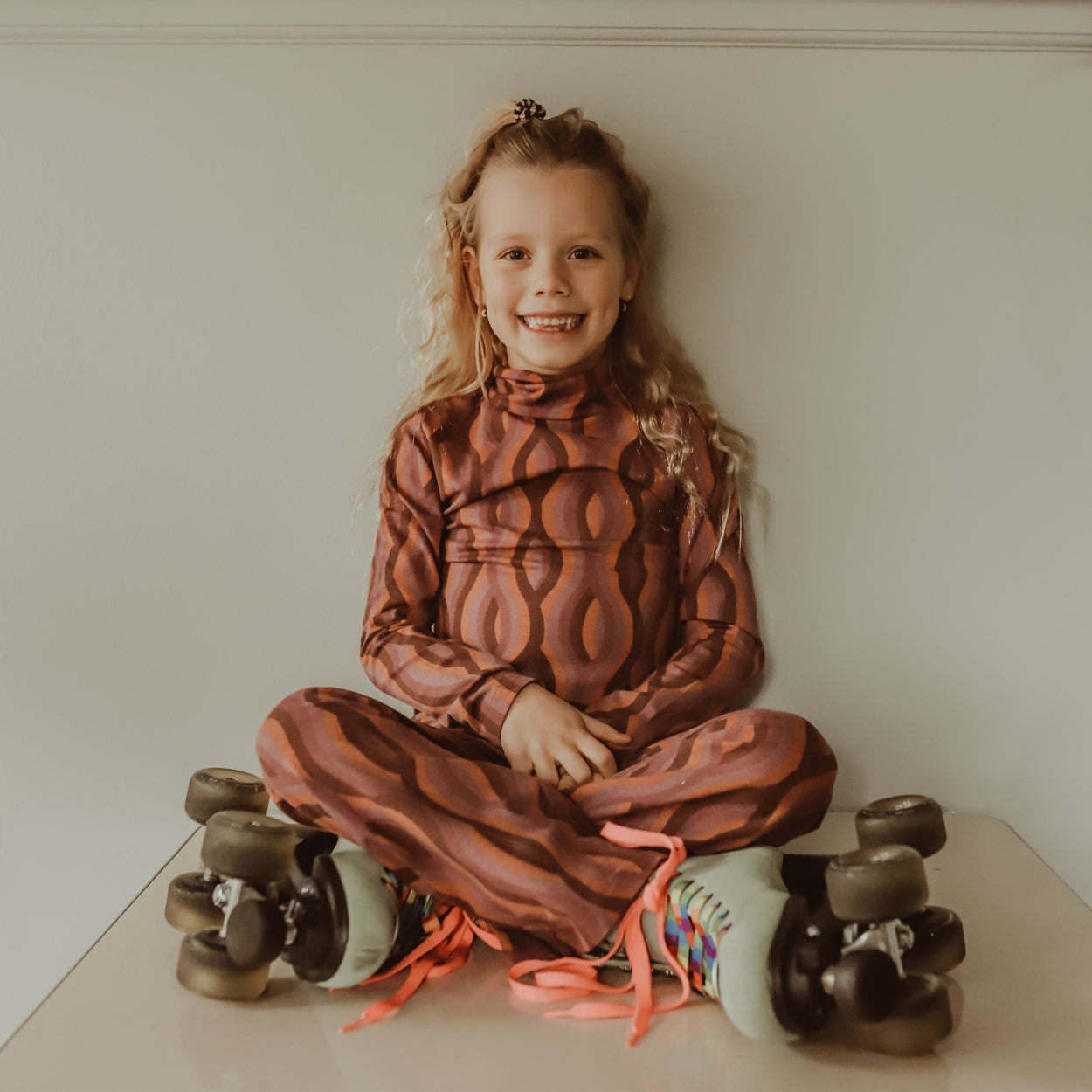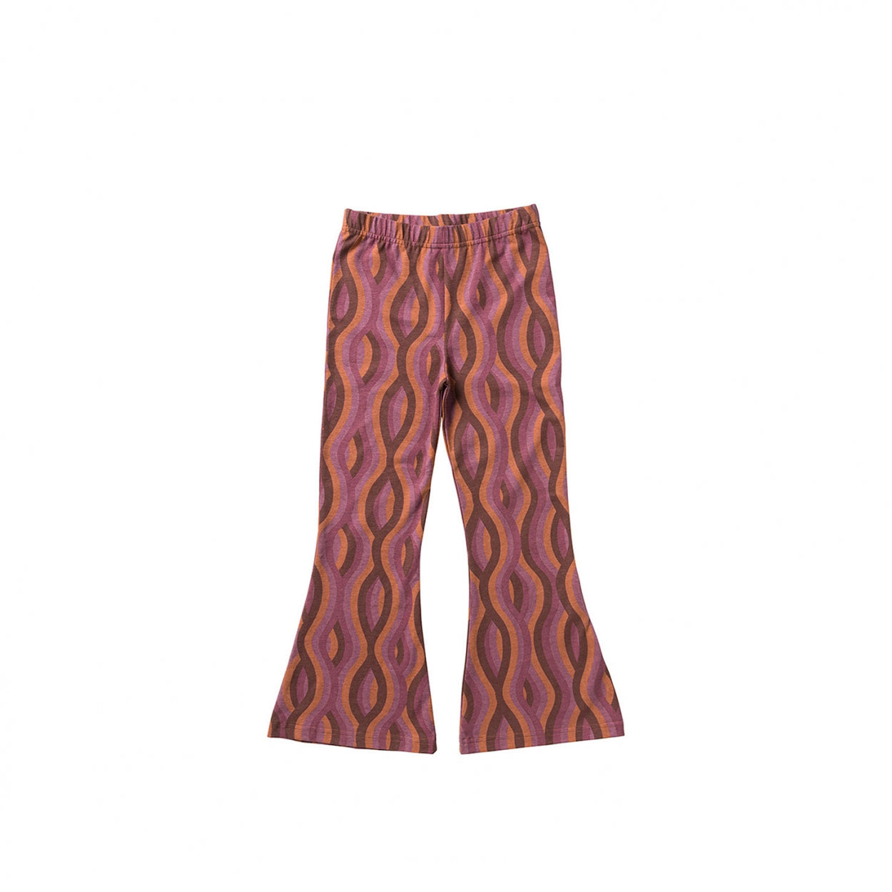 Add a touch of 70's to the wardrobe with the Nikita flared pants, available from size 98/104 to 146/152. The flared pants are made in a cotton fabric but do stretch well, giving them the nicest fit. The pants will be nice and tight around the thighs, but are wide to really create that flared look. In addition, it is also very comfortable, especially with the elastic waistband. The groovy print makes the Nikita a showstopper and therefore the perfect statement item for your closet! Combine the Nikita flared legging with the Alana shirt to create a co-ord set!