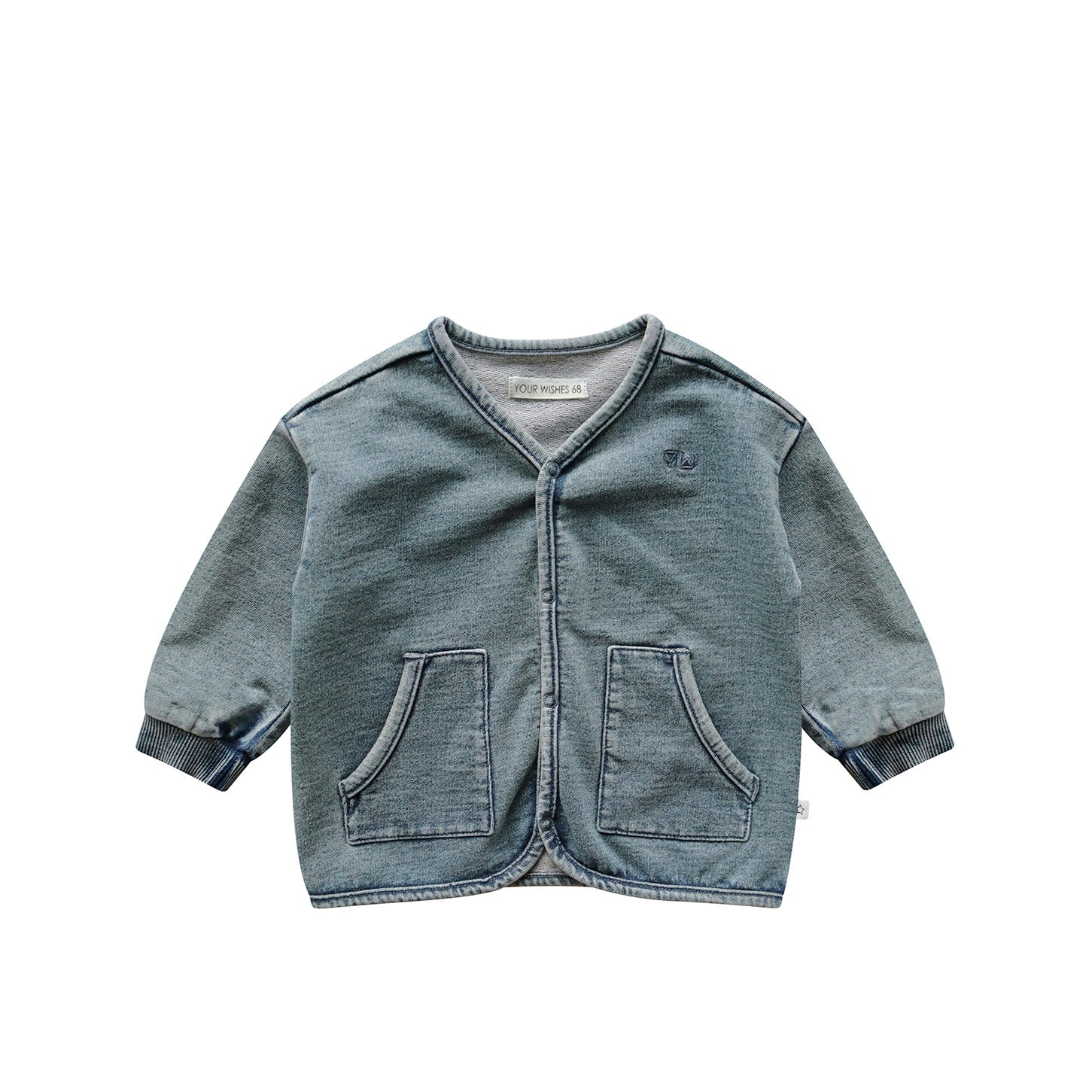 Denim for your baby? Then go for our knitted denim items! This knitted denim cardigan is super comfortable for your newborn baby. The front of the cardigan closes with snaps. This makes the cardigan easy to put on and take off.