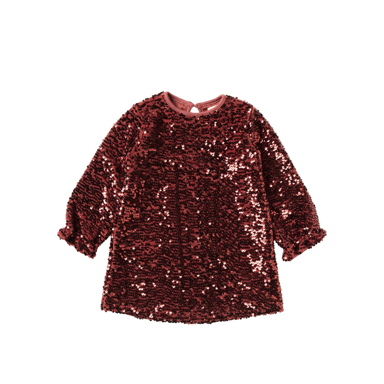 It's your little one's time to shine with the Huyen glitter dress, available from size 80 to 146/152. This red sequin dress has an underdress that is attached to the inside of the sleeve, so it is nice to wear and gives just a little extra warmth. The dress can easily be put on over the head, because at the back the neckline hole can be enlarged by undoing a button with elastic loop. The ends of the sleeves have a subtle ruffle effect as they are finished with elastic. One thing is for sure: with the Huyen sequin glitter dress your child will steal the show! The perfect dress for the holidays!
