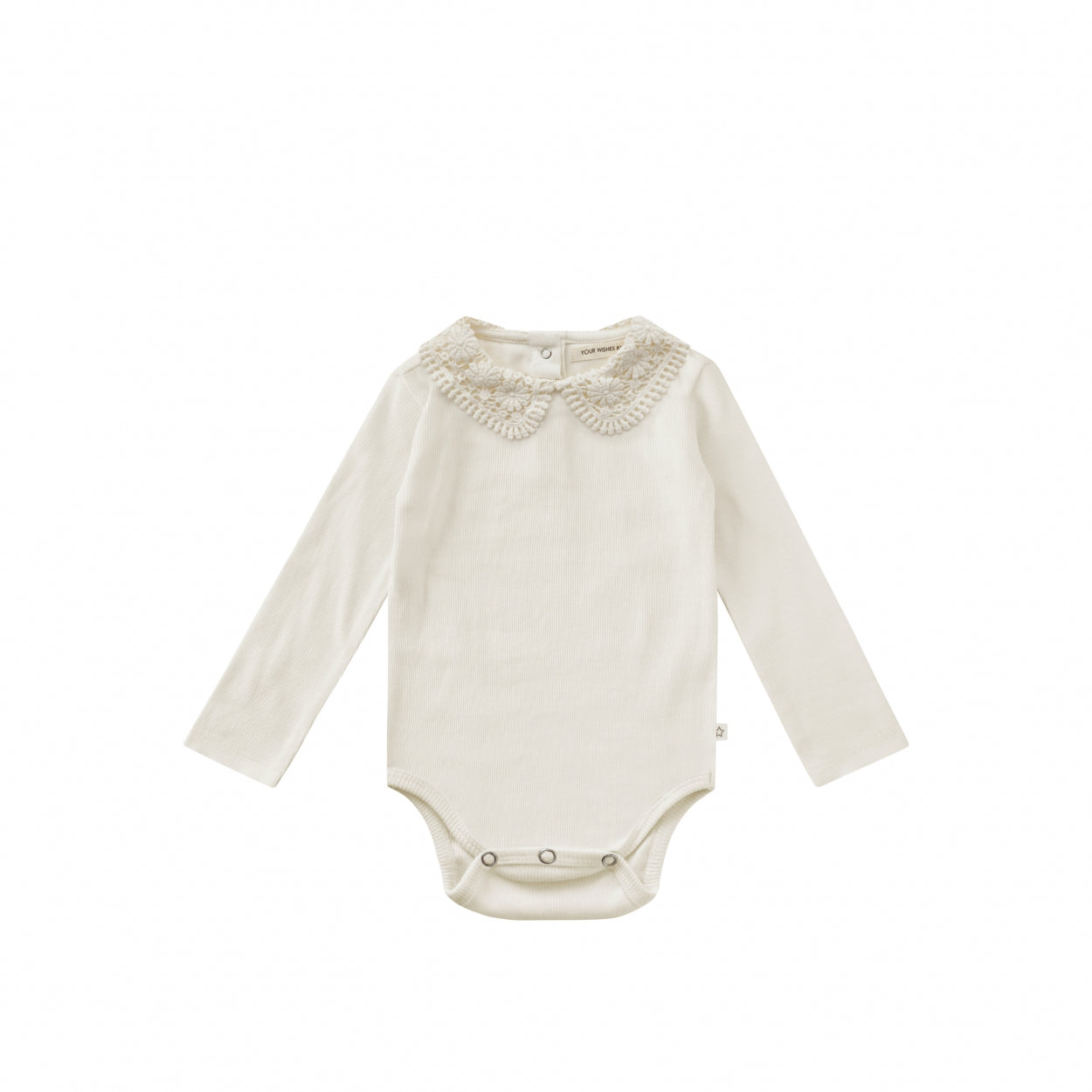A romper made of rib jersey quality. The romper features long sleeves and a crocheted collar with button closure. A beautiful item for your newborn. |
