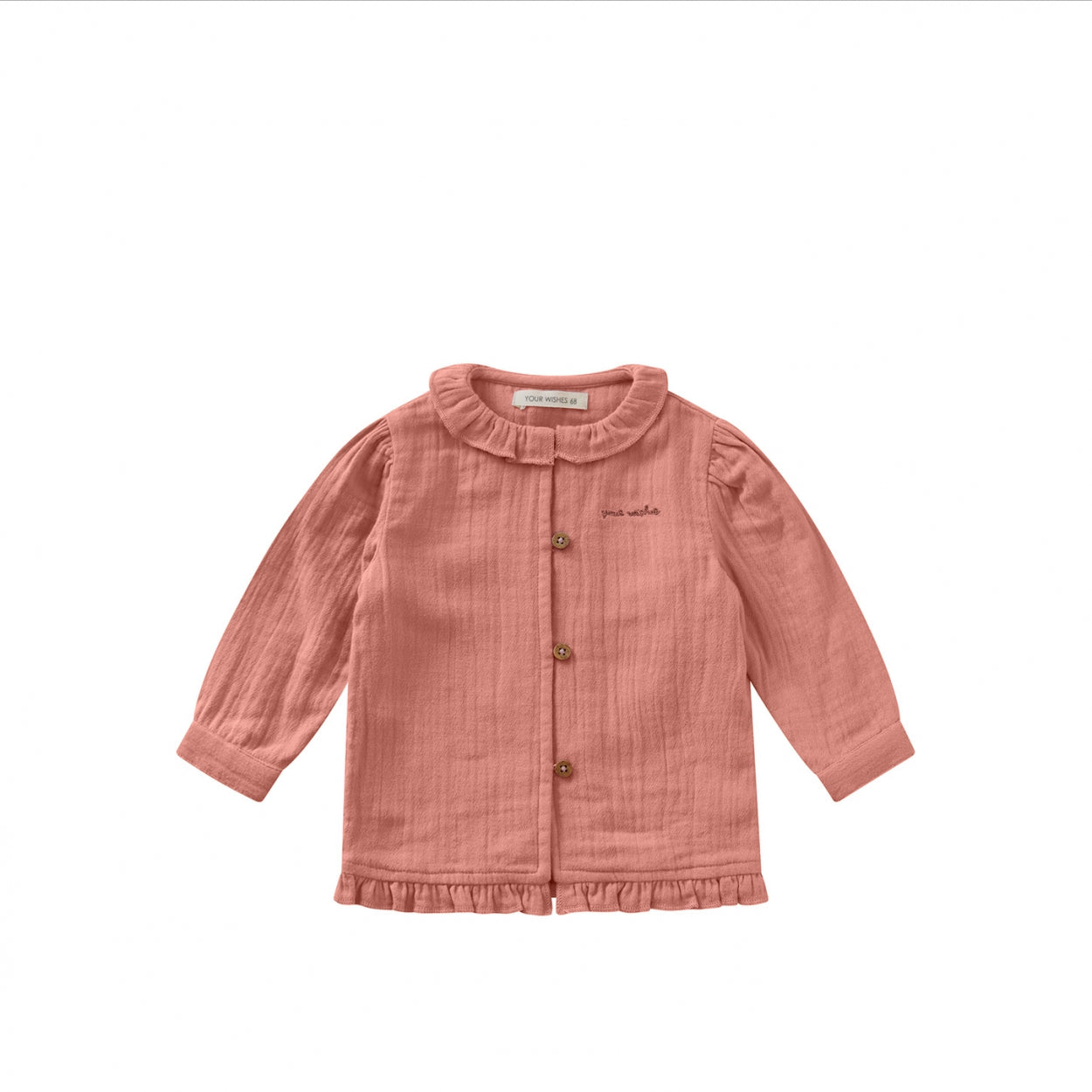 A breezy top made of muslin quality in a pink color. The top has long sleeves and wooden buttons on the front. The neckline and bottom of the top are finished with ruffles. |