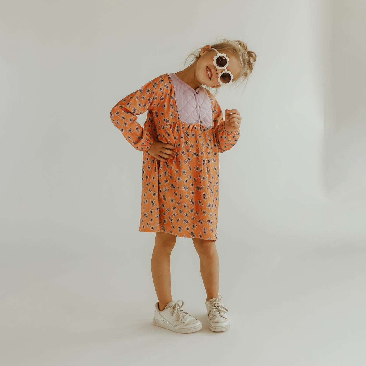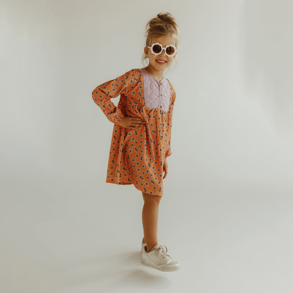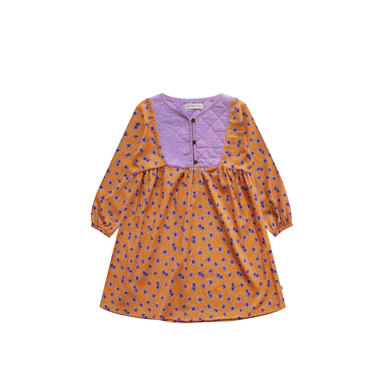 This dress is a beautiful and colorful addition to your child's wardrobe. The bright orange color with lilac flowers is a great choice to brighten up your child's summer wardrobe. The dress has an A-line cut and a button front closure. The bright orange color and vibrant lilac flowers make it an eye-catching garment guaranteed to attract attention.