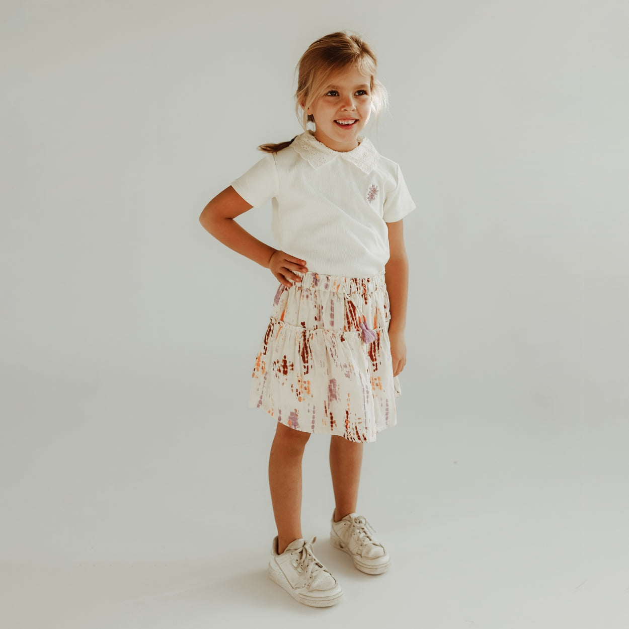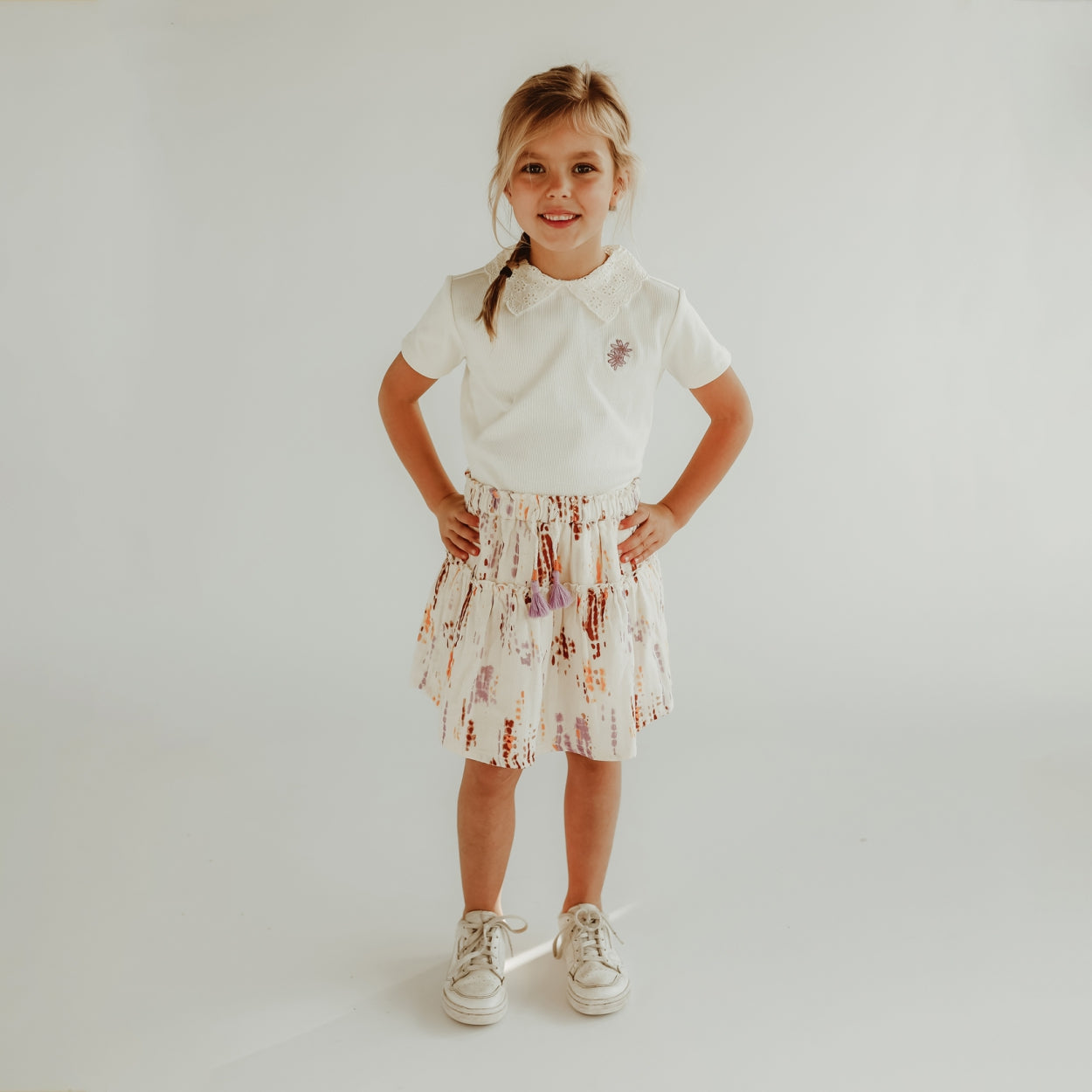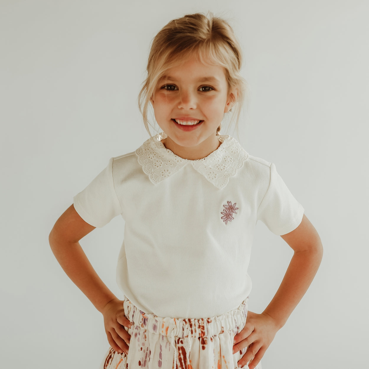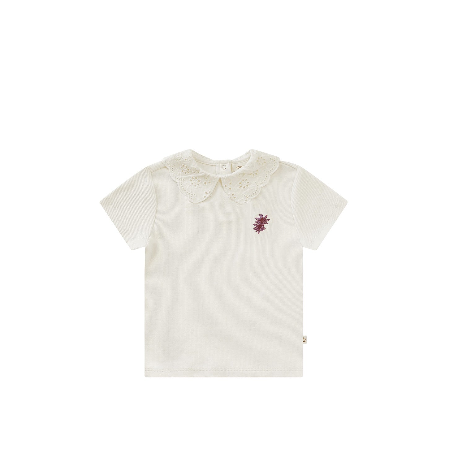 A t-shirt with a crocheted collar. The t-shirt has a fine rib quality and an embroidered floral detail on the front. This shirt is nice to combine with the other items from the collection.