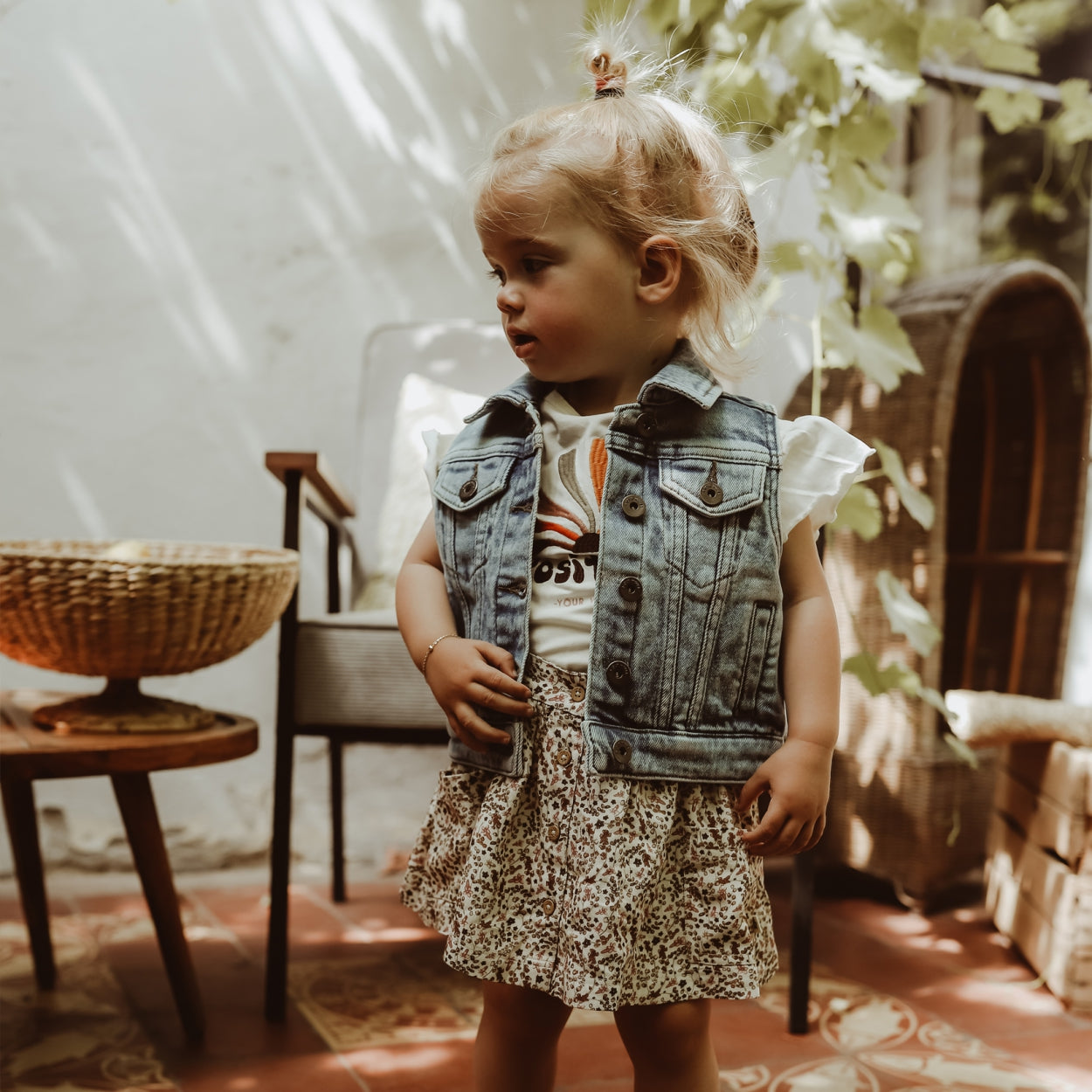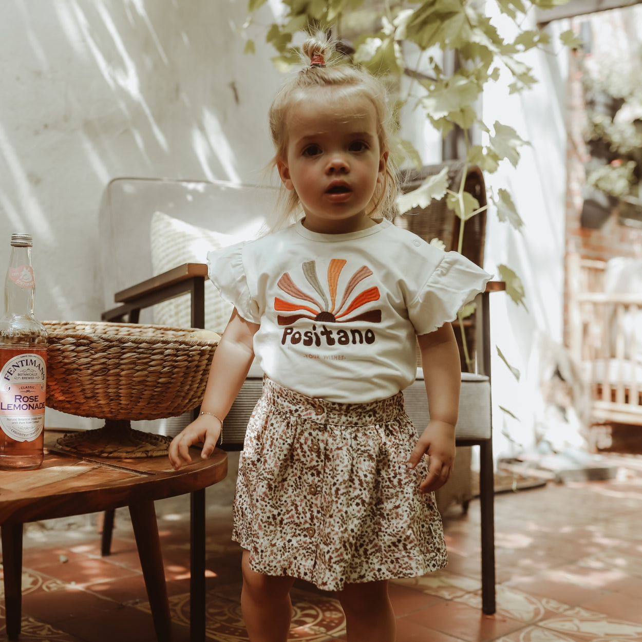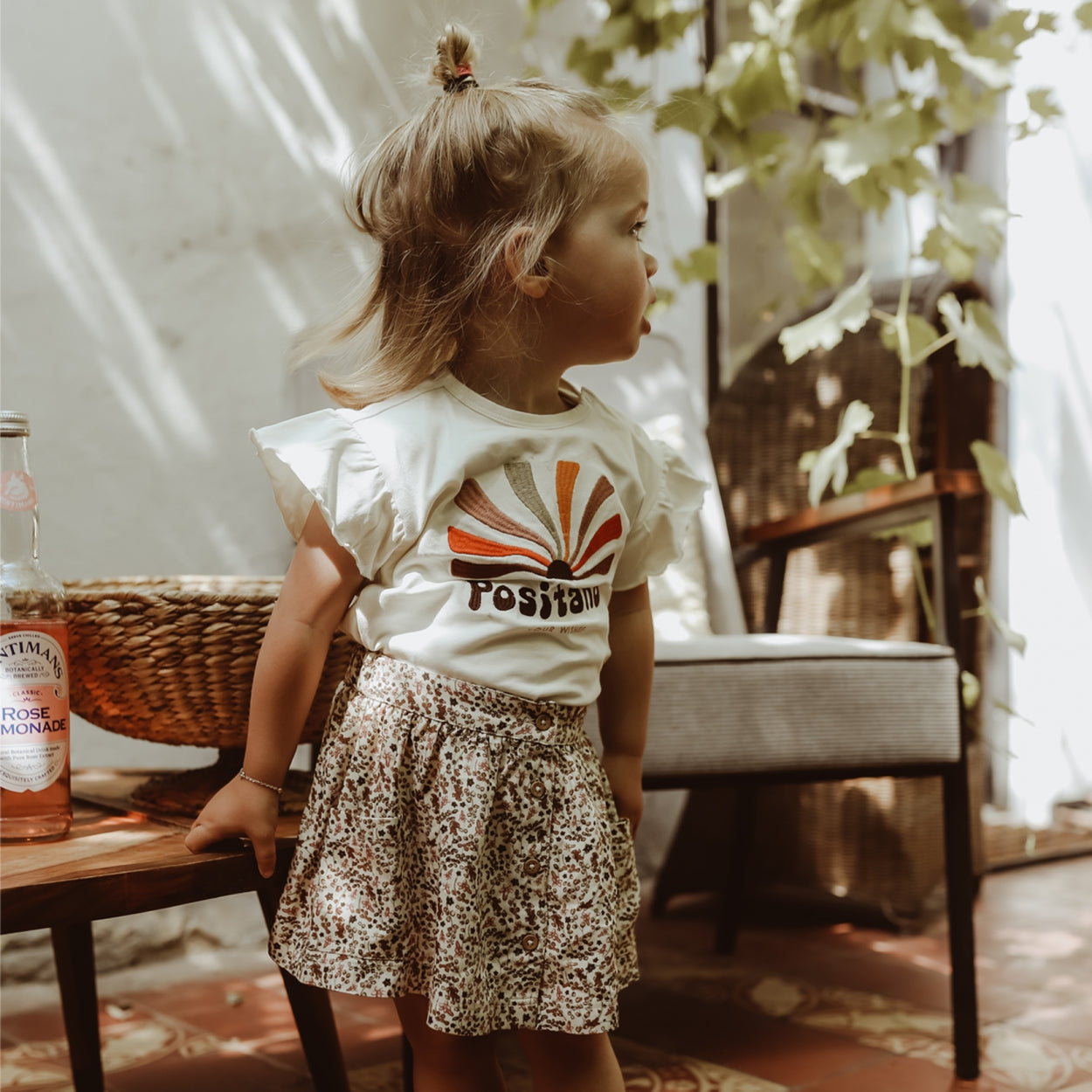 A plain round neck shirt with wide ruffle sleeves. The shirt comes with an embroidered print with colors that return in the collection. A nice item for girls that you can easily combine. |