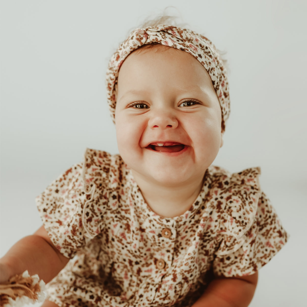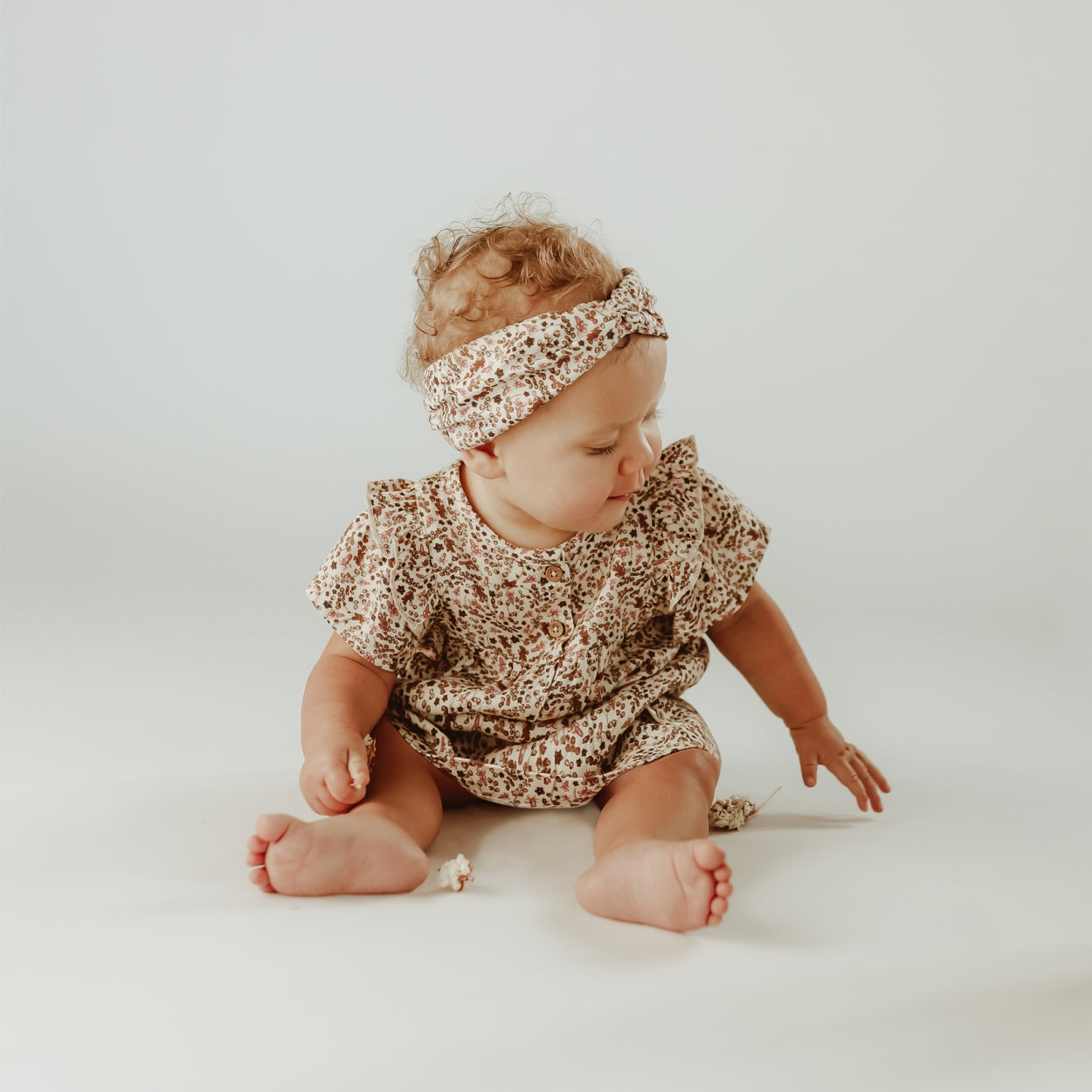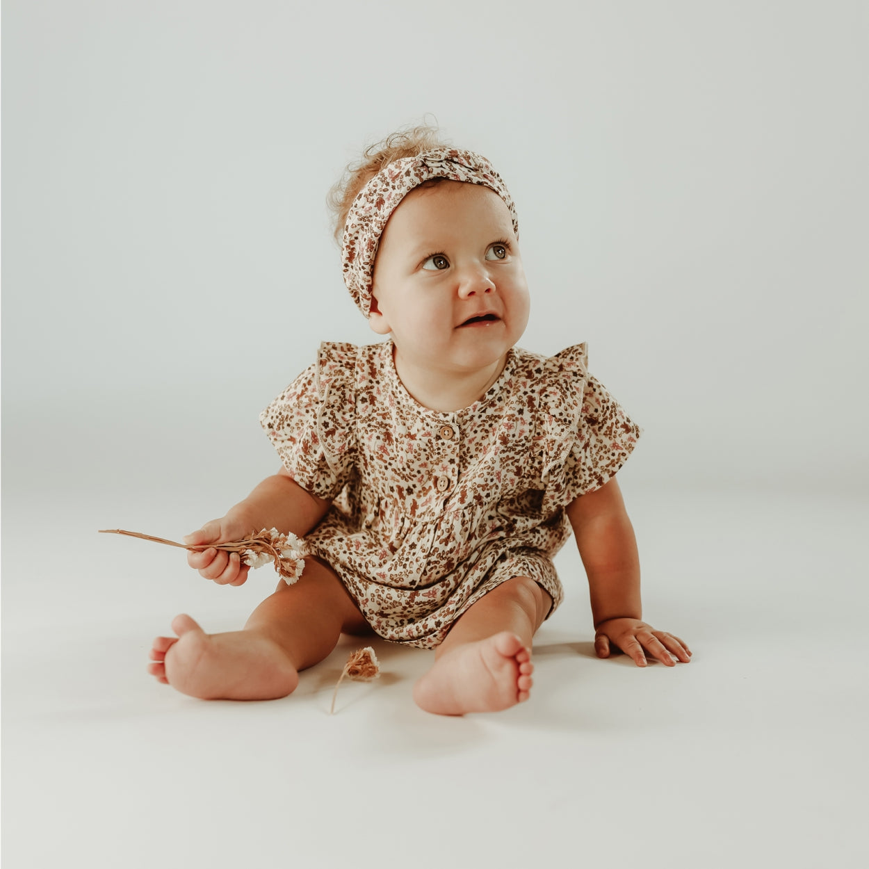 A newborn dress with floral print in warm colors. The model features a button closure. The dress has a round neckline and short sleeves with ruffles. |