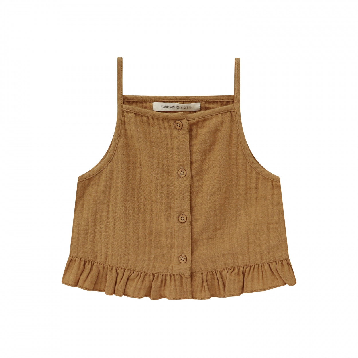 A short top in a solid sand shade. The top has an airy muslin quality. It features thin shoulder straps, wooden buttons at the front and ruffles at the bottom. This romantic item is nice to combine with the matching muslin shorts.