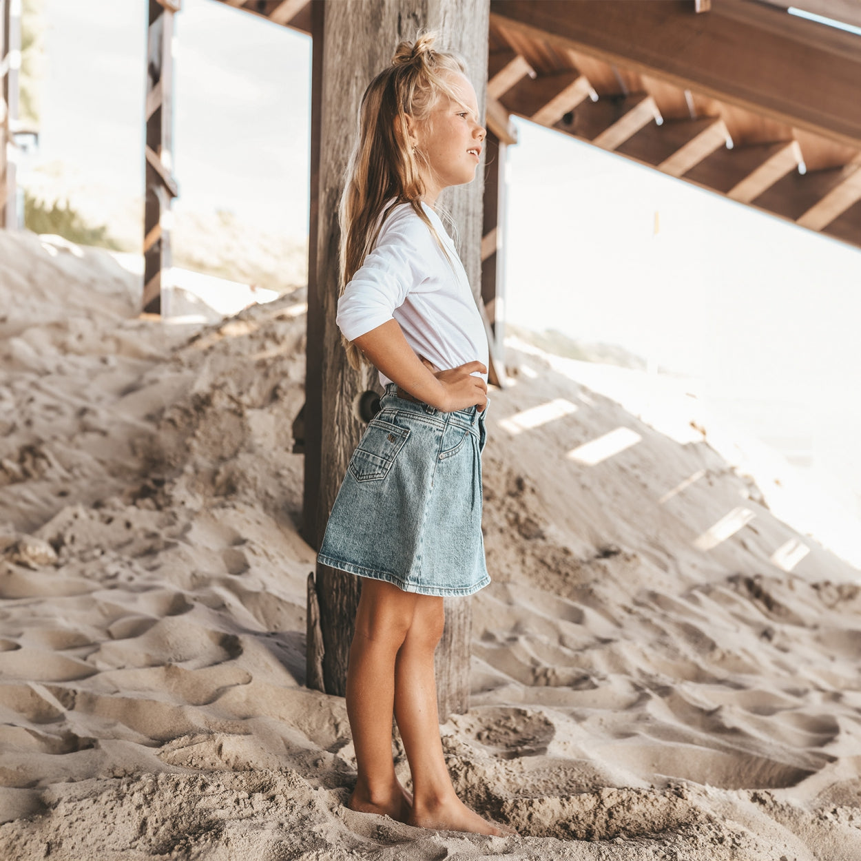 The Jolene denim skirt is an ideal item to wear throughout the seasons and is available in sizes 80 to 140. The fabric of the skirt is slightly pleated at the front and the Jolene skirt can be combined endlessly due to the light wash! The denim skirt closes with a zipper with a hook and eye closure. There is an elastic incorporated into the waistband of the Jolene denim skirt to ensure that it can be tightened to better fit the skirt to the child's body. This way you can be sure that the skirt has the right fit and that your child will look stylish! Finally, the denim skirt is finished with two side pockets and two back pockets. The Jolene denim skirt is a bestseller from the Your Wishes collection for good reason!