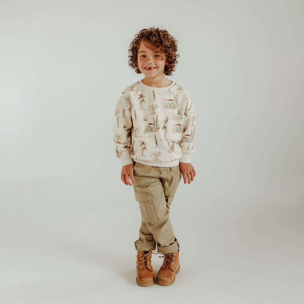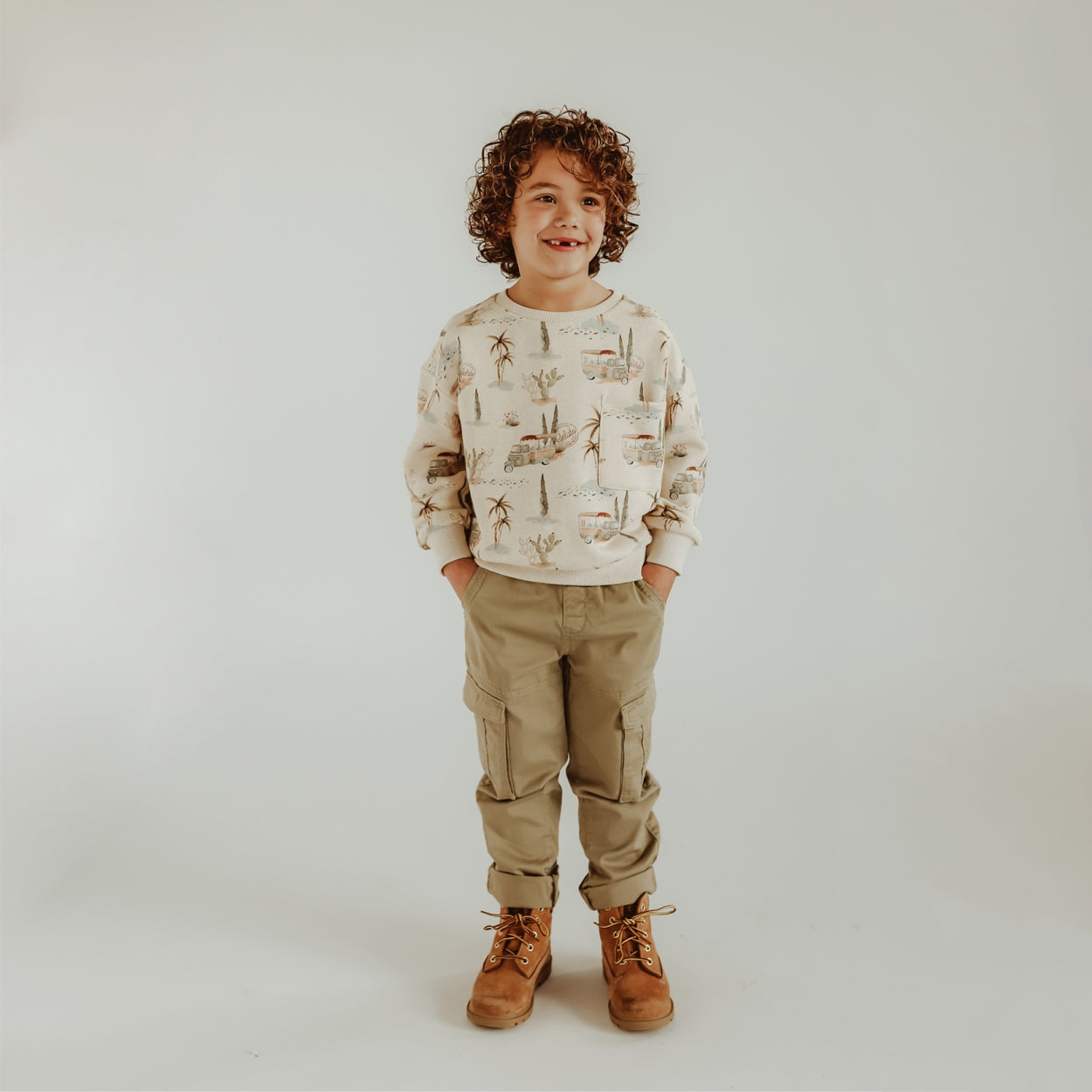 A cool pair of cargo pants for baby and kids. The pants have side pockets, cargo pockets and feature a drawstring in the waistband that allows you to adjust the cargo pants to your needs. The model has folded legs and is very suitable for cool boys and girls! |