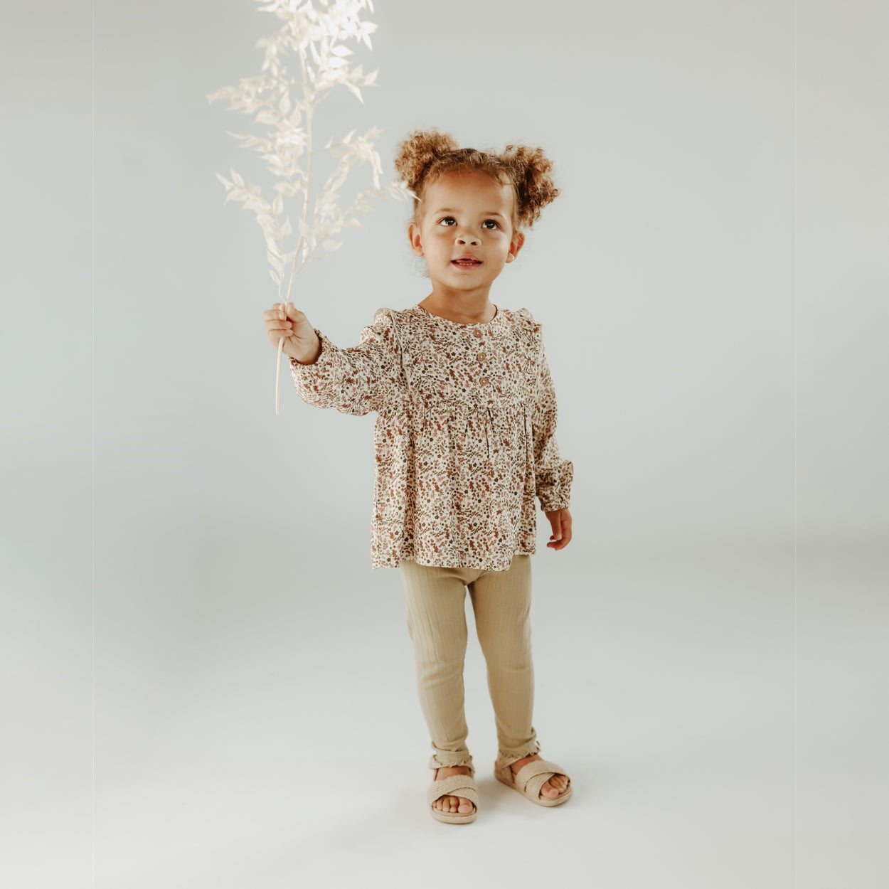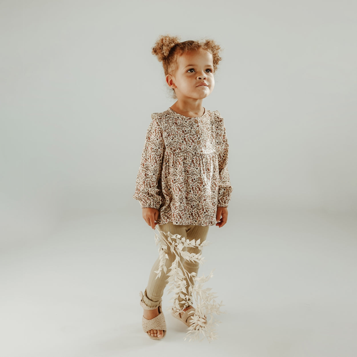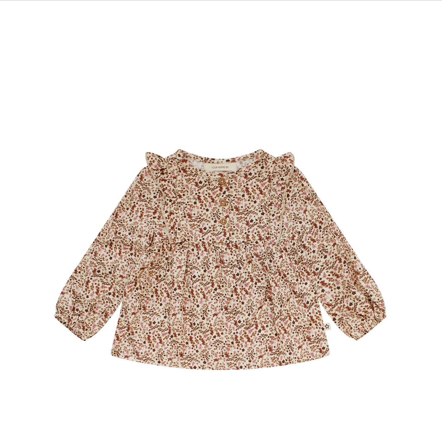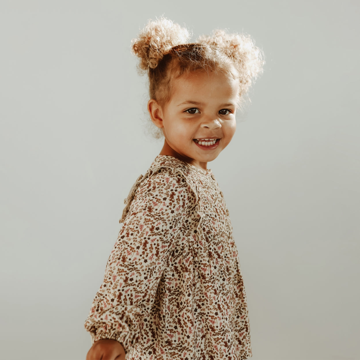 A floral print dress for newborn and baby. The model features a button closure. The dress has a round neckline and long sleeves with ruffles. |