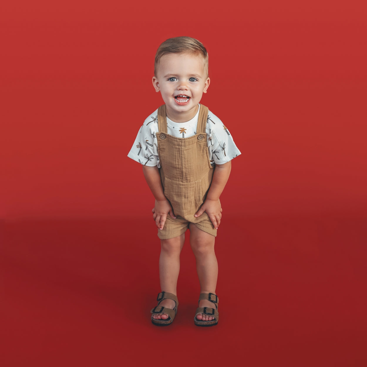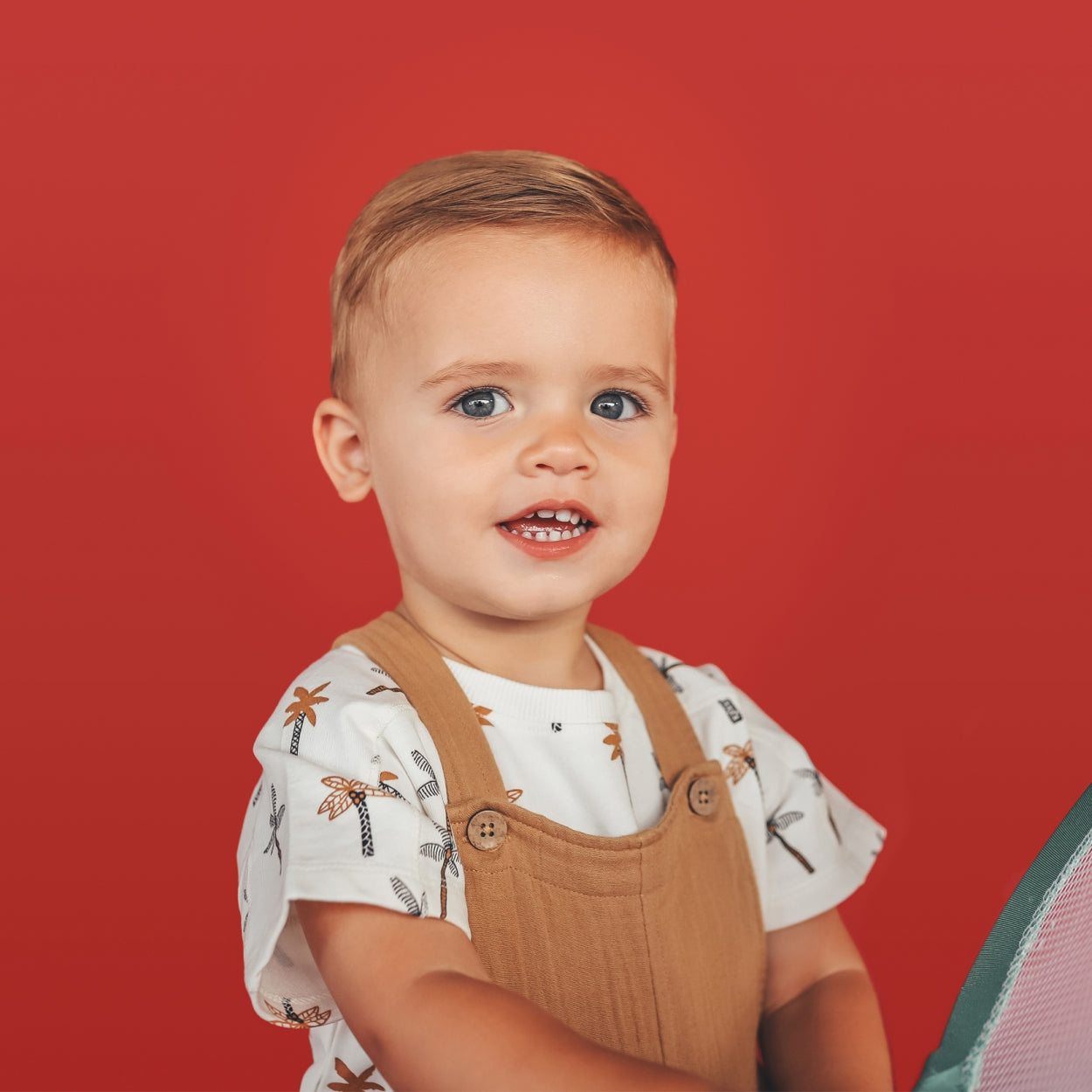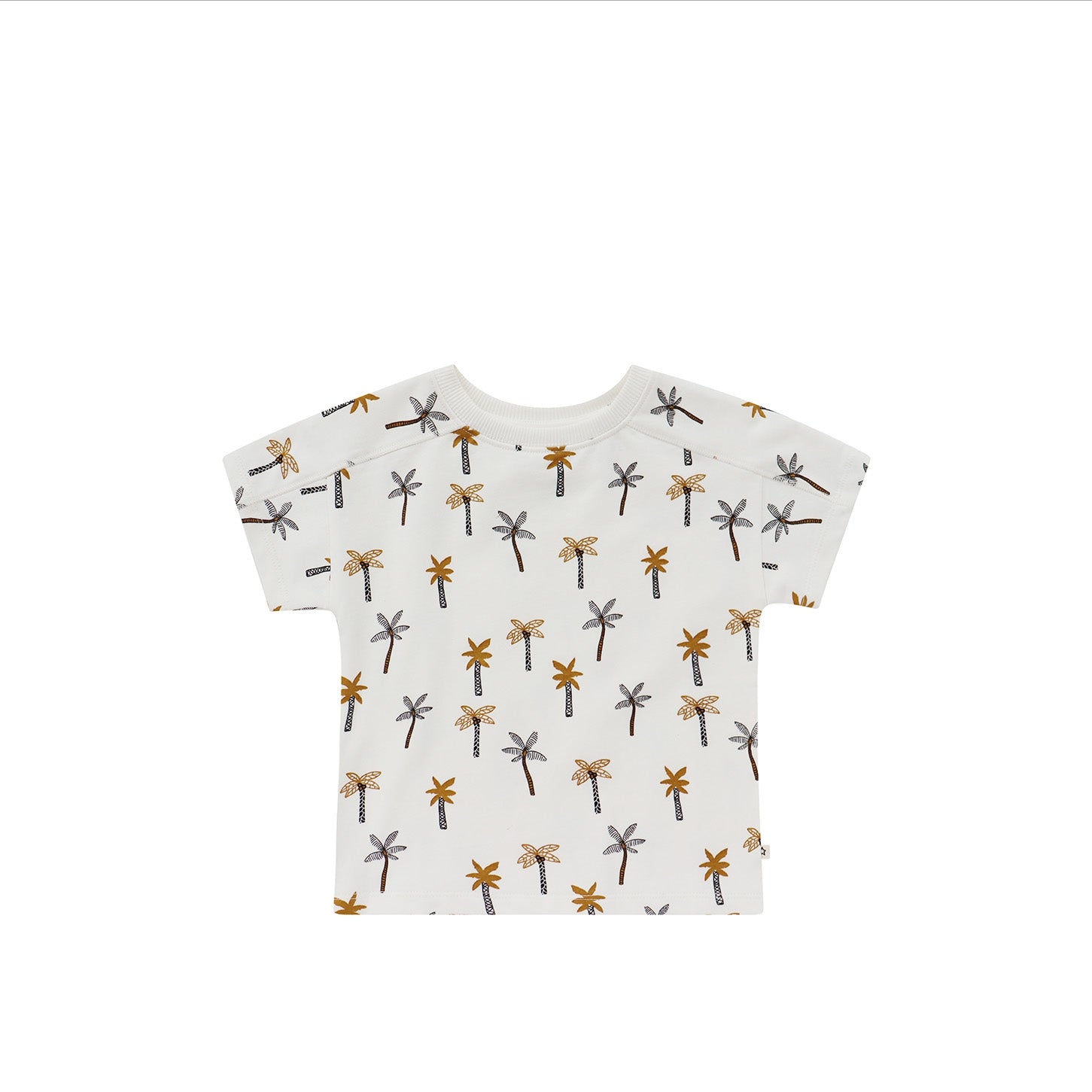 This short sleeve t-shirt with palm tree print is perfect for warm days. The allover print of palm trees gives the t-shirt a summer look and a playful touch. The shirt is made of soft cotton that feels comfortable on your child's skin.