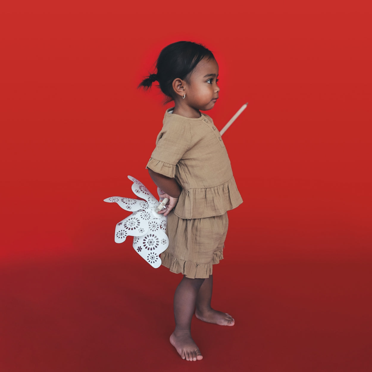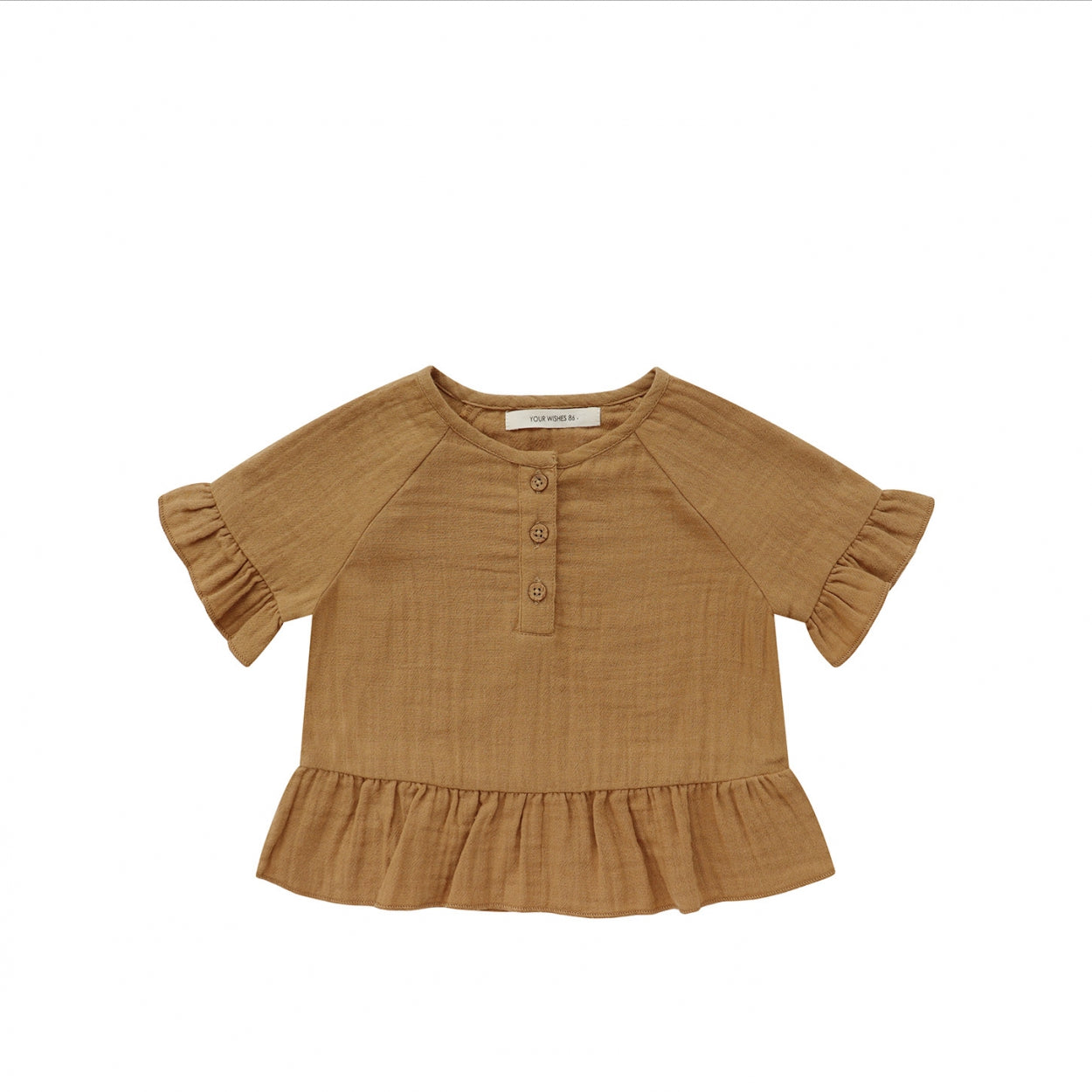 A peplum top made of mousseline in a plain sand shade. This airy top with short sleeves has a strip at the bottom that flares out beautifully. The peplum top has ruffles at the bottom. Your child will shine in this peplum top!