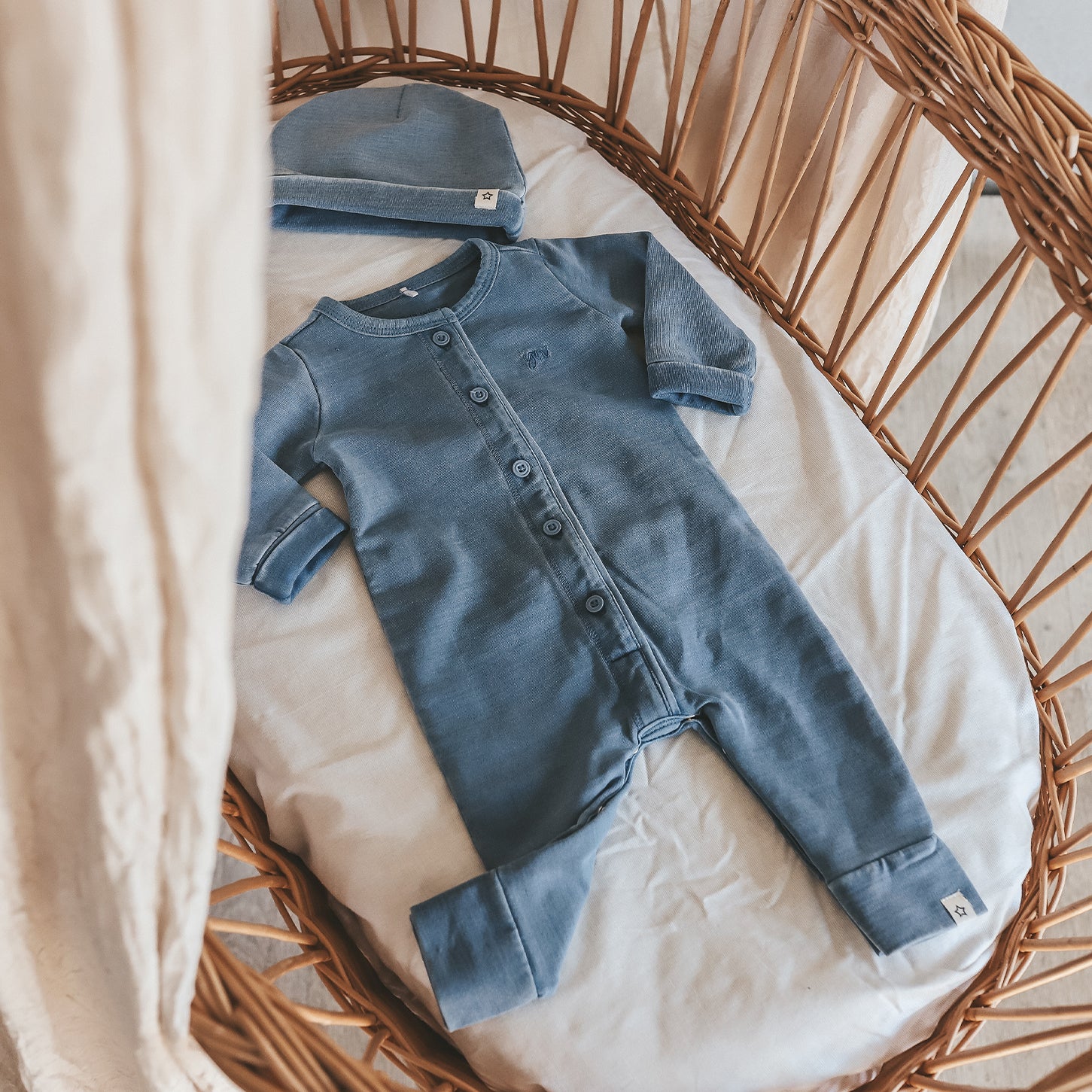 Denim voor je baby? Kies dan voor onze comfortabele knitted denim items! Dit knitted denim mutsje voelt heerlijk zacht aan dankzij de combinatie van katoen en elastaan, perfect voor de gevoelige huid van jouw pasgeboren baby. Door de stoere wassing krijgt het mutsje een unieke uitstraling en is het zowel stijlvol als praktisch. Het mutsje is verkrijgbaar in maat 50/56 en 62/68. Combineer het mutsje met de bijpassende Knitted Denim Onesie en jouw kleintje is helemaal klaar voor een nieuwe dag vol avonturen!