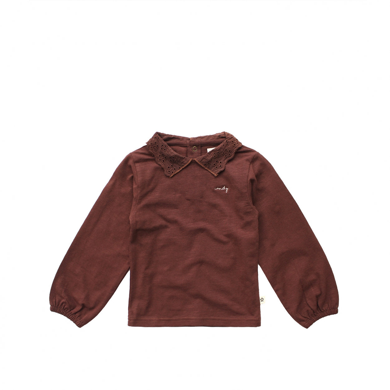 * Finished with lace collar with embroidered details and candy embroidery on the chest.