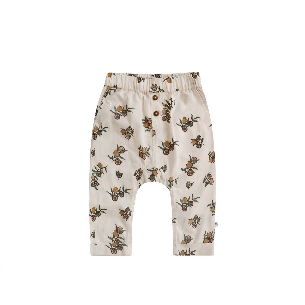 These pants made of cotton fabric have a linen-like look & a beautiful soft colored fruit print. The pants have a comfortable fit so your little one can roll or crawl comfortably.