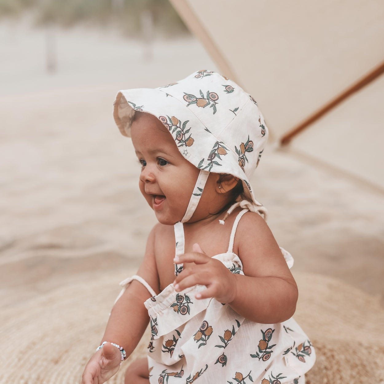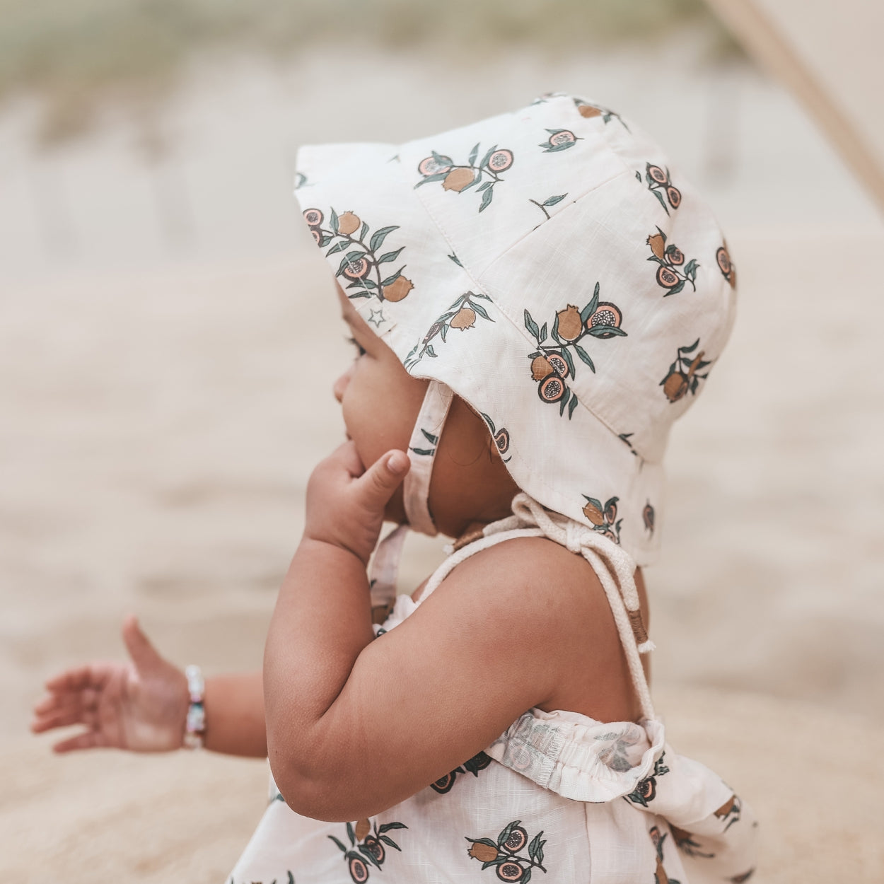 This sun hat made of cotton fabric has a linen-like look & a beautiful soft colored fruit print. The drawstrings keep this sun hat in place. Ideal for summer to protect your little one from the sun.