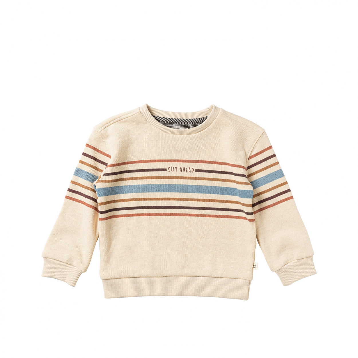 Stay ahead with the Marco sweater, available from size 80 to 146/152. This sweater is made in a combination of cotton and elastane and is finished with elastic at the bottom of the sweater and ends of the sleeves. This combination not only provides a comfortable fit, but also keeps out the cold to keep your little one as warm as possible! In addition, the sweater has a playful print of different color stripes and the text stay ahead on it. Combine the Marco sweater with cool jeans and sneakers and complete the cool look!