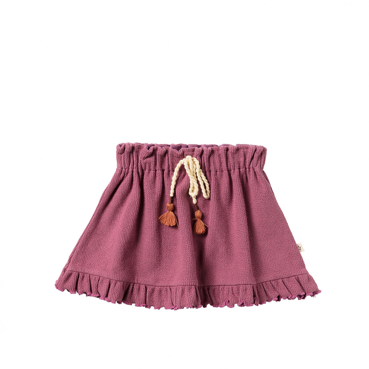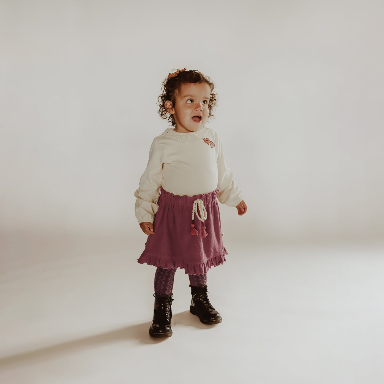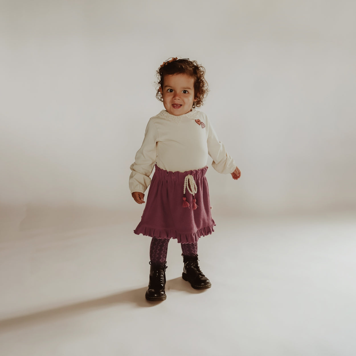 The Marilyn skirt is truly an eye-catcher and available in sizes 80 to 98. The skirt is made of a stretchy jersey fabric and is a bit thicker, making it the ideal skirt for the colder days. Due to the elastic waistband, the skirt is very comfortable and also stays well around the hips. The bow detail on the front of the skirt in combination with the ruffle bottom completes the look. Your child will look like a real fashionista when she wears the Marilyn skirt! Complete the look and combine the Marilyn skirt with the Nadine shirt.