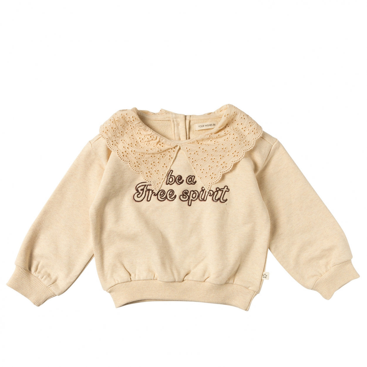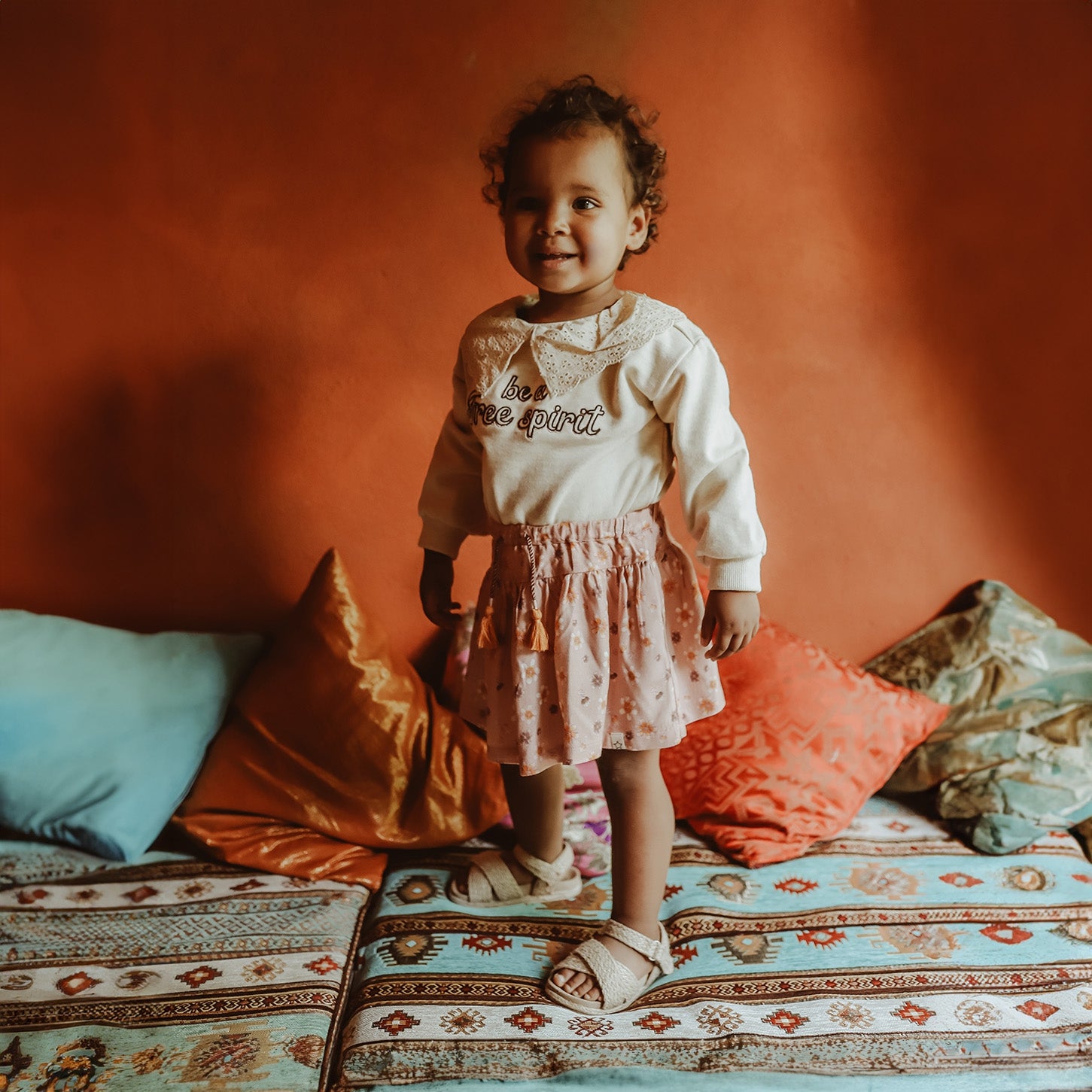 Be a free spirit with the Marley sweater, available from size 80 to 140. The sweater is made from a combination of cotton and elastane and is of course most noticeable because of the large collar with embroidered details. The quote be a free spirit is embroidered on the chest, which also contains a subtle glitter. Because the print is embroidered, it will not rub off or fade through washing and your child can enjoy this sweater for as long as possible! The ends of the sleeves and bottom of the Marley sweater are finished with elastic, to keep the cold out but also for the nicest fit. Finally, the Marley sweater is finished with a button closure at the back of the neck. This way the shape of the collar remains the best and the sweater can easily be put on and taken off over the head. It is not without reason that the Marley sweater is one of the Your Wishes favorites of this season!