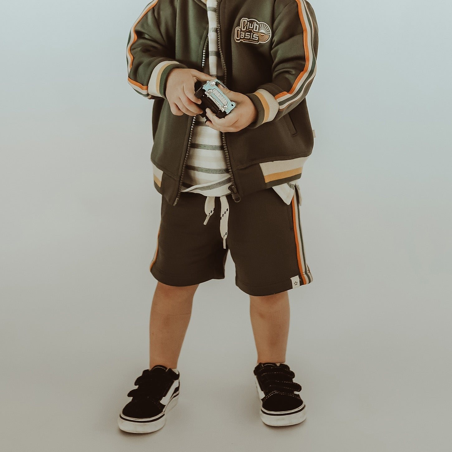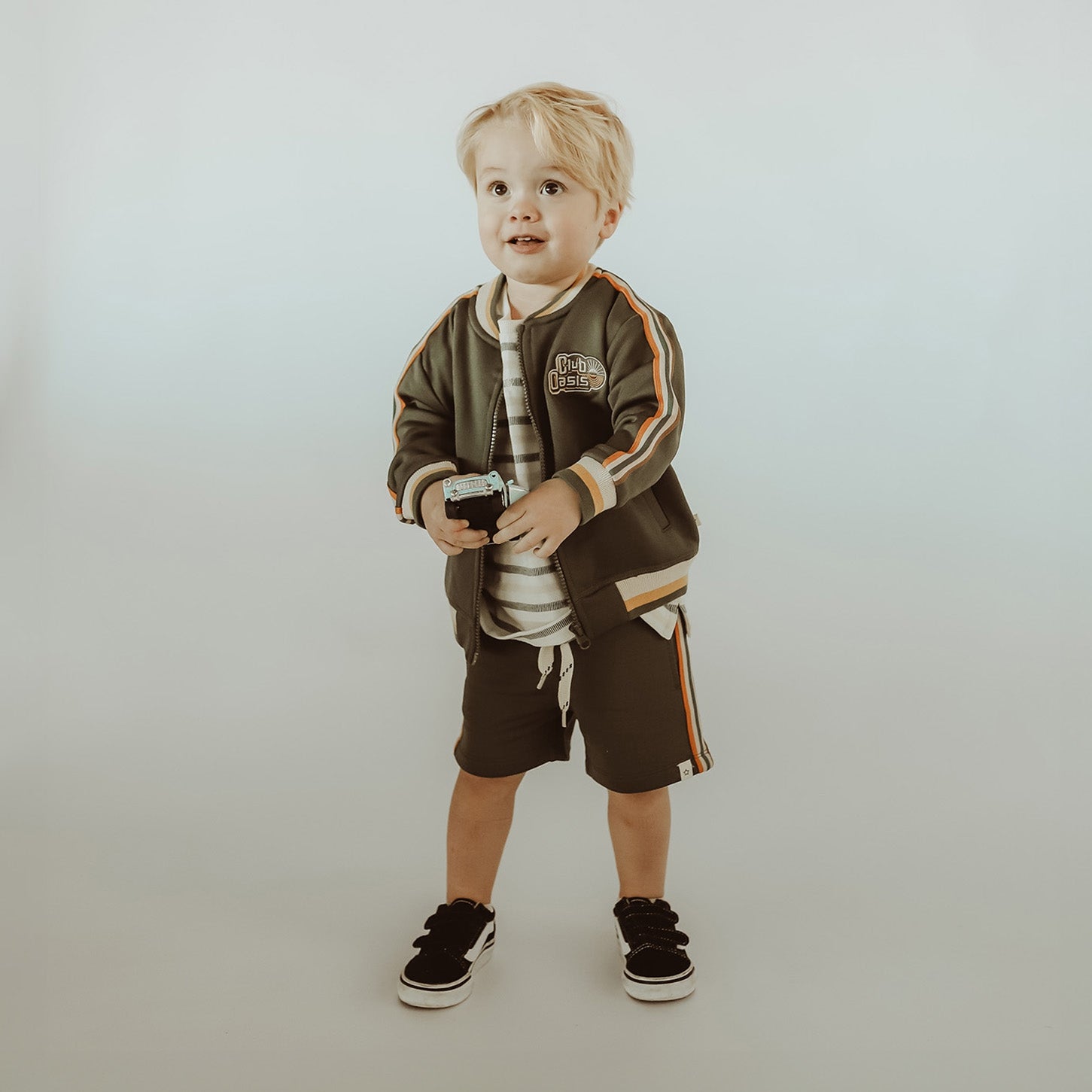 The cool Parra short is the perfect combination between comfy and chic and available from size 80 to 140. The short is made of a combination of cotton and polyester and has different cool color stripes on the side of the trouser legs. The Parra shorts have an elastic waistband with an additional drawstring. This ensures that the shorts are the perfect fit for your child. In addition, the shorts are finished with two side pockets and one back pocket. The Parra shorts are the perfect match with the Percy cardigan and together they form a super cool co-ord set. Have you already added these items to your shopping cart?