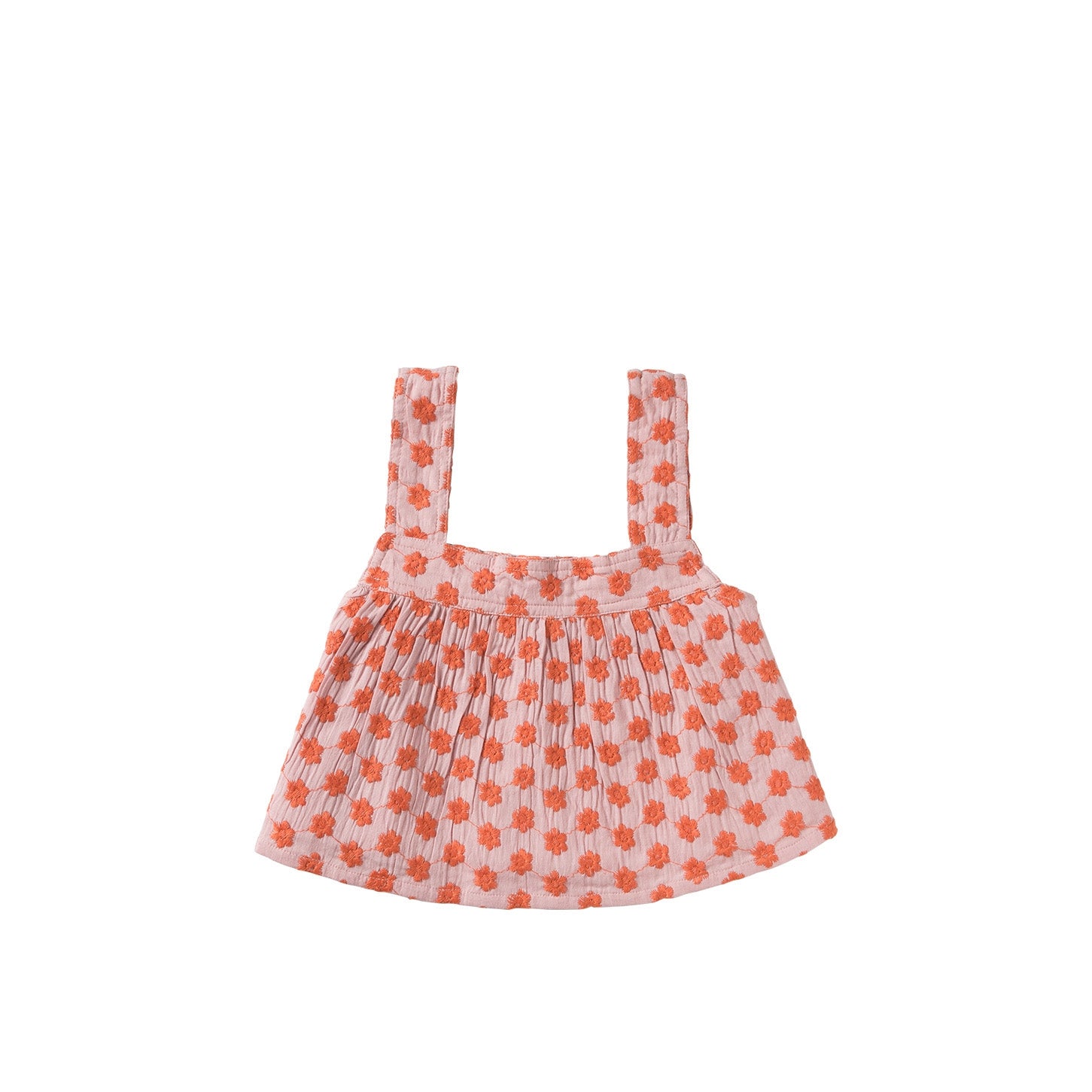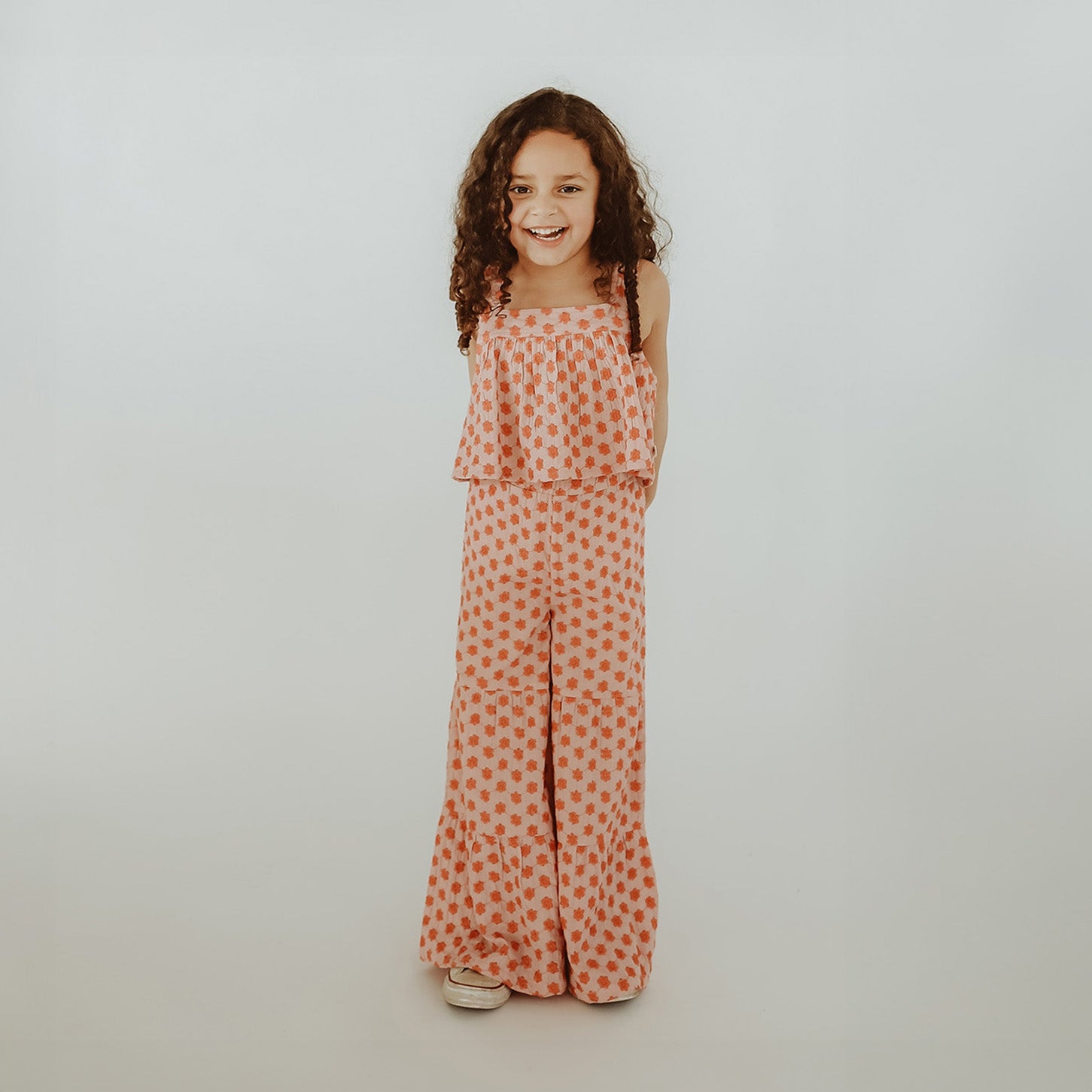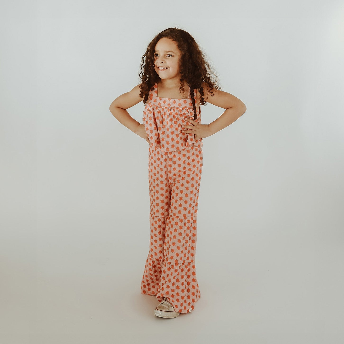 Let your child make a statement with the Peggy cropped top, available from size 110 to 140. The top is made of 100% cotton and has an all-over floral print embroidered on the cotton. This gives it a playful 3D effect, but it also ensures that the print does not fade with washing or wear. The Peggy top is a cropped top fit, meaning it is slightly shorter than a regular top. However, if you wear high waisted pants underneath, like the Jasmin wide leg pants, you won't notice at all that the top is shorter! Does your child not mind showing a little belly? Combine the Peggy cropped top with the Dacia flared jeans for a more rugged look.