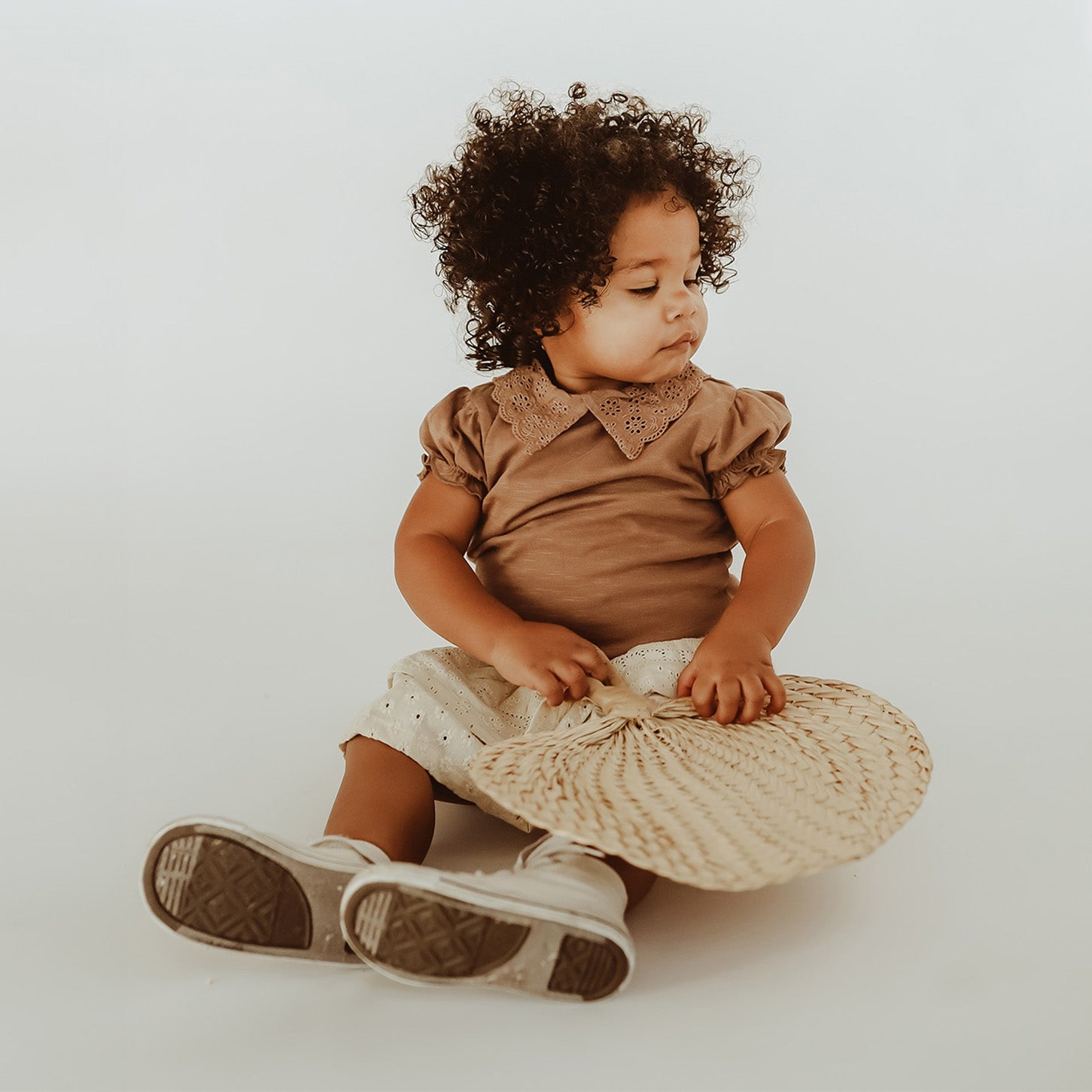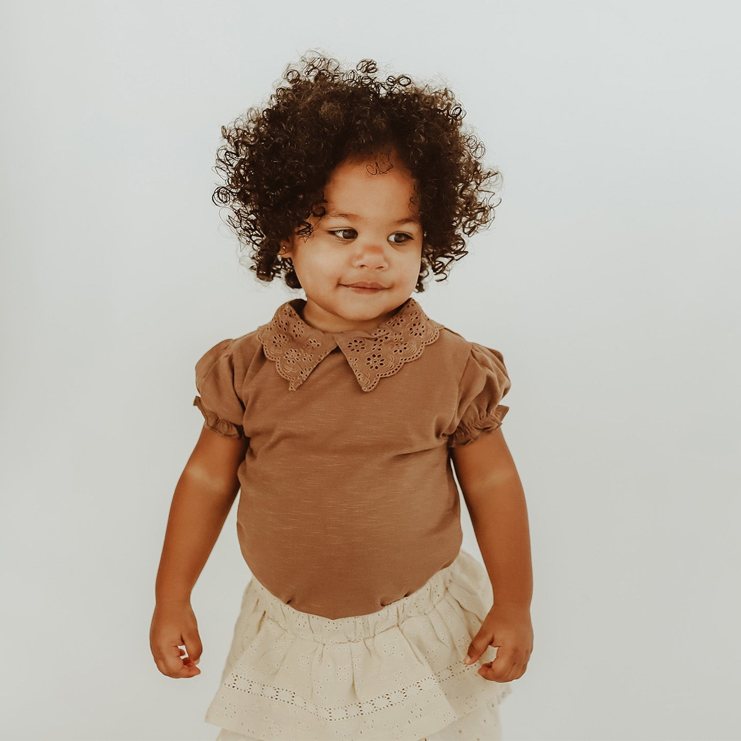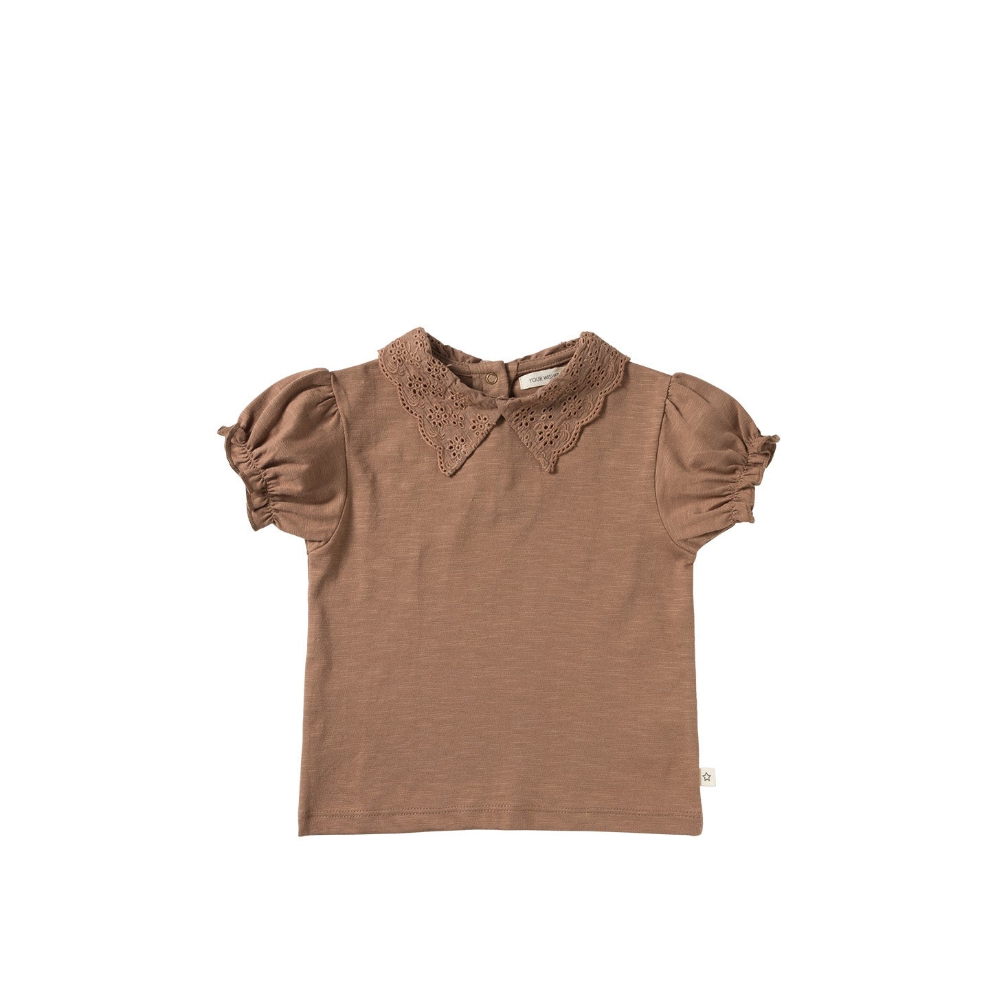 Spice up the outfit with the Priscil T-shirt, available from size 80 to 140. This shirt is made of a soft and stretchy fabric, which incorporates a very subtle texture for a playful effect. The most striking feature of the Priscil T-shirt is of course the lace collar, finished with embroidered details. The ends of the shirt's sleeves are elasticized, creating a puffy sleeve. In addition, the hole of the neckline can easily be made larger by the snaps on the back of the shirt. This makes the Priscil T-shirt go on easily over the head and keeps the collar nice for the longest time. Not sure how to pair this shirt? We've got you! We think the Priscil T-shirt is a very cute match with the Jolene denim skirt or the Mitzi skirt!