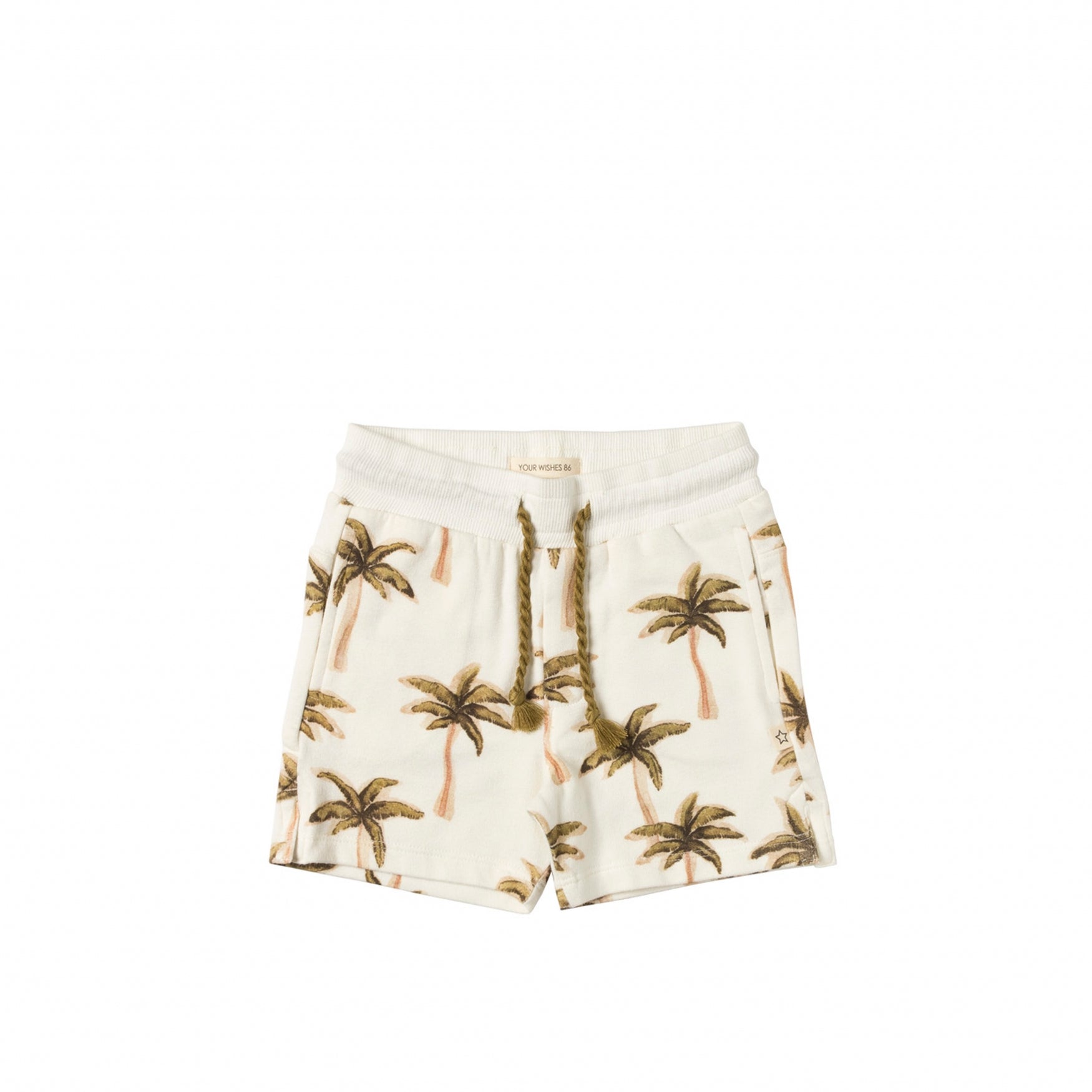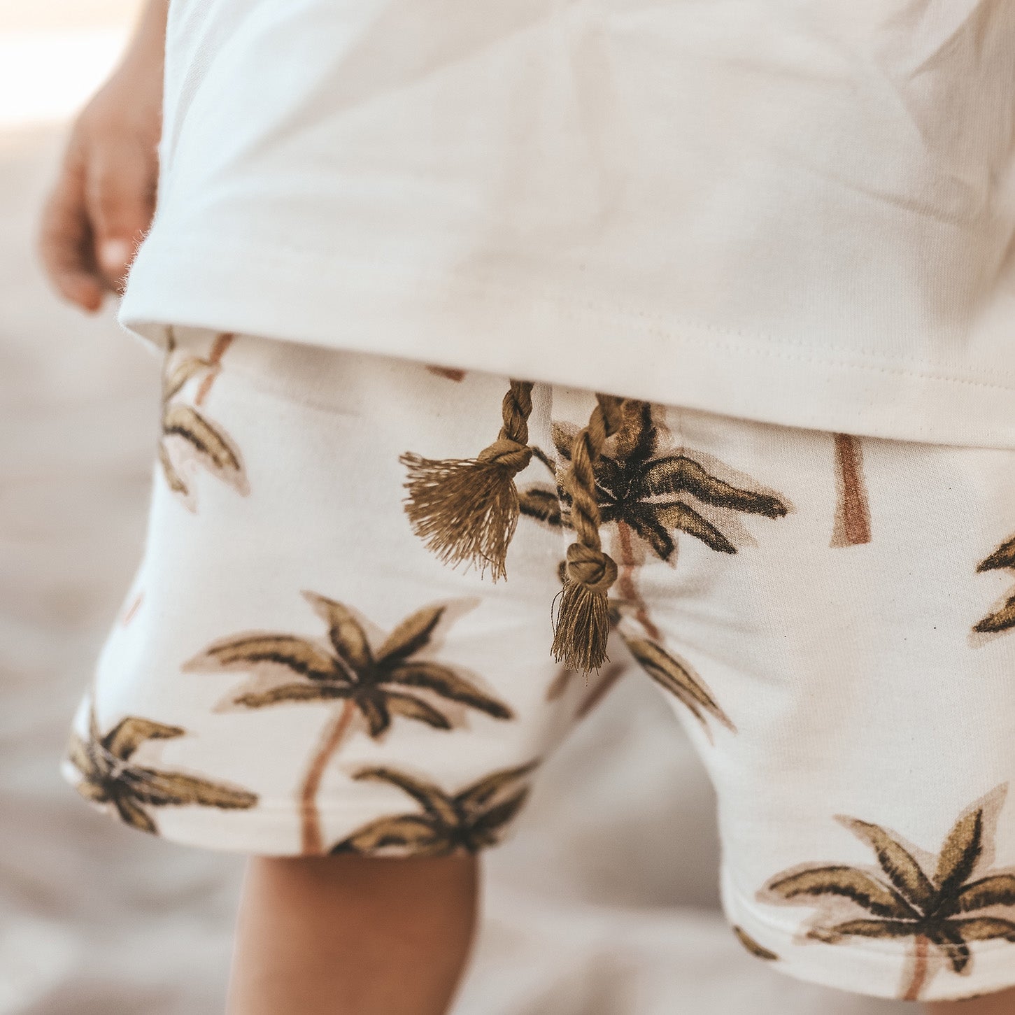Time for palmtrees and sunsets with the Ross short, available from size 80 to 140. The short is made of a combination of cotton and elastane and has an elastic waistband with extra drawstring. This ensures the Ross shorts always have the ideal fit! There is a small slit at the bottom of the legs, giving your little one more room to move around in the shorts. The Ross shorts also have two side pockets and two back pockets. The palm tree print makes these shorts an ideal addition to your child's summer wardrobe, especially when combined with the Ezra T-shirt!