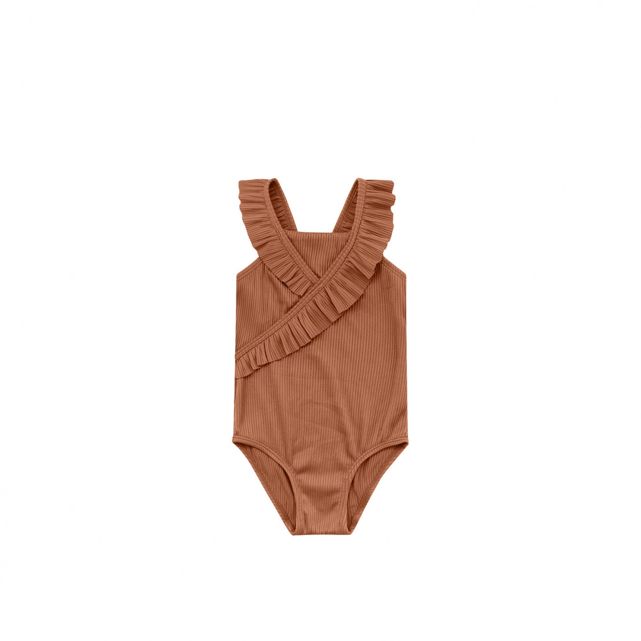 Endless water and play fun in the cutest swimwear! This swimsuit has a perfect fit and is made of a nice quality with lining, so it does not show through. The swimsuit has a summery brown color with a fine rib. The model features a front flounce which continues along the shoulder straps to the back.
