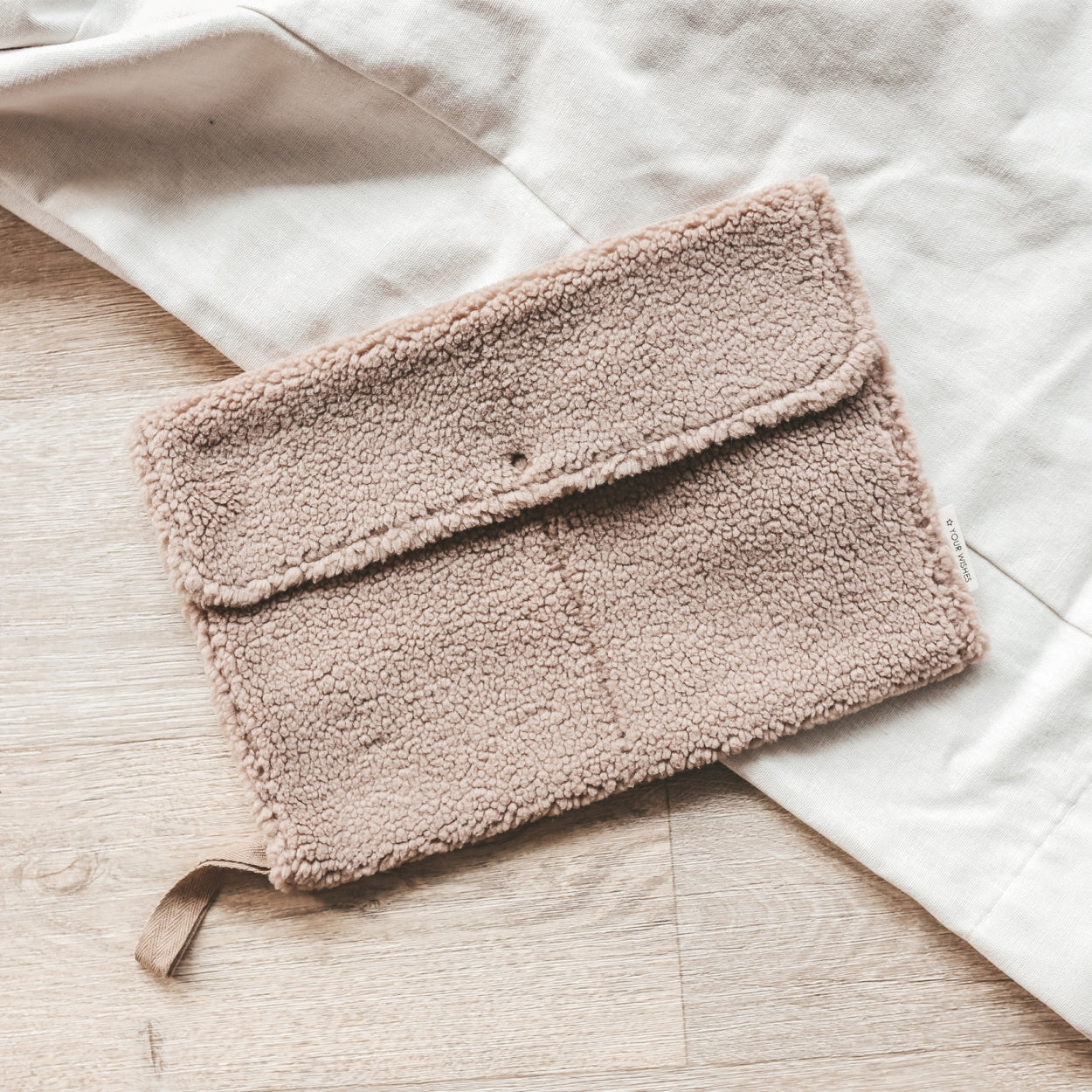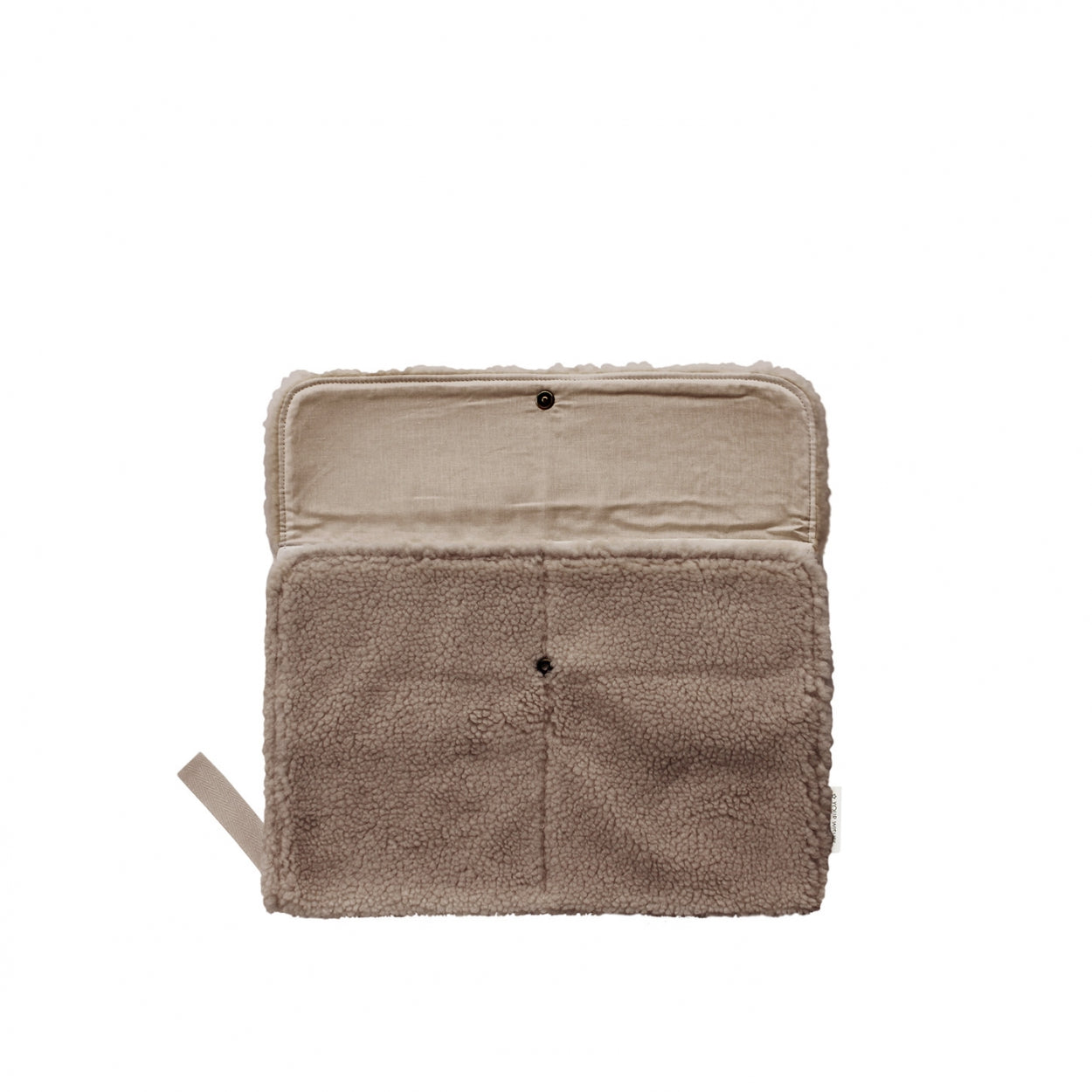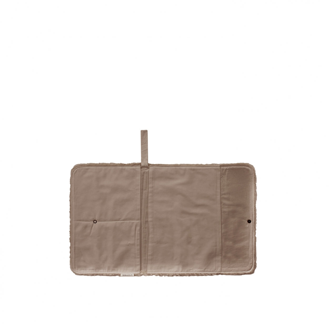 This diaper pouch made of teddy fabric is handy on the go to carry your diapers and wipes. The diaper pouch is foldable and closes with a press stud on the front.