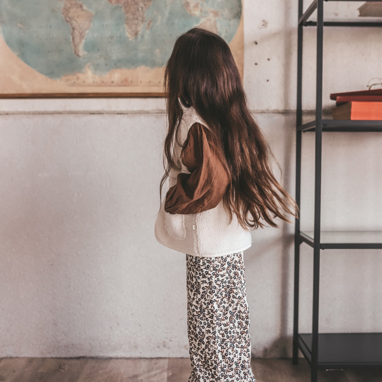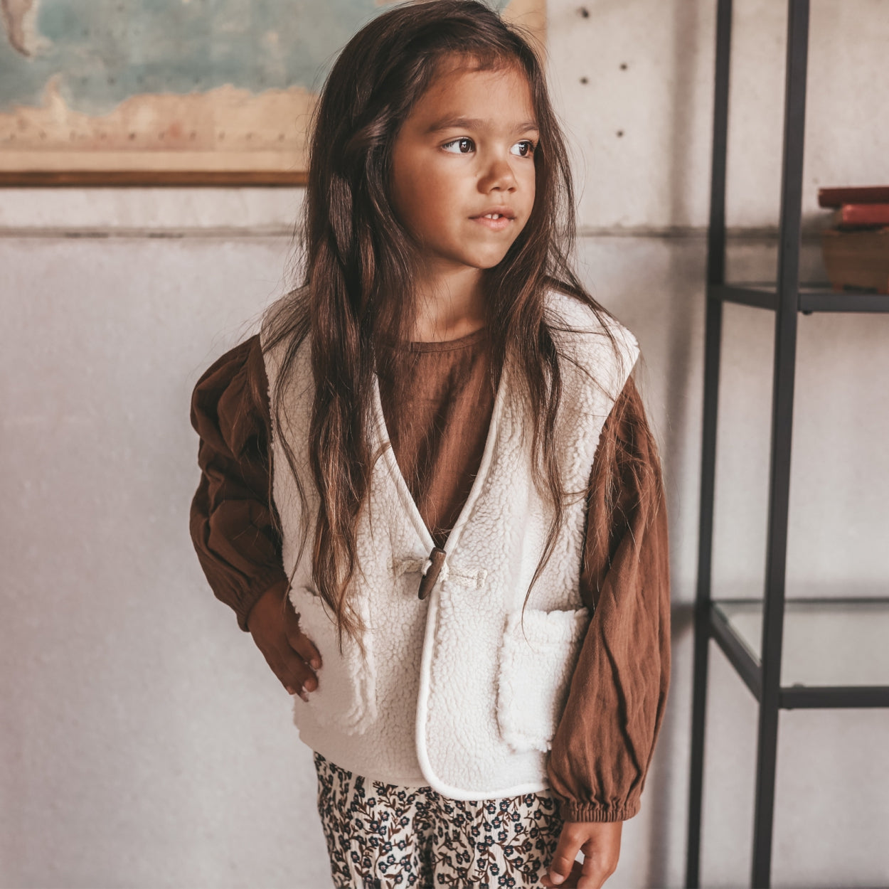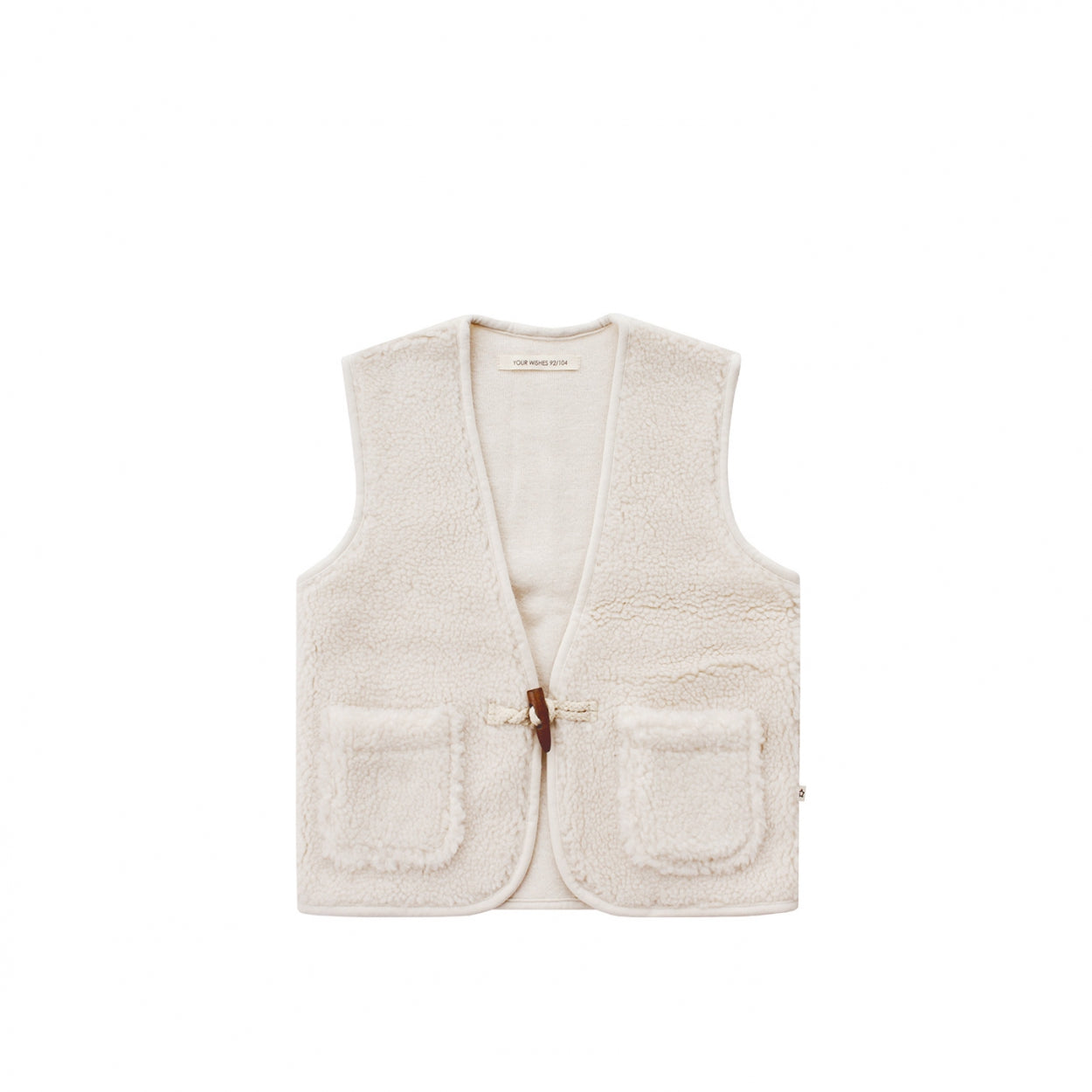 This teddy gilet is easy to match with any outfit. The vest has a unisex design and features a wood string closure on the front.